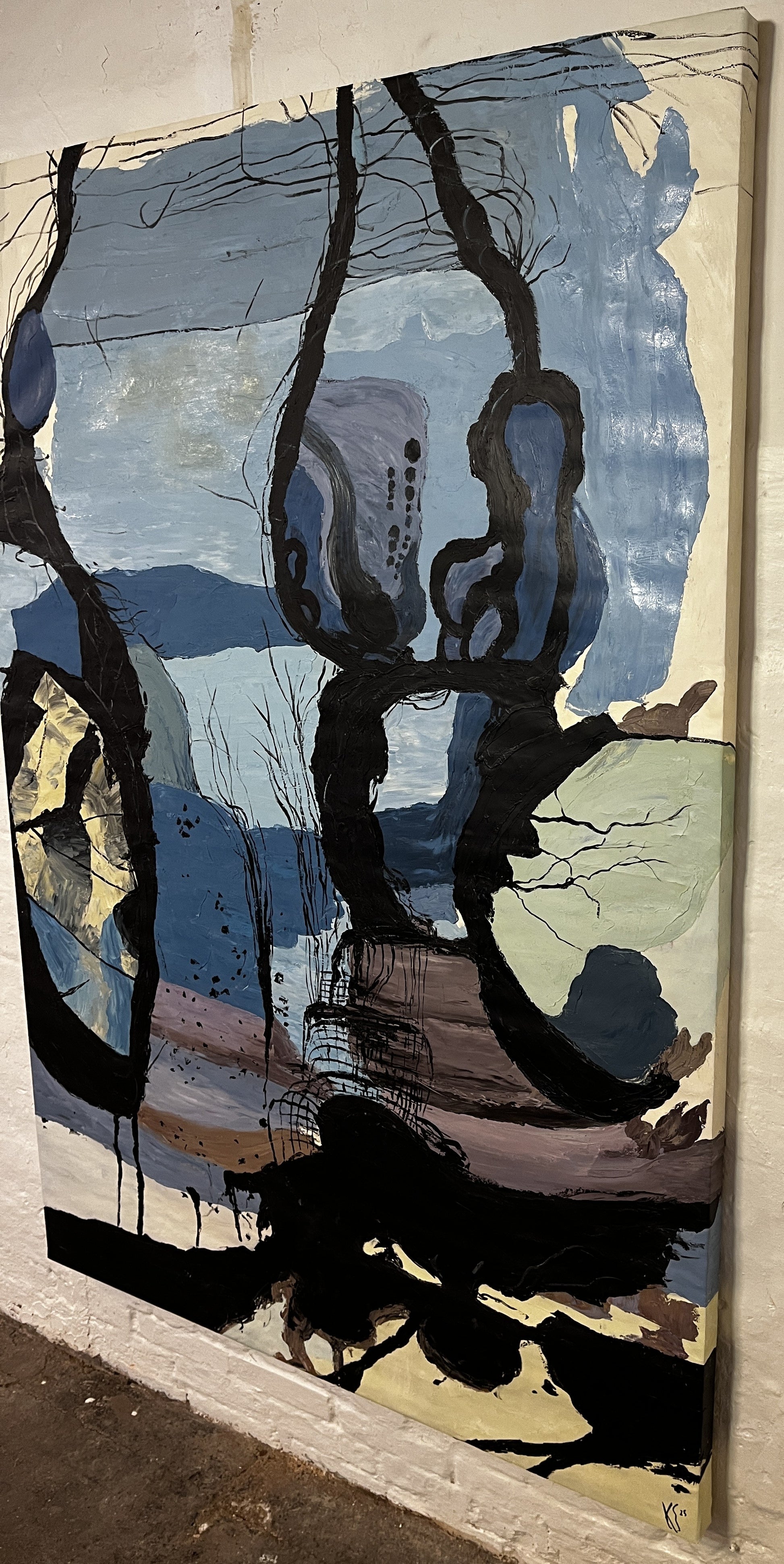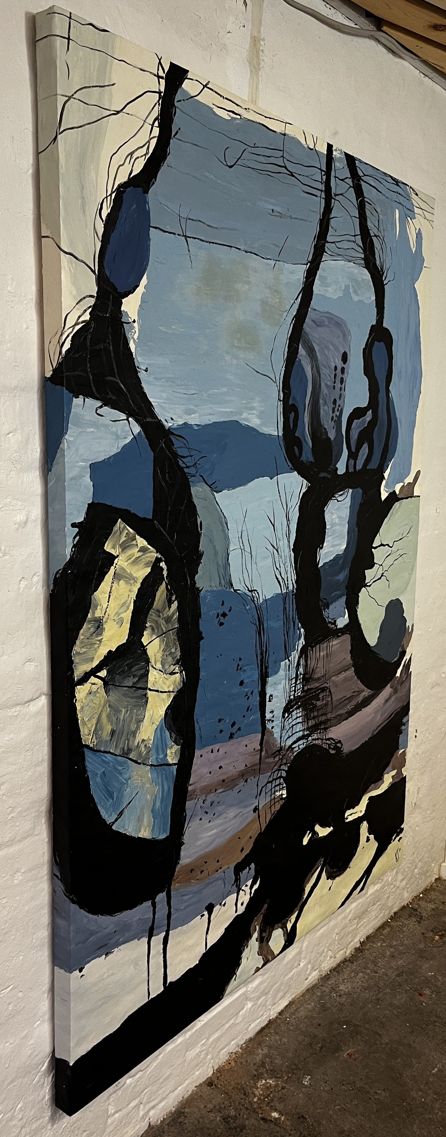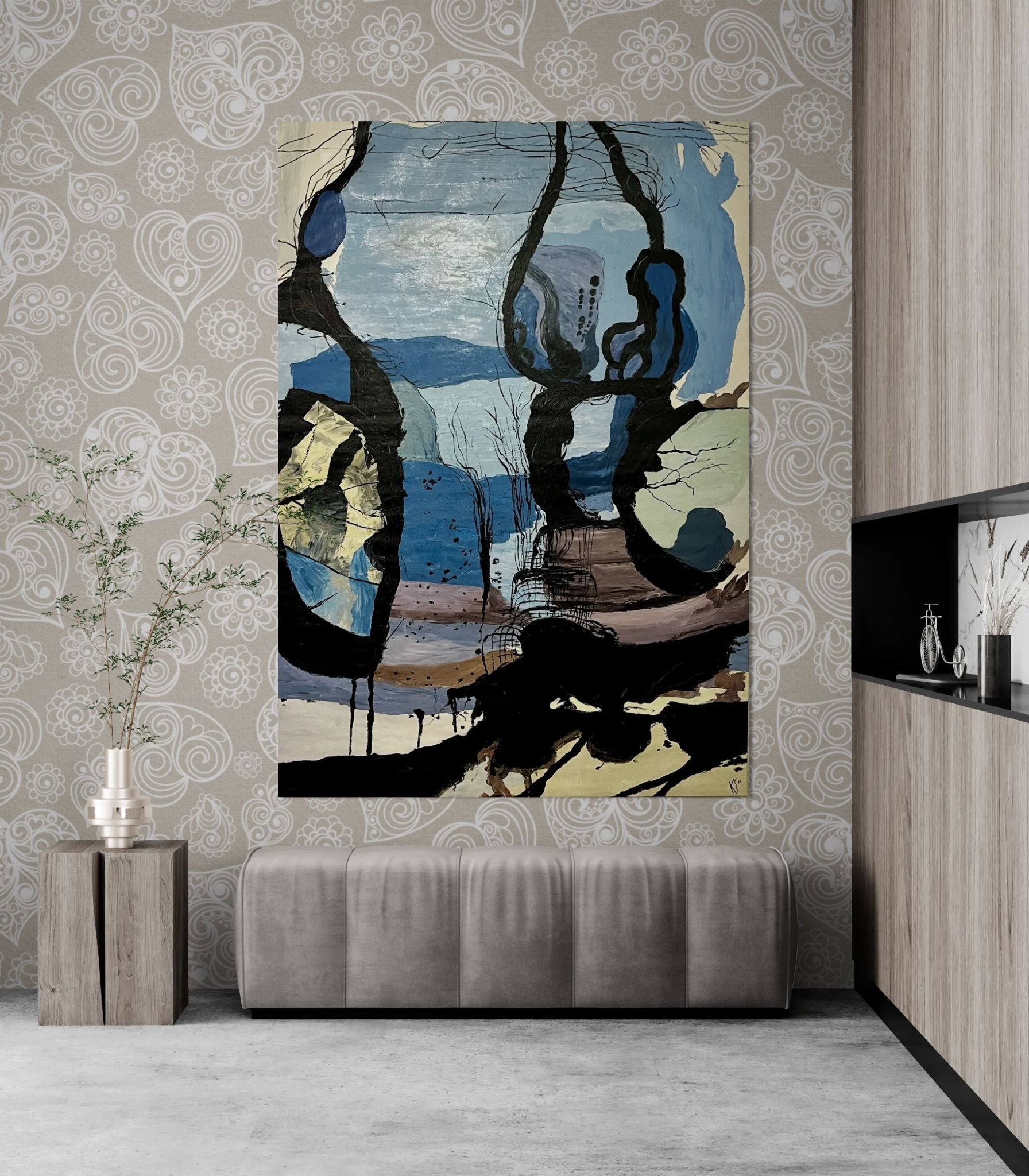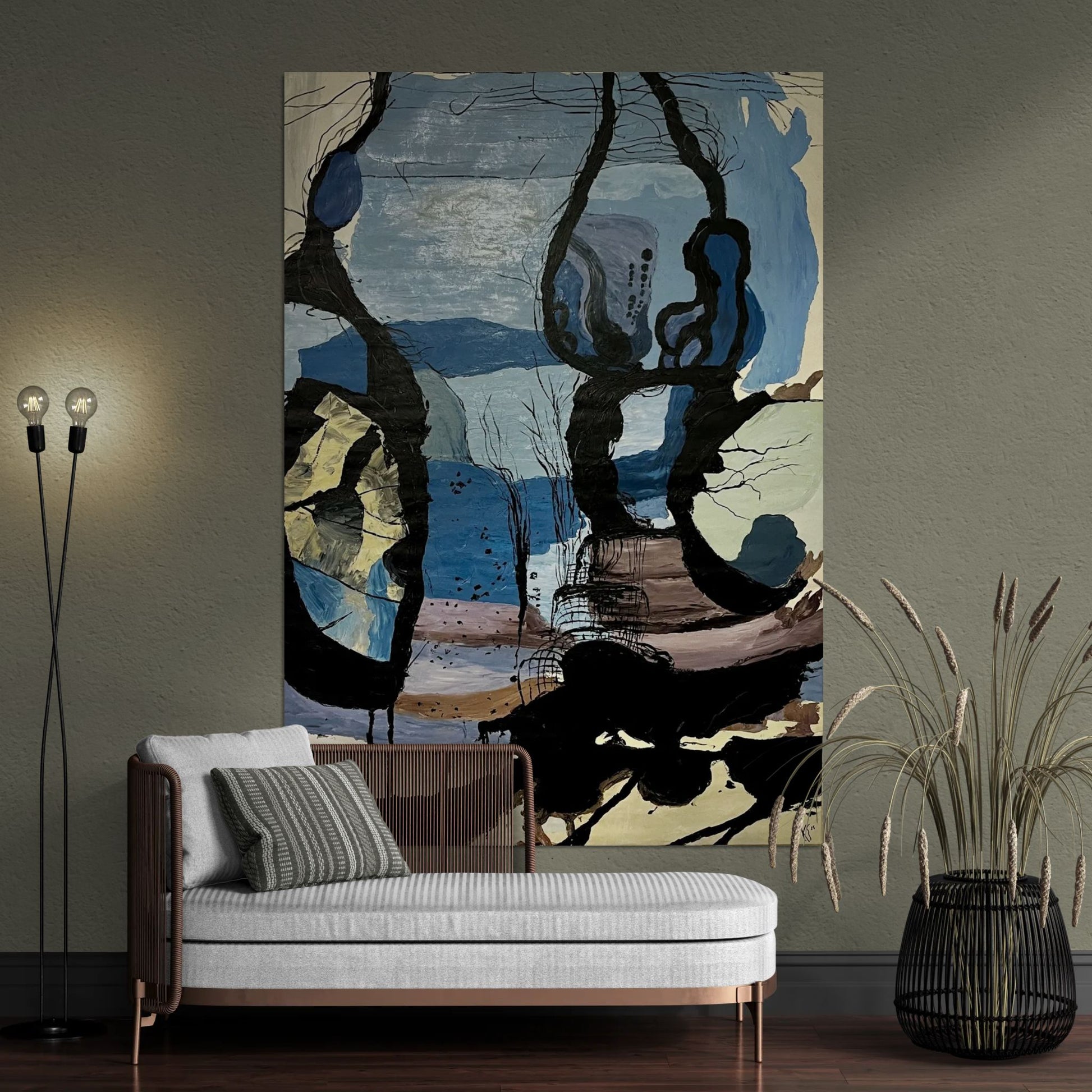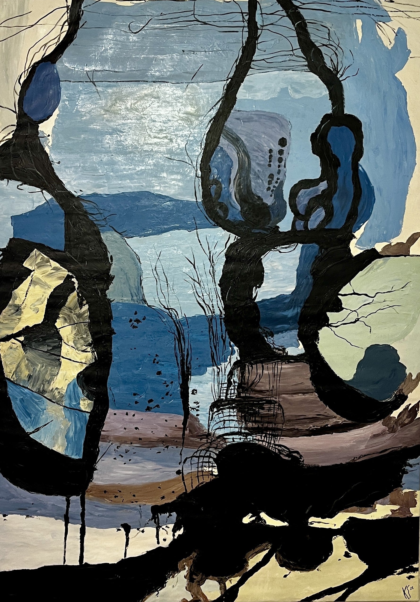 Dieses Werk wird von Wiederholungen und organischen Formen dominiert, die wie Wellenringe oder Echos erscheinen, die sich selbst vervielfachen. Die blauen Flächen bilden einen kühlen Hintergrund, während die schwarzen Konturen die Komposition wie ein Rahmen zusammenhalten.