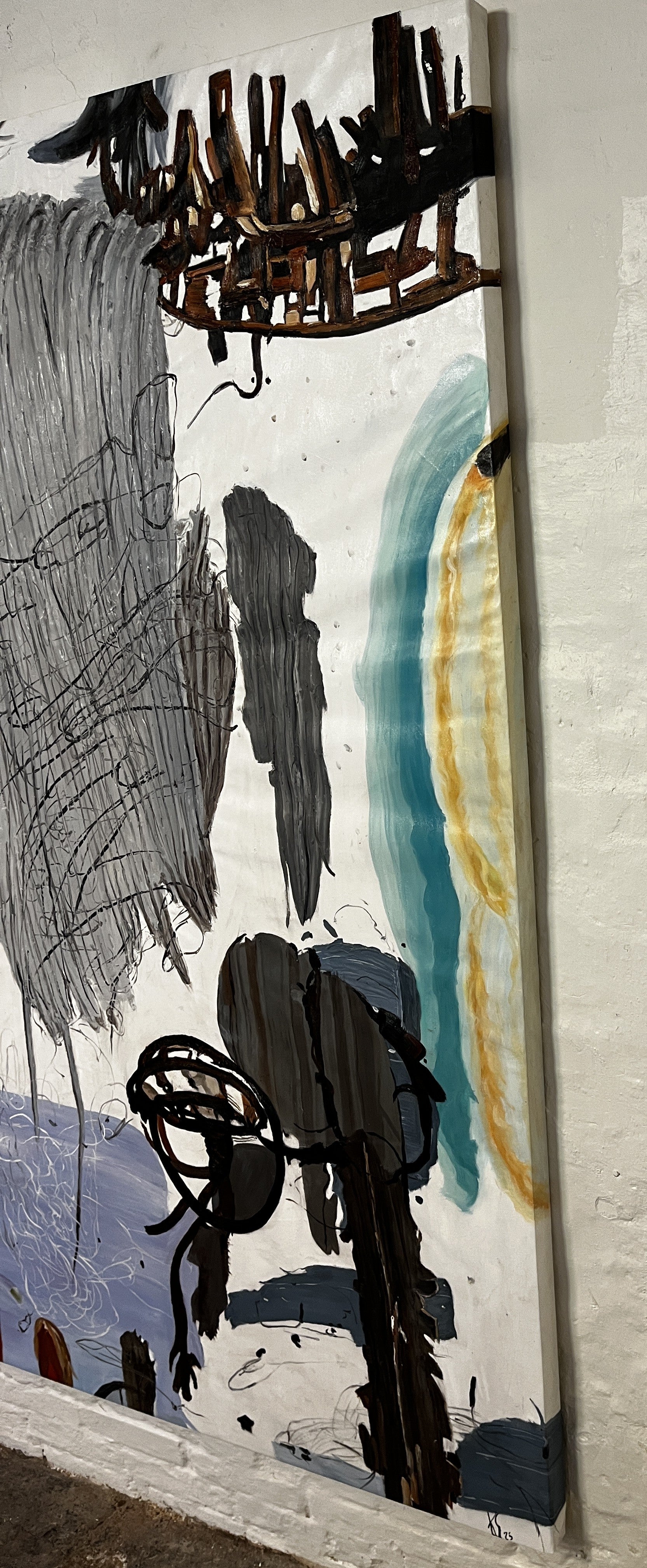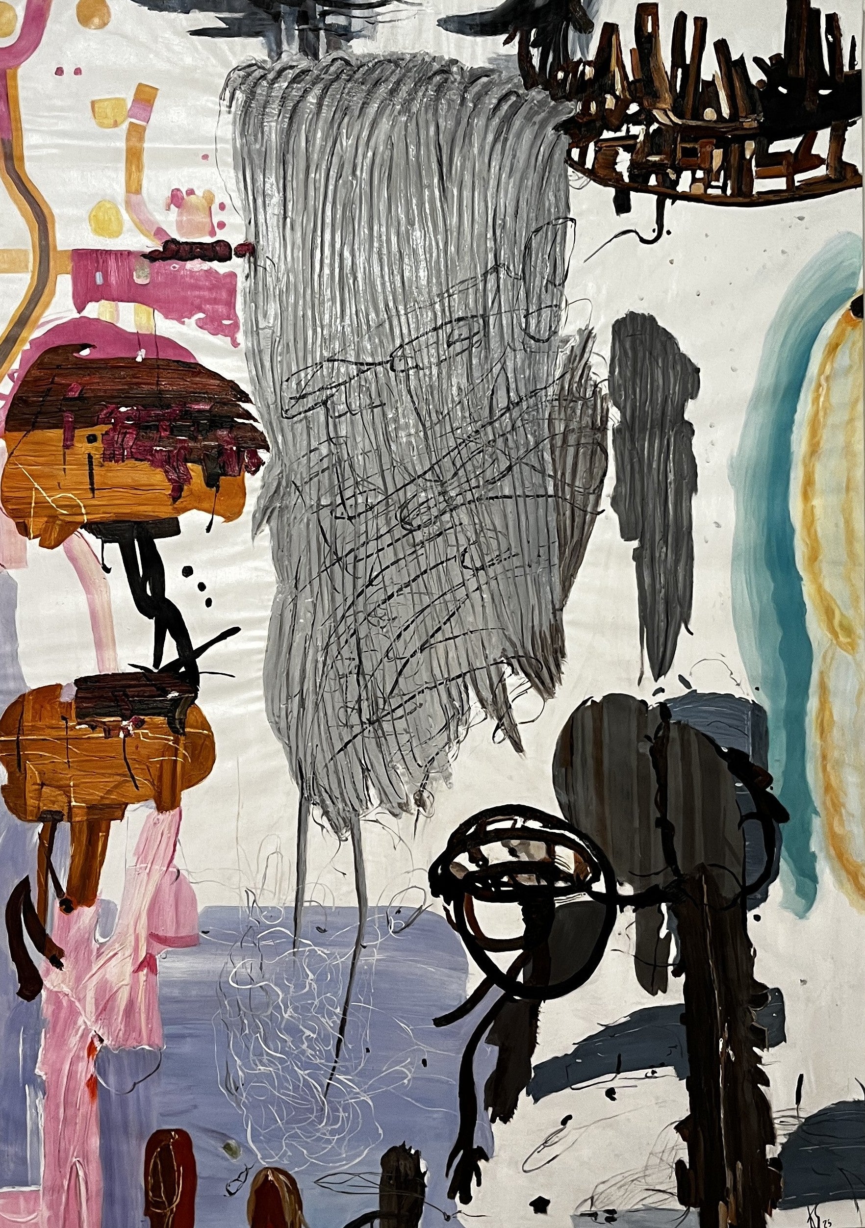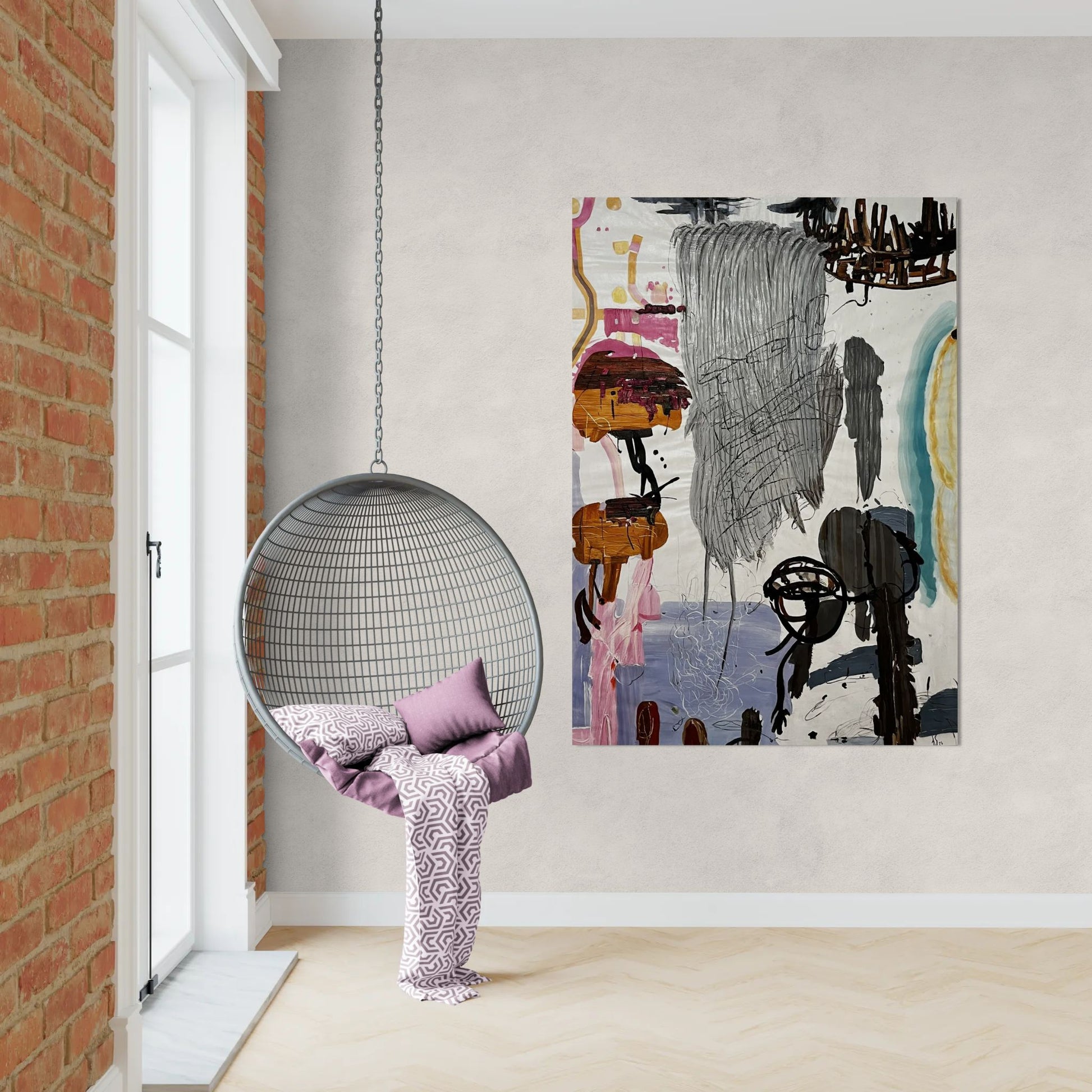Hier erscheint das Werk als eine Sammlung unvollendeter Spuren und Fragmente. Rosa, Orange und Grautöne erzeugen einen vielschichtigen Ausdruck, bei dem die Linien roh und fast skizzenhaft wirken. Man spürt eine Energie, die sich nicht zähmen lässt – als würde das Bild sich weigern, sich auf eine eindeutige Erzählung festzulegen.