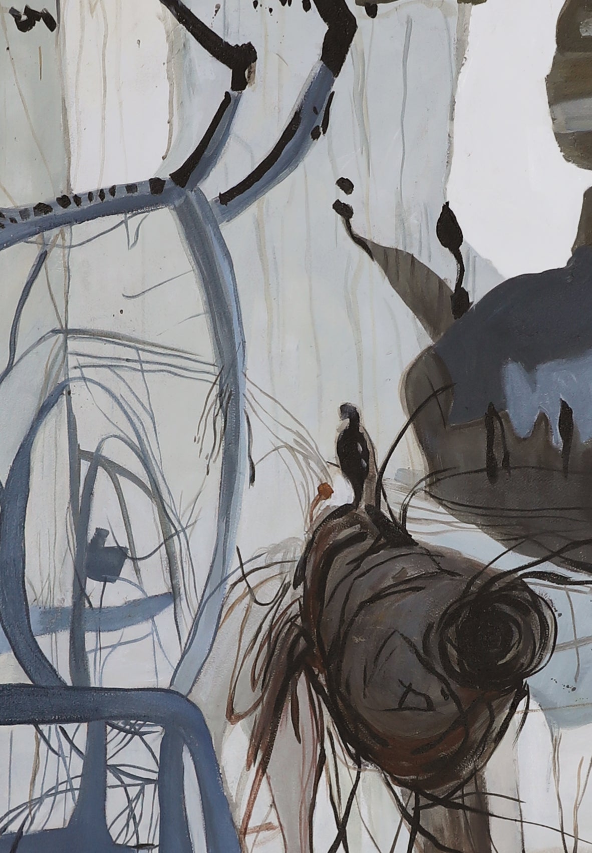 Gleichzeitig treten figürliche Elemente hervor – etwas, das wie Vögel oder organische Wesen wirkt. Das Gemälde vereint Leben und Abwesenheit, wie eine Meditation über Leere und Präsenz.