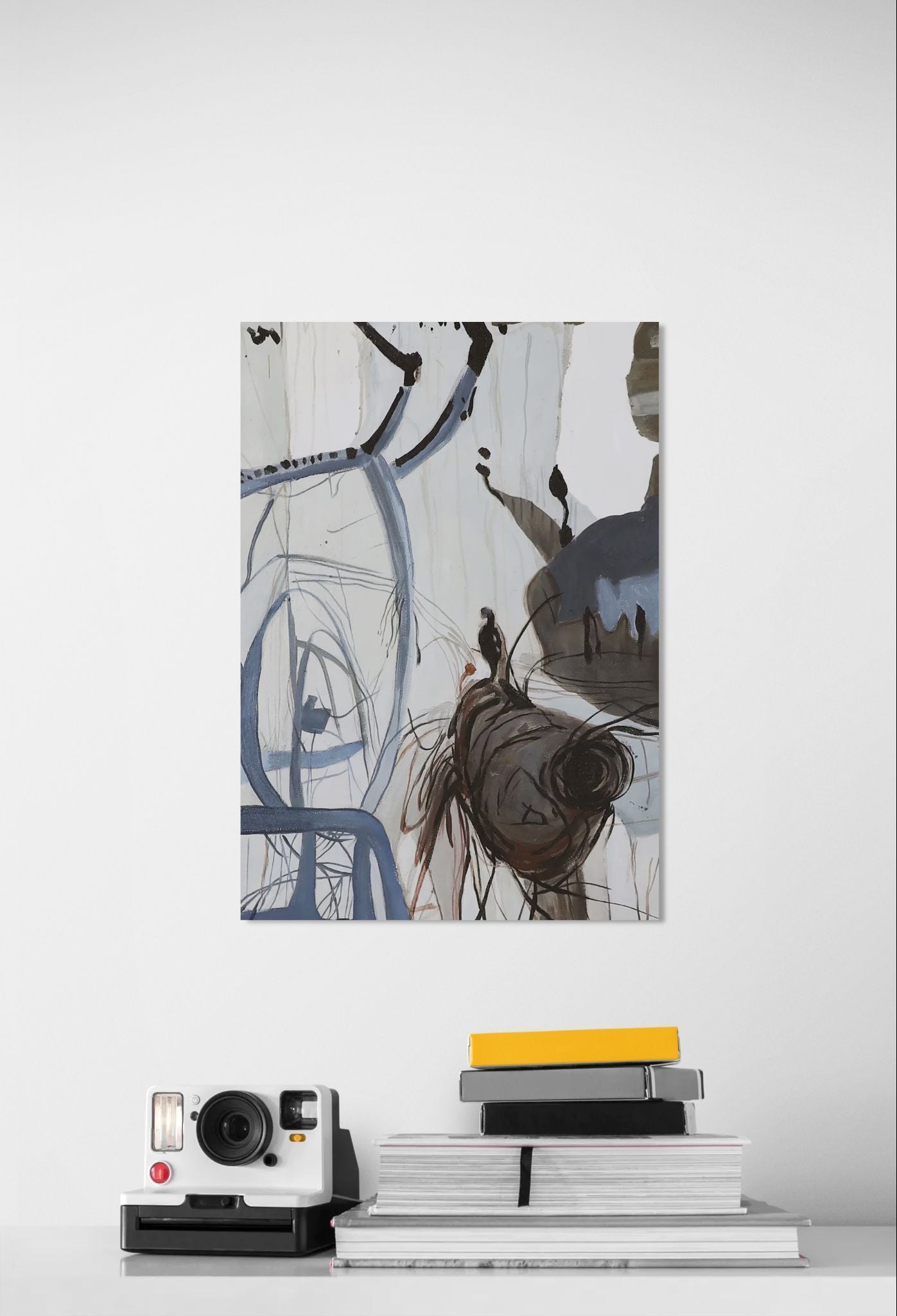 Dieses Werk zieht uns in eine kühle, fast industrielle Welt hinein. Blaue und graue Strukturen erinnern an Architektur oder skelettartige Konstruktionen, als befänden wir uns in einer unfertigen Landschaft. Feine Linien und Kringel bilden ein Netz aus Verbindungen – fast wie Nerven oder Wurzeln, die alles zusammenhalten.