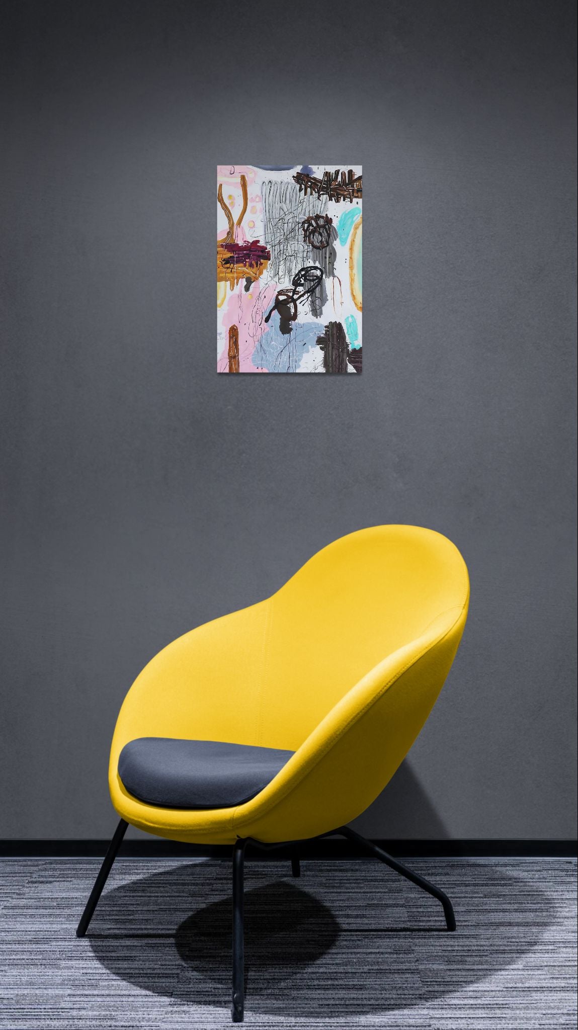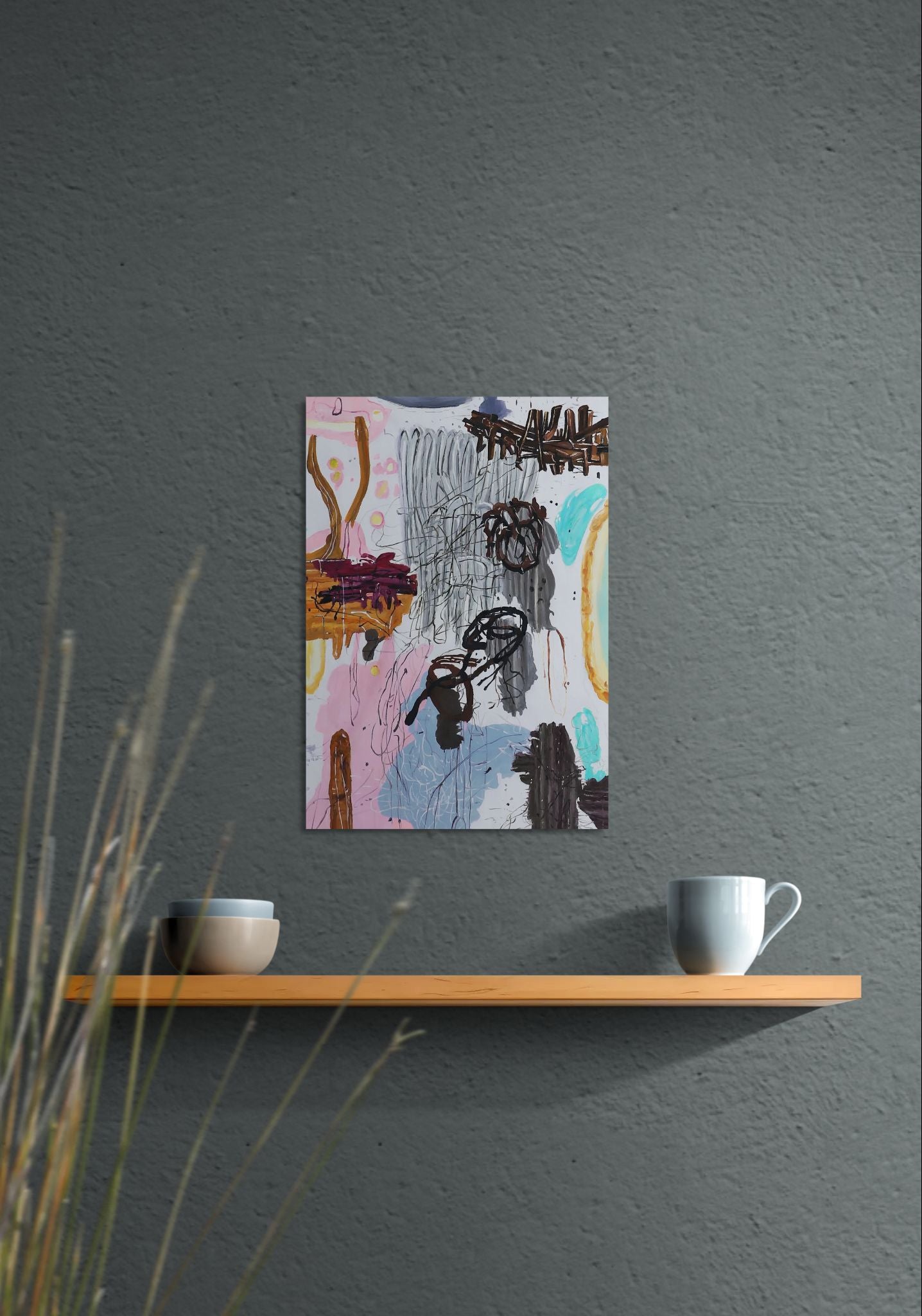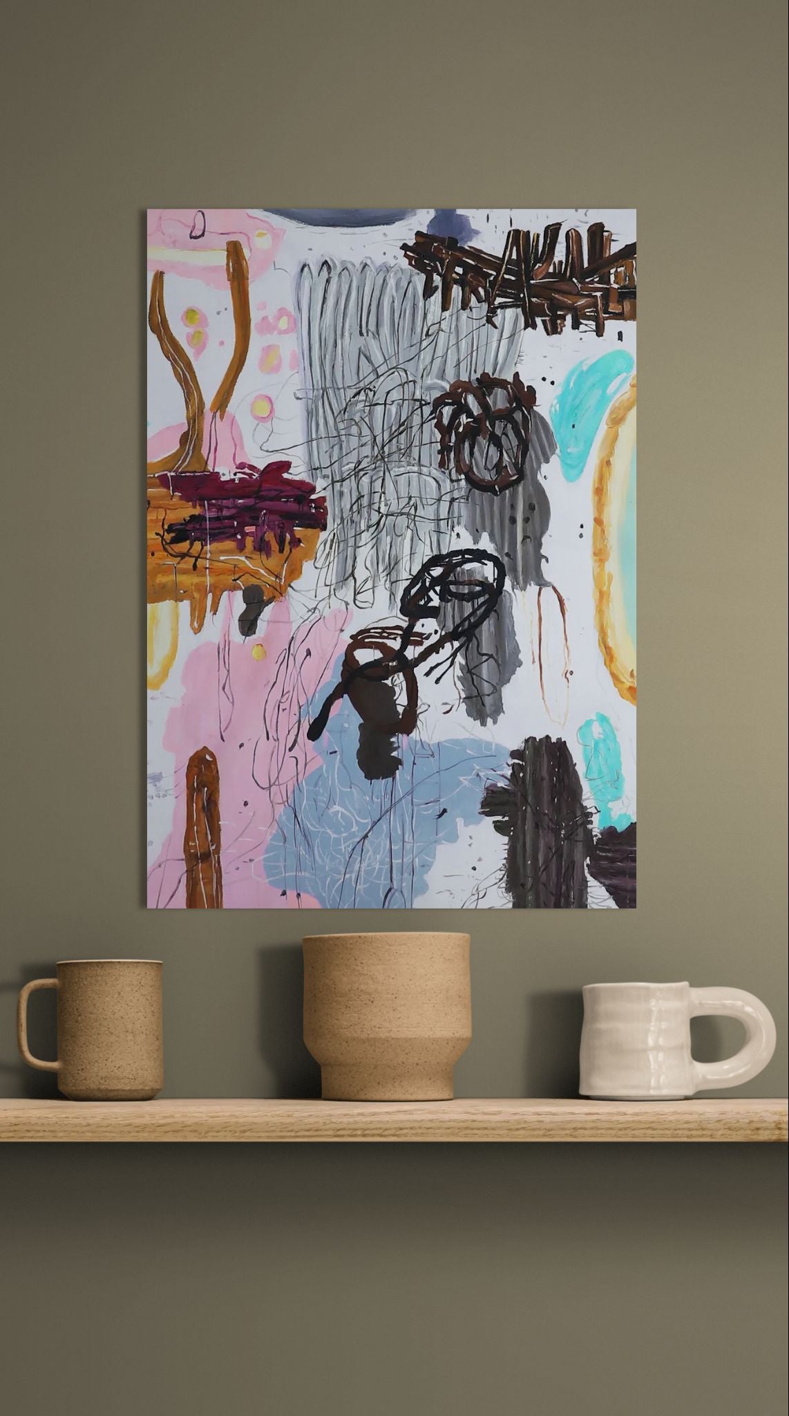 In diesem Werk begegnen wir einer rohen und intuitiven Energie, in der dicke Linien und spontane Kritzeleien einen chaotischen, aber dennoch poetischen Raum schaffen. Die Farben wechseln zwischen sanften Pastelltönen und scharfen Kontrasten in Dunkelbraun und Grau – als wäre das innere Gefühlsleben Schicht für Schicht kartiert. Organische Formen erinnern an Körperteile, Gesichter und Schatten, doch nichts ist vollständig erkennbar – alles fließt ineinander.