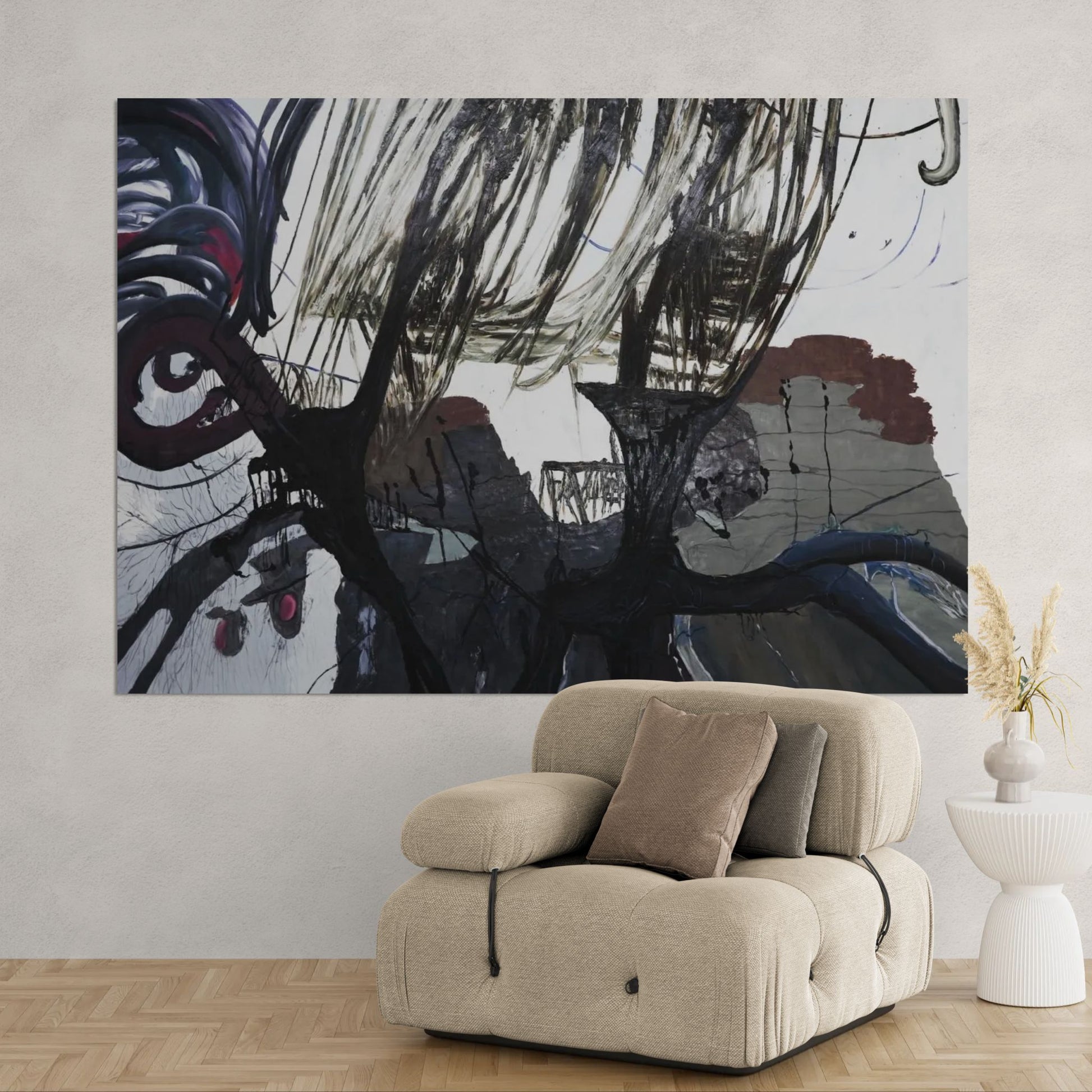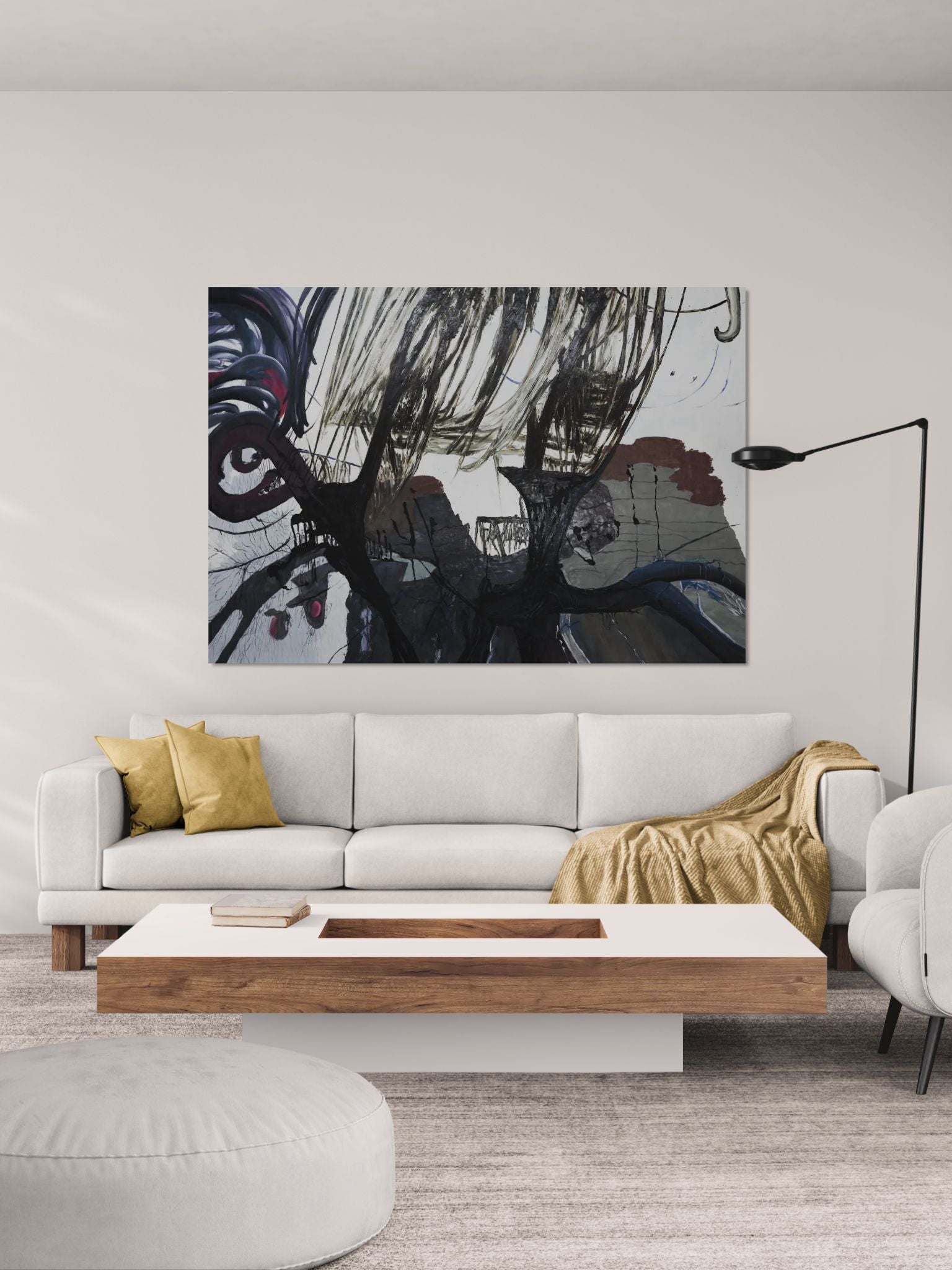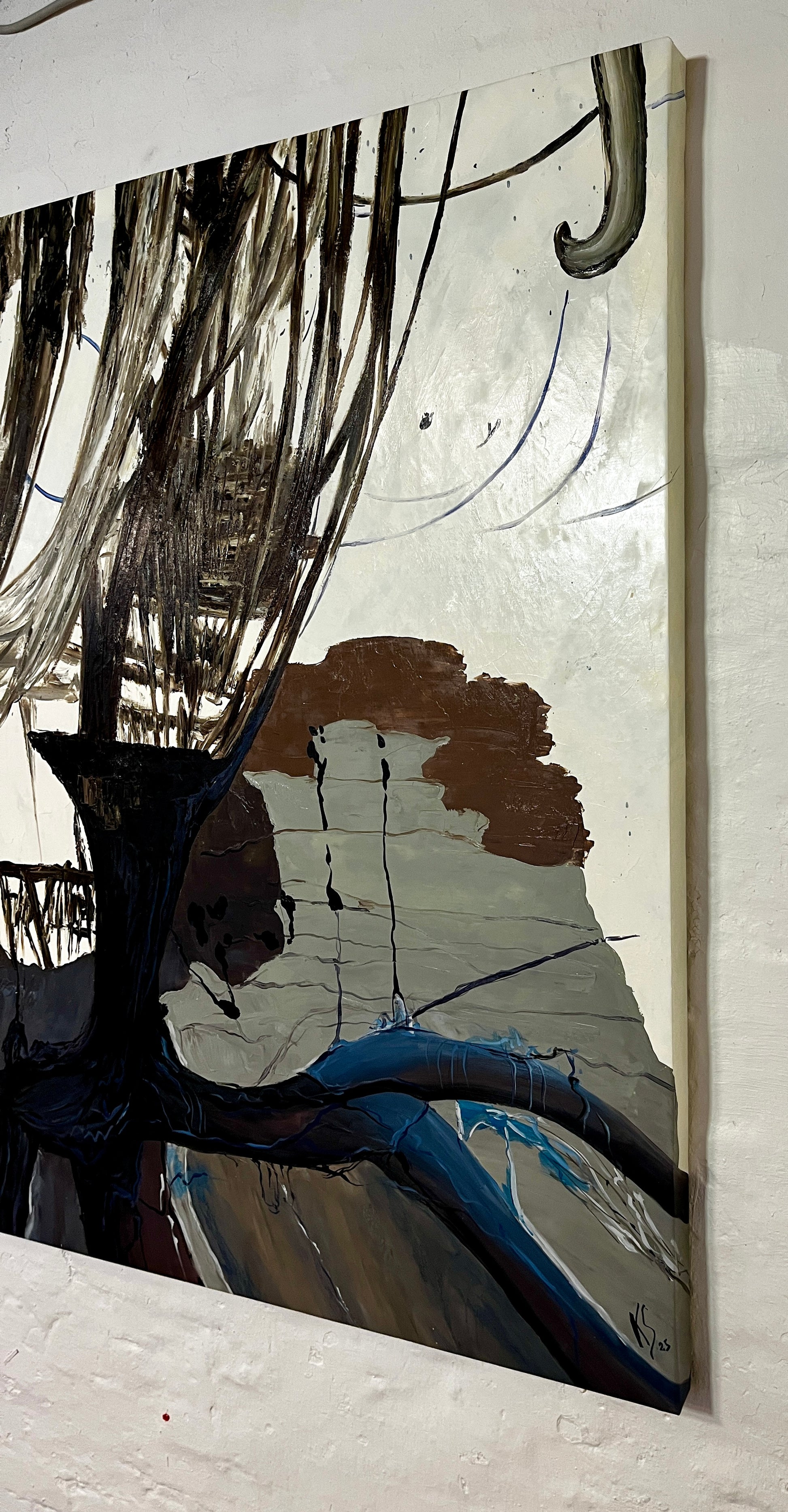 Dieses Werk balanciert zwischen Hell und Dunkel, wobei die Pinselstriche einen dramatischen Kontrast zwischen schweren schwarzen Flächen und transparenten, fast flüchtigen Linien erzeugen. Die Komposition ruft ein Gefühl inneren Chaos hervor, bei dem die Energie sowohl zum Boden hinzieht als sich auch in der Luft aufzulösen scheint.
