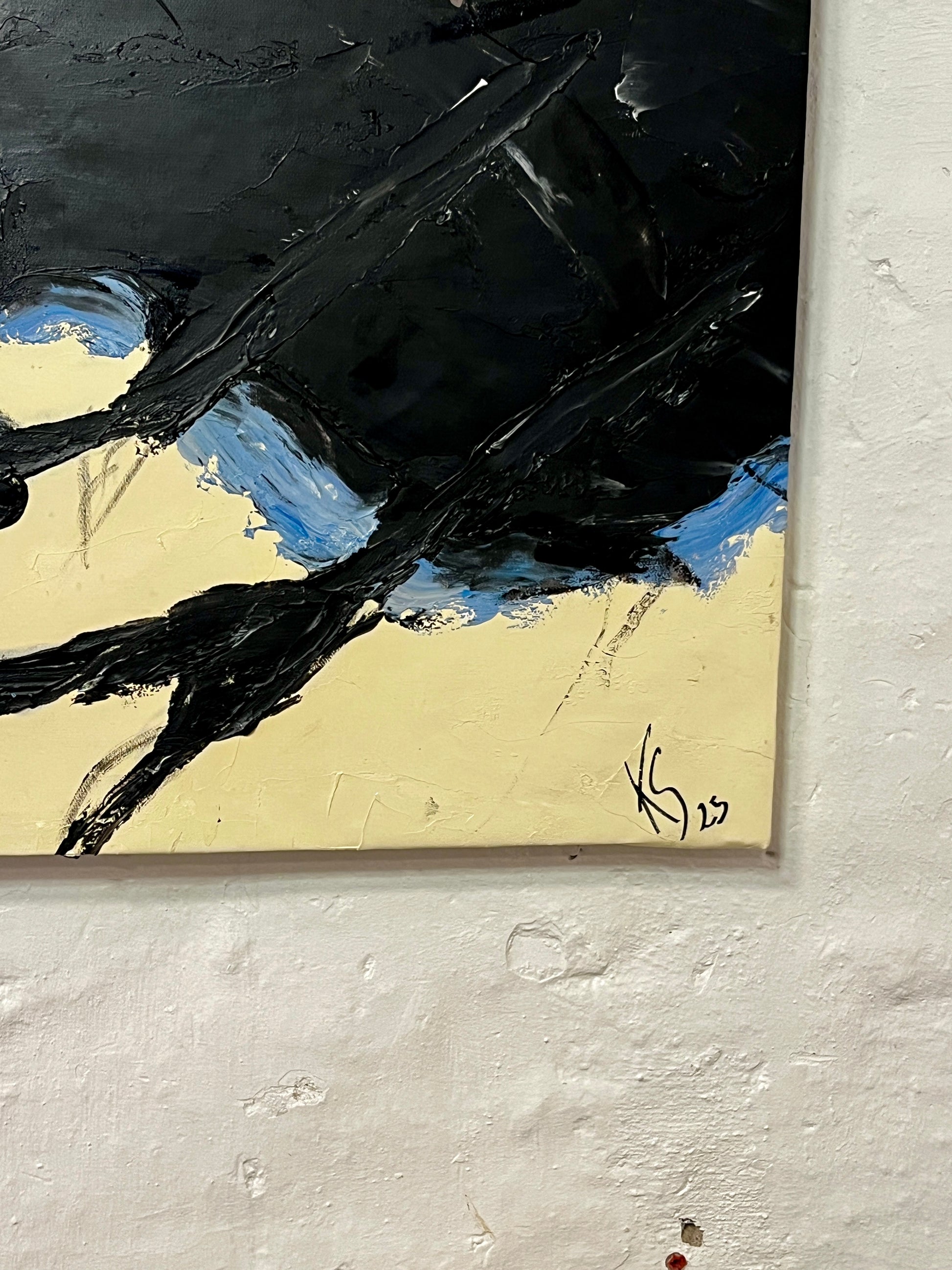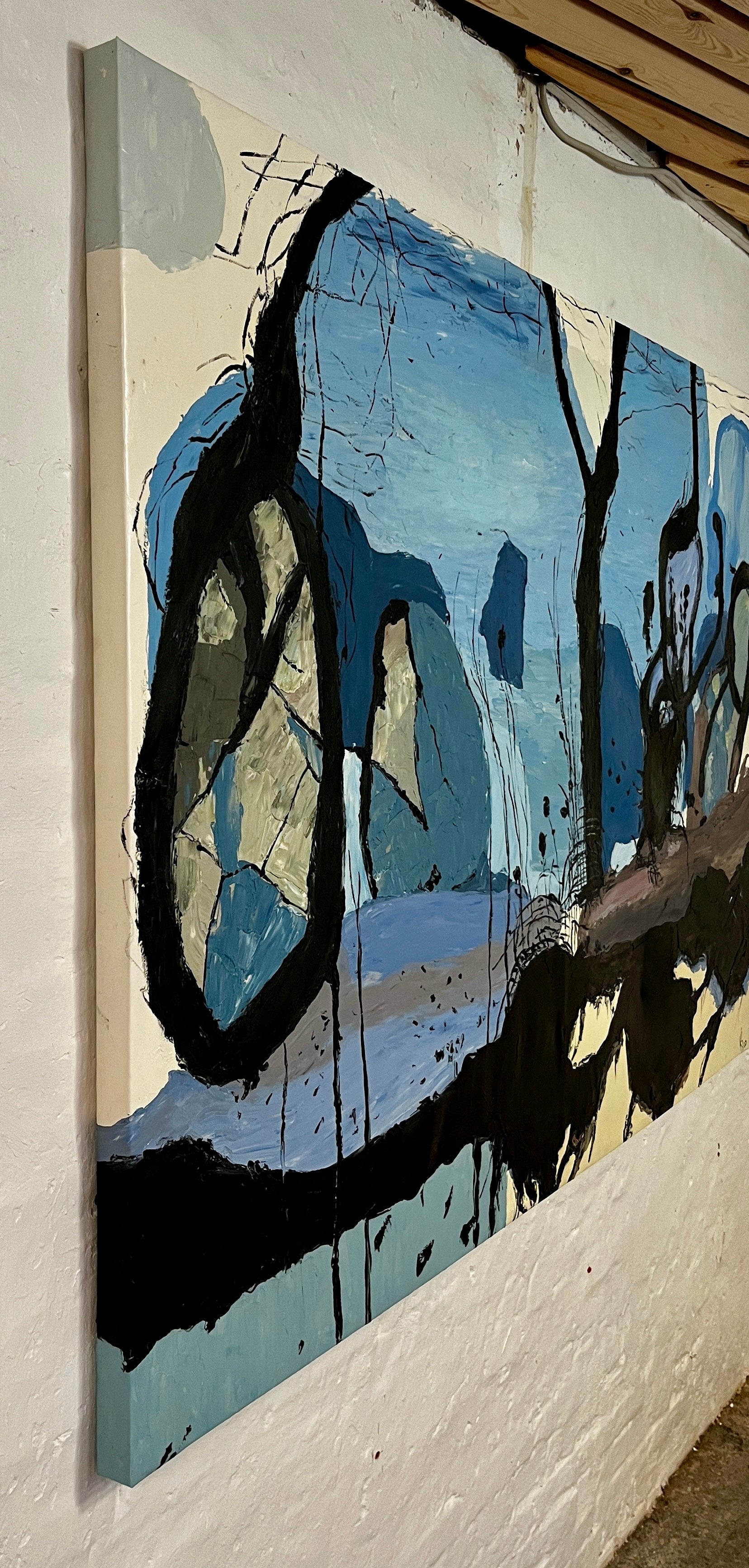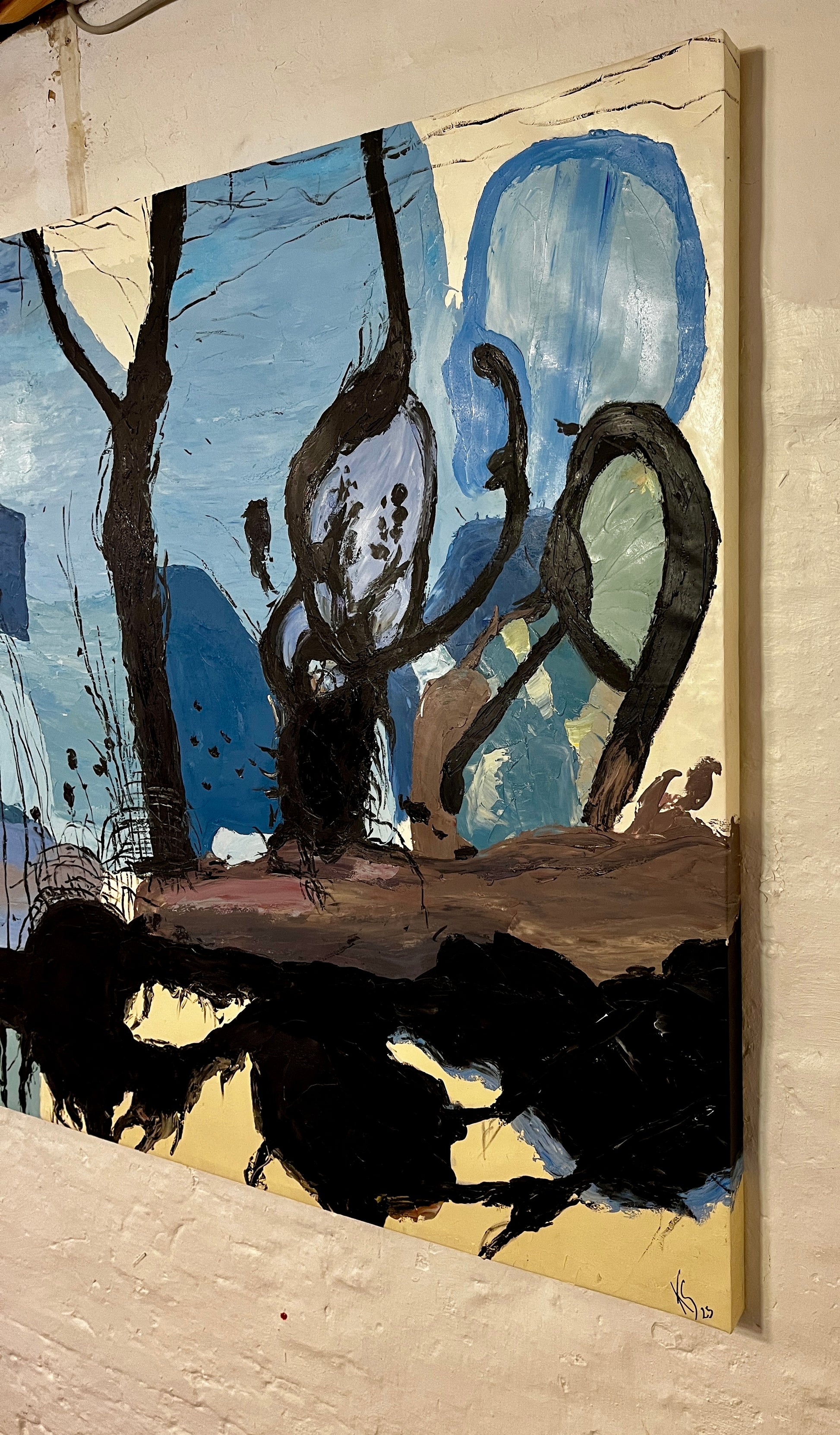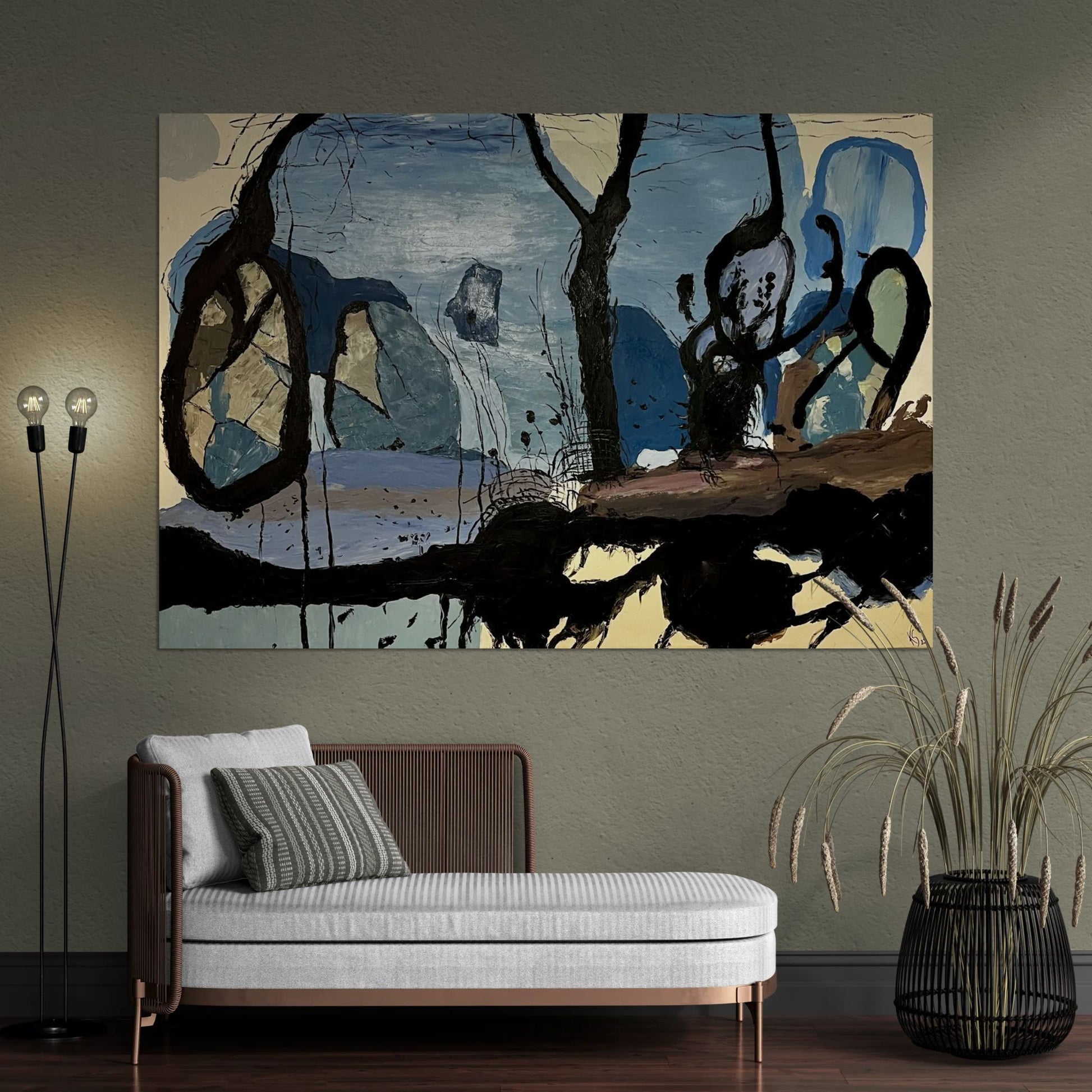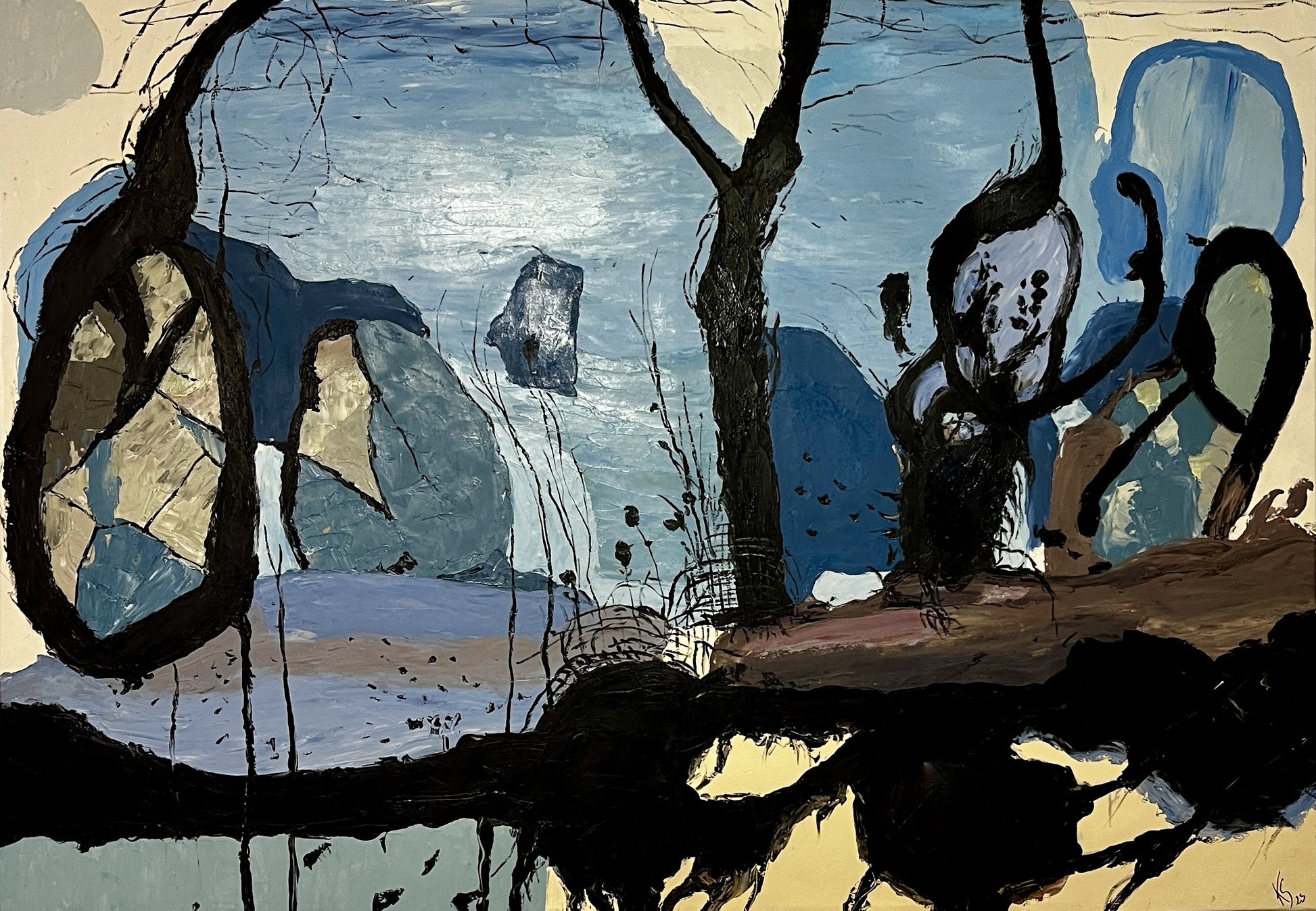 Hier begegnen wir einem fast traumartigen Universum, in dem verschiedene Blautöne eine rhythmische Bewegung über die Bildfläche bilden. Schwarze, organische Linien durchbrechen die Flächen und erinnern an Baumwurzeln oder Adern, die Leben in eine sonst stille Landschaft bringen.