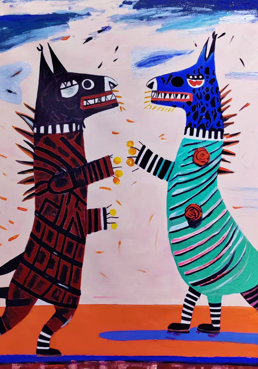 Zwei wolfsähnliche Wesen stehen sich gegenüber und tauschen kleine gelbe Kreise aus – Münzen, Samen oder magische Symbole. Ihre Körper sind mit Mustern und Streifen bedeckt, und ihre Augen leuchten vor Intensität. Der Hintergrund mit hellen Wolken und verstreuten Pinselstrichen verleiht der Szene zugleich Leichtigkeit und Dramatik.