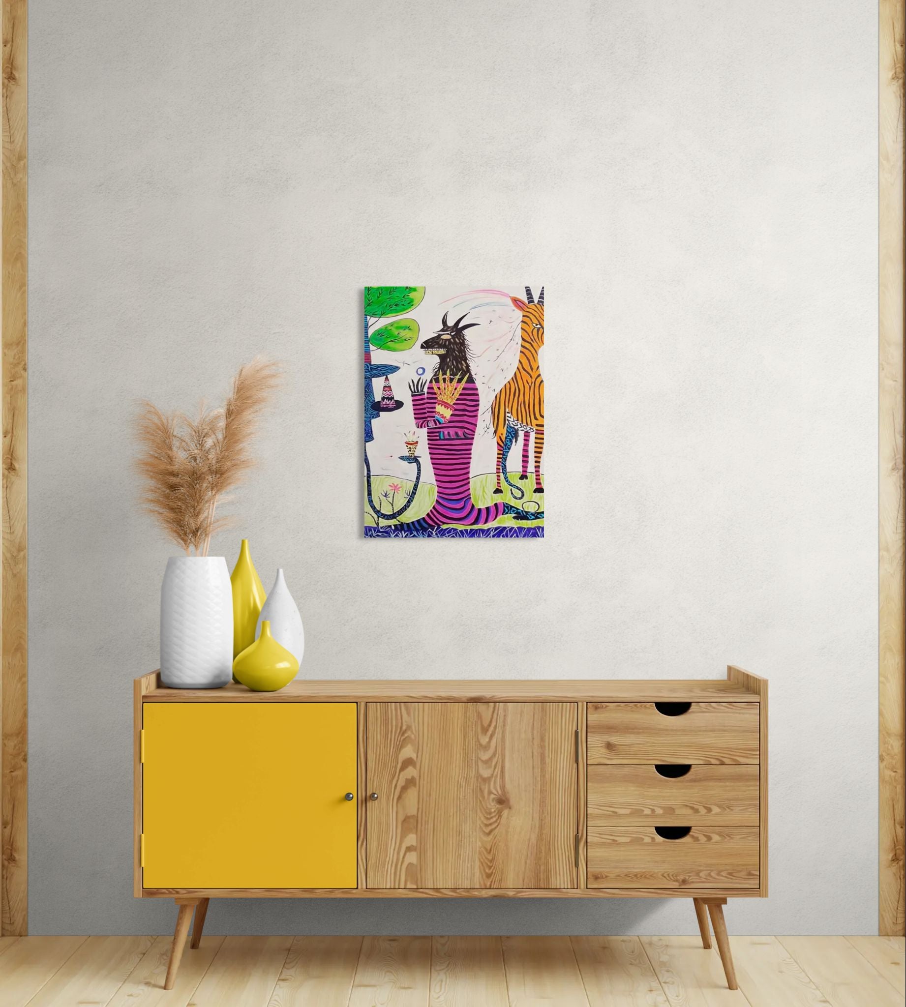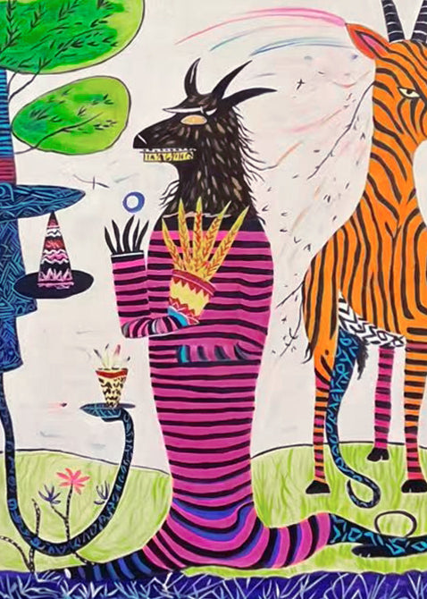 Ein mythisches Wesen, gekleidet in pink und schwarze Streifen, reicht Blumen dar, während es von anderen Tieren – einem Zebra, einem Baum und einer seltsamen Landschaft – umgeben ist. Die Figur wirkt zugleich wie ein Priester und ein Trickster, der an einer merkwürdigen Zeremonie teilnimmt, in der alles erlaubt ist. Blumen, Muster und Kreise füllen das Bild mit Leben und Rhythmus, und das Ganze wirkt wie ein Ritual, eingefangen in einer verspielten Erzählung.