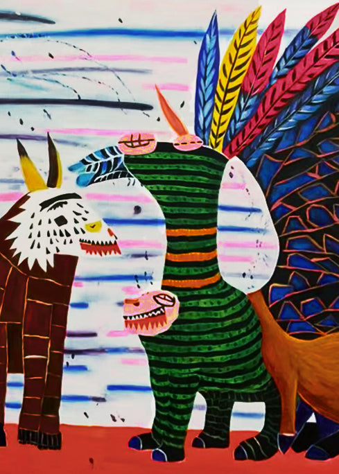 Ein großes Wesen mit Streifen, Hörnern und farbenfrohen Federn erhebt sich vor einer einfacheren Figur. Auf seinem Körper trägt es nicht nur einen, sondern mehrere Köpfe – wie eine Hydra oder ein Traum, der sich ständig vermehrt. Es ist ein Bild der Stärke, aber auch des grotesken Überflusses, bei dem die Formen beinahe übereinanderstürzen. Der Hintergrund mit blauen Pinselstrichen vermittelt Bewegung, als würde der Wind durch die Szene peitschen.