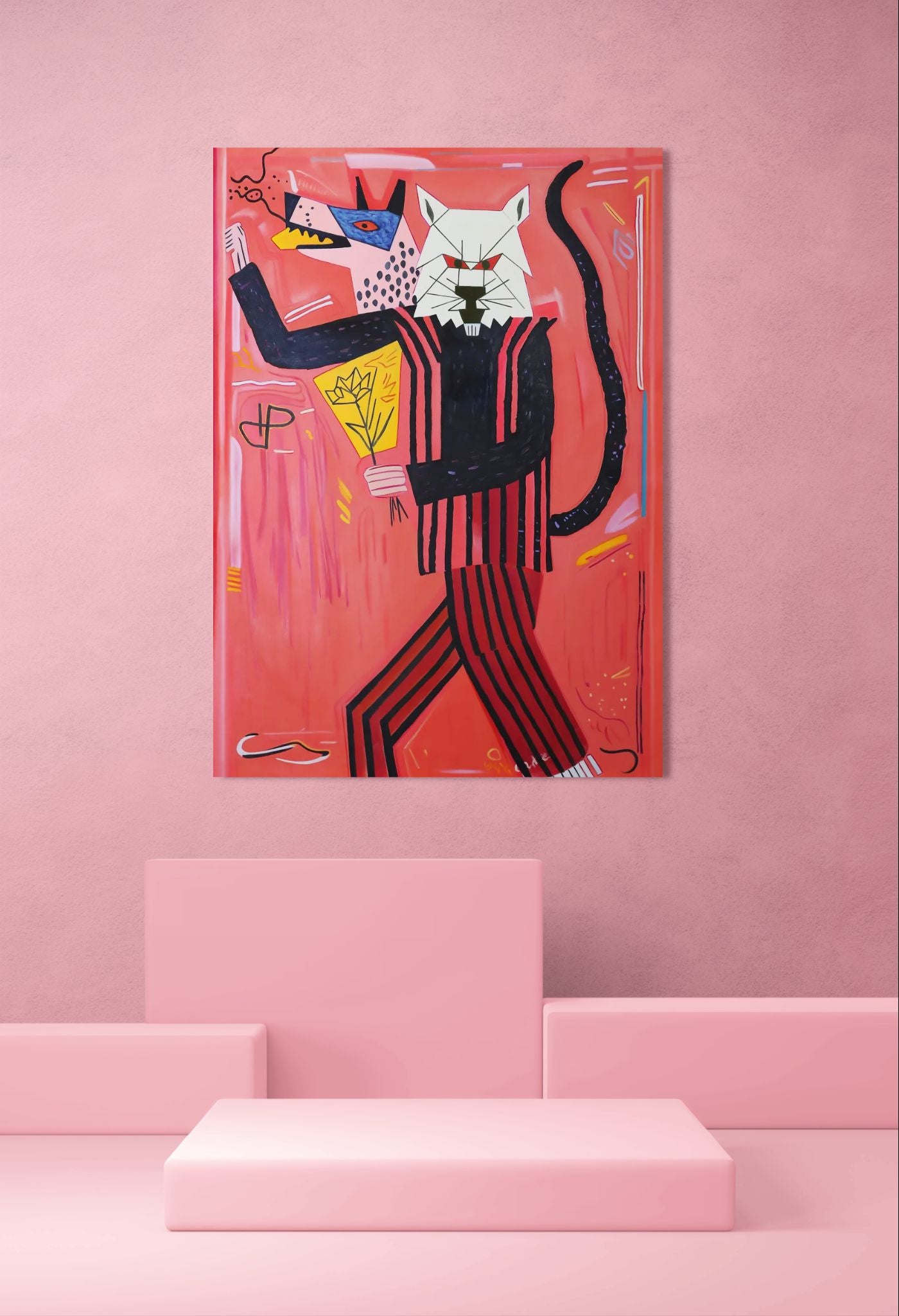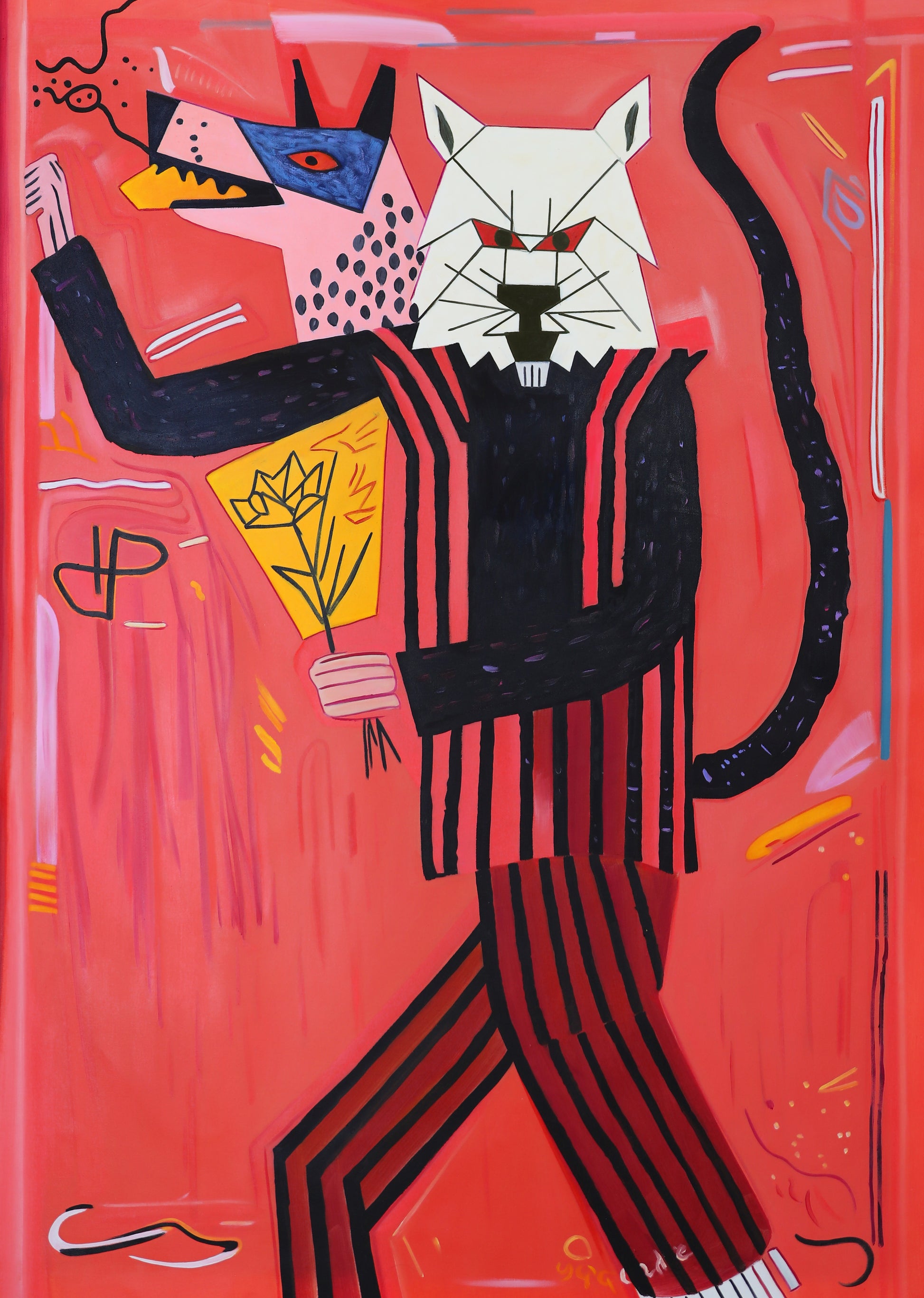 Eine Figur mit weißem Katzenkopf und schwarzem Schwanz marschiert vorwärts in einem roten Universum. In der einen Hand hält sie Blumen, im Hintergrund erscheint ein weiteres Tiergesicht – eine Art Alter Ego. Streifen, Kontraste und grafische Muster verleihen der Szene sowohl Rhythmus als auch eine unheilvolle Spannung. Es entsteht der Eindruck einer Prozession, als wäre die Figur auf dem Weg zu einem verborgenen Ritual.
