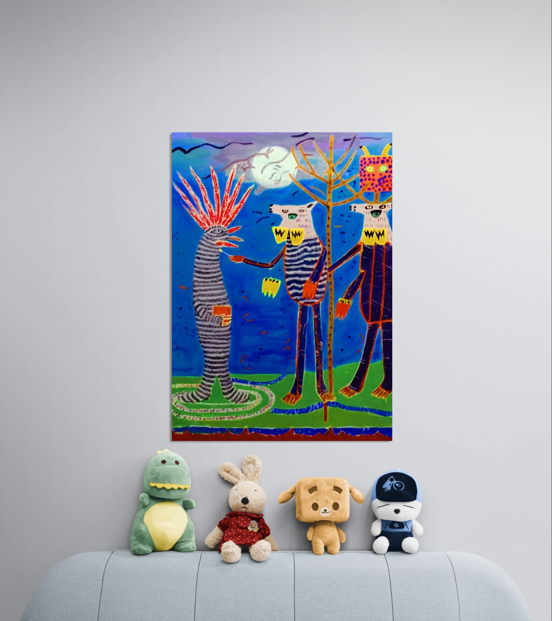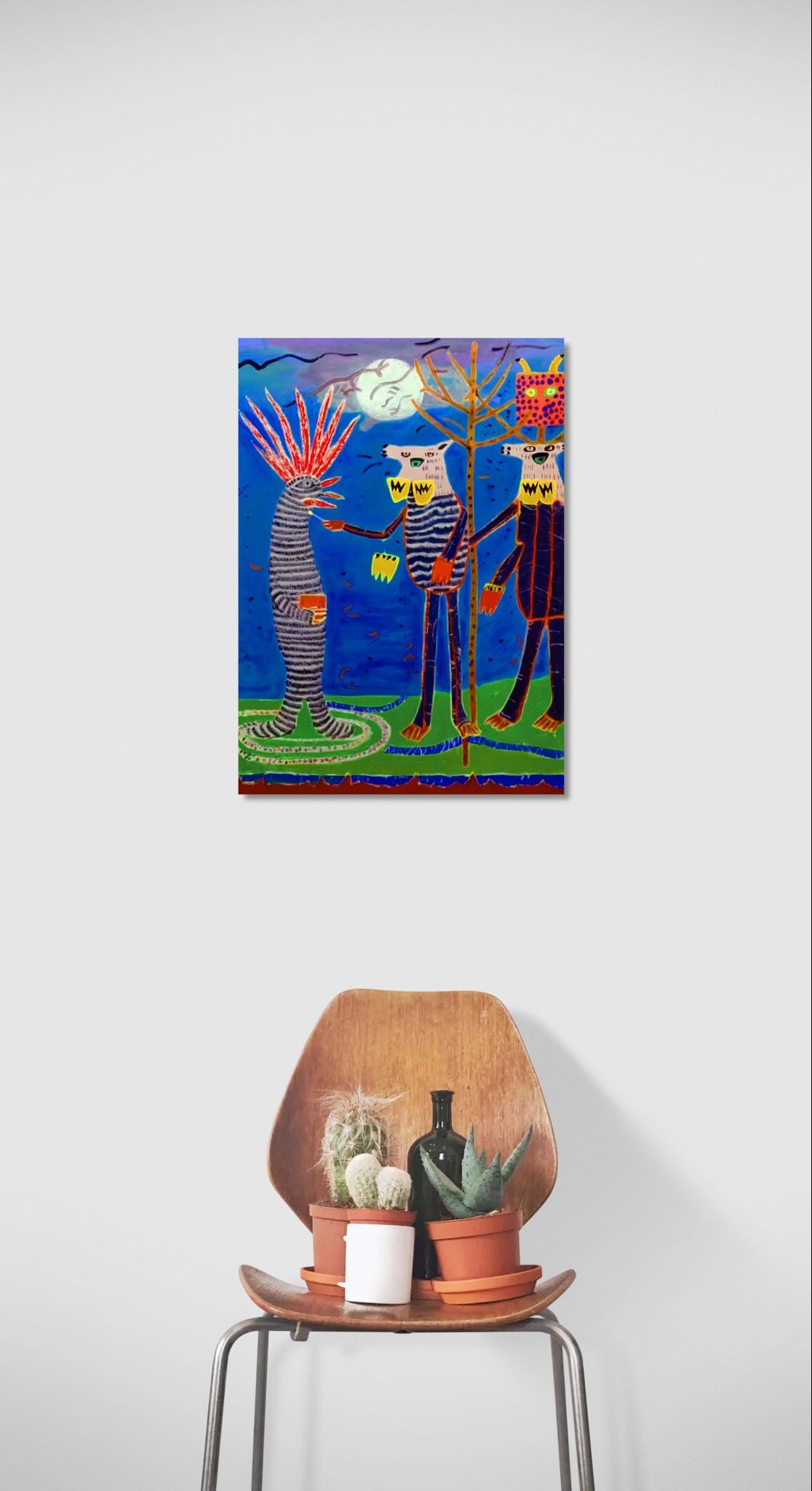 Drei Wesen treffen sich unter einem leuchtenden Mond. Eines trägt eine Mähne aus roten Federn, die anderen Masken und farbenfrohe Muster. Das Gespräch wirkt intensiv – wie ein nächtliches Treffen zwischen Stämmen oder geheimen Gesellschaften. Der blaue Hintergrund vermittelt ein Gefühl von Mystik und Ruhe, während die gelben Details auf den Figuren wie Signale in der Dunkelheit leuchten.