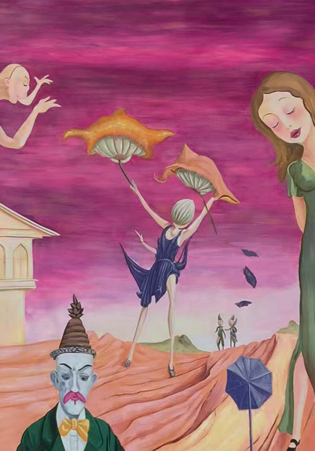 Eine Szene, in der Figuren durch einen lilafarbenen Himmel schweben, als tanzten sie auf einer unsichtbaren Theaterbühne. Frauen mit geschlossenen Augen und unwirklichen Körperhaltungen tragen Regenschirme wie Flügel. Im Vordergrund steht ein Mann in Clownskostüm, gefangen zwischen Spiel und Ernst.