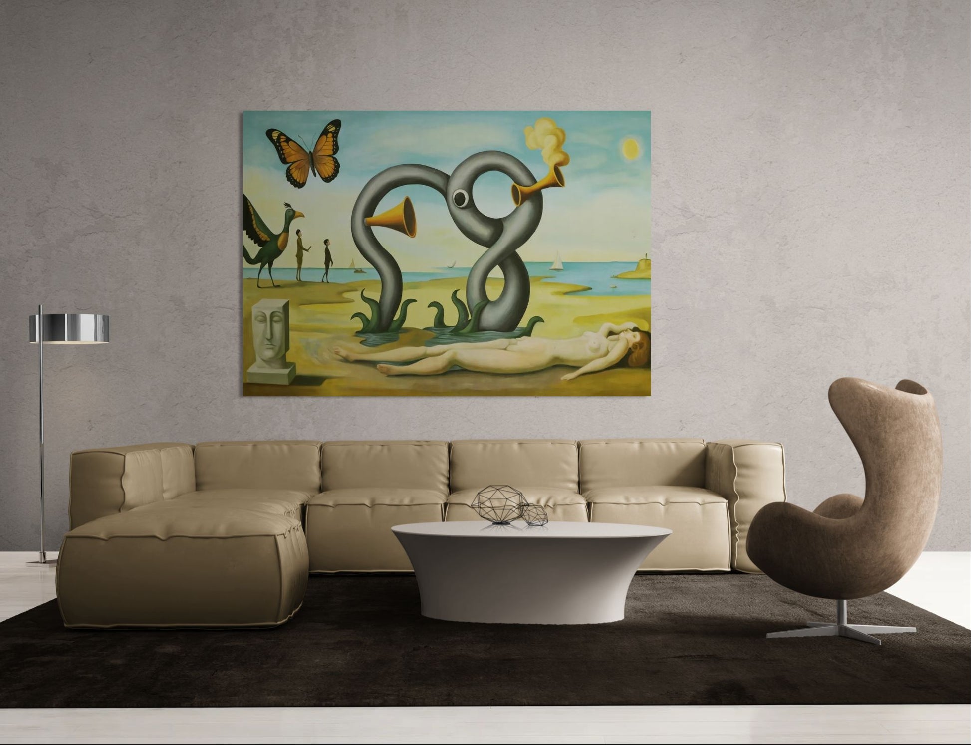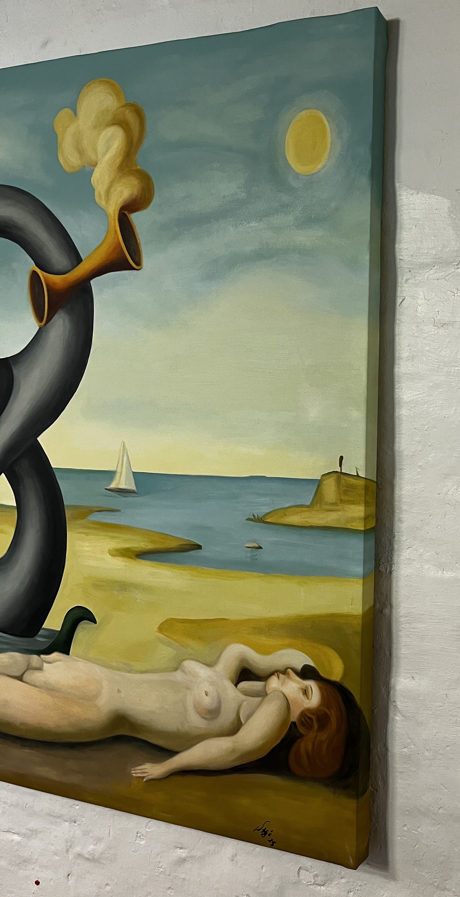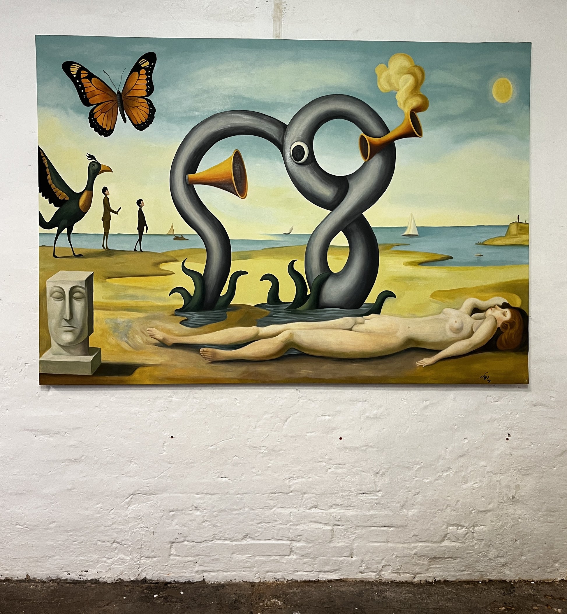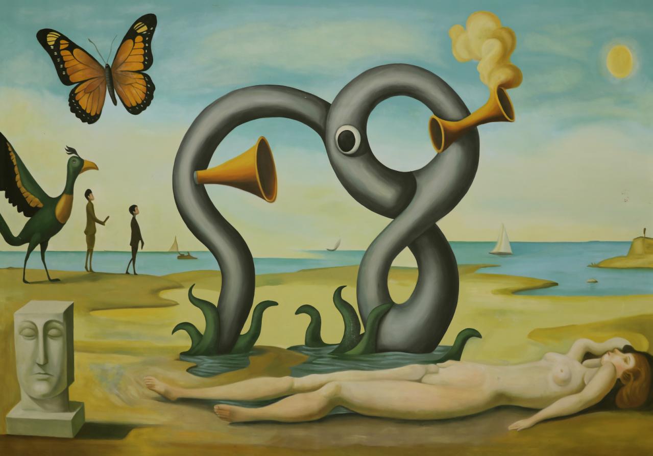 Zwei verflochtene, organische Formen wachsen aus dem Wasser wie lebendige Röhren, mit Augen und trompetenartigen Öffnungen, die Nebel und Klang ausstoßen. Rundherum bewegen sich Schmetterlinge, Vögel und Menschen im Hintergrund, während eine nackte Frau sich an der Küste ausruht. Dieses surreale Tableau erzeugt eine Atmosphäre grenzenloser Traumlogik, in der Natur und Technologie miteinander verschmelzen.