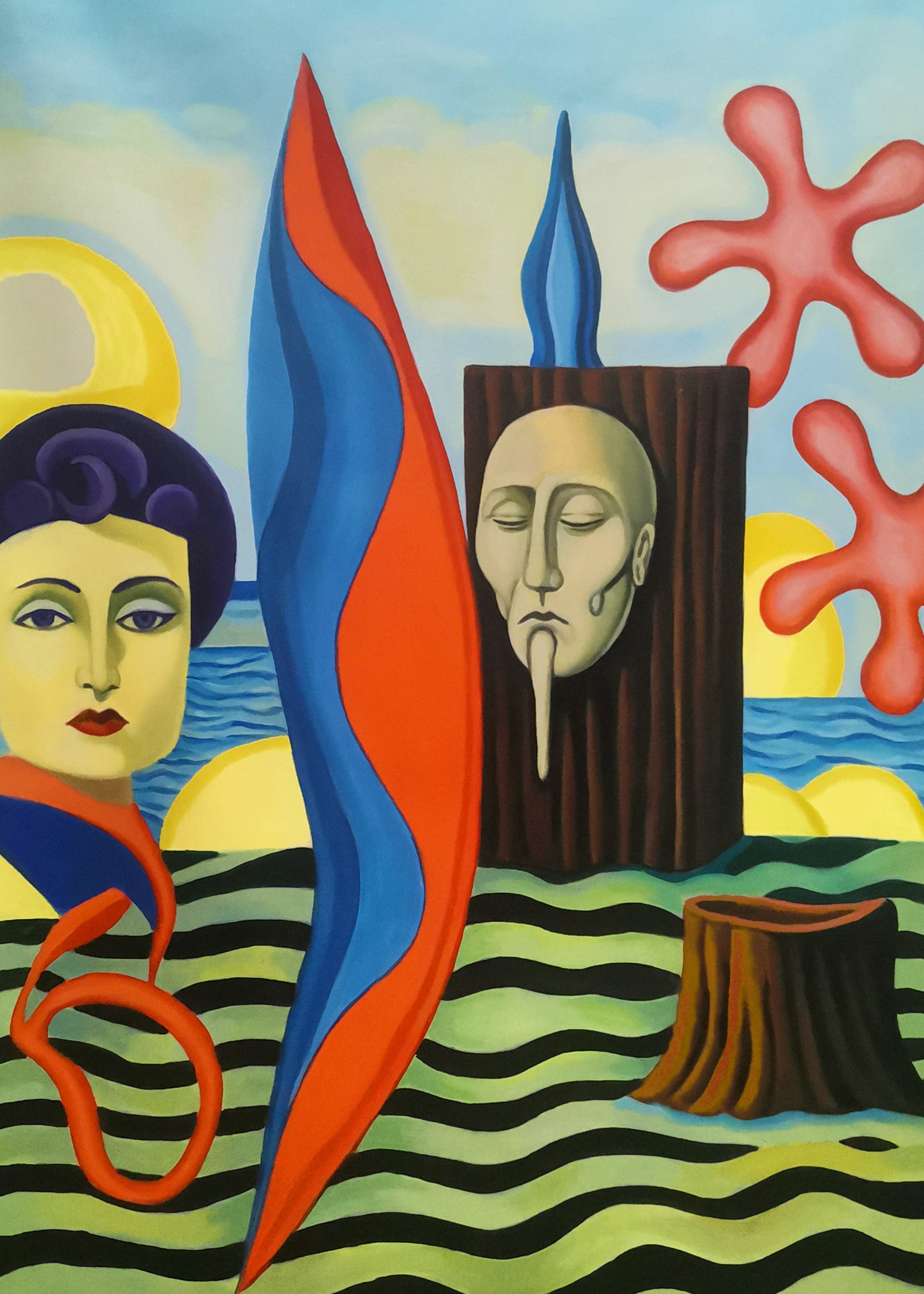 Ein surrealistisches Zusammentreffen von menschlicher Schönheit und symbolischem Tod. Das Gesicht auf der linken Seite ist lebendig, aber ausdruckslos, während die maskenähnliche Gestalt im Baum wie in ewigem Schlaf ruht. Farbige Formen wie Flammen und organische Spritzer schweben im Hintergrund wie unvorhersehbare Gedanken des Geistes.