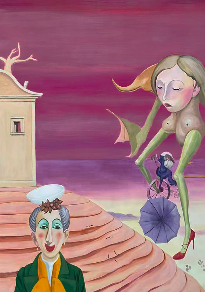 Vor dem Hintergrund eines intensiven lilafarbenen Himmels entfaltet sich ein bizarres Tableau: eine lächelnde Frau im Vordergrund, hinter ihr eine groteske, radfahrende Gestalt mit Vogelflügeln. Architektur und Landschaft verschmelzen in der Absurdität des Traums.