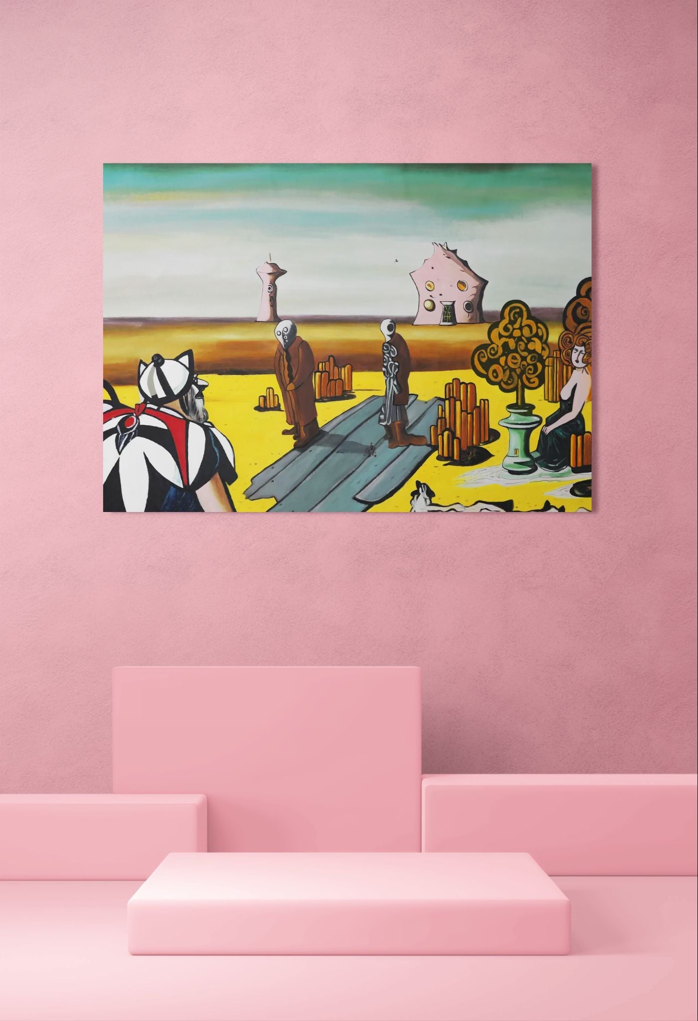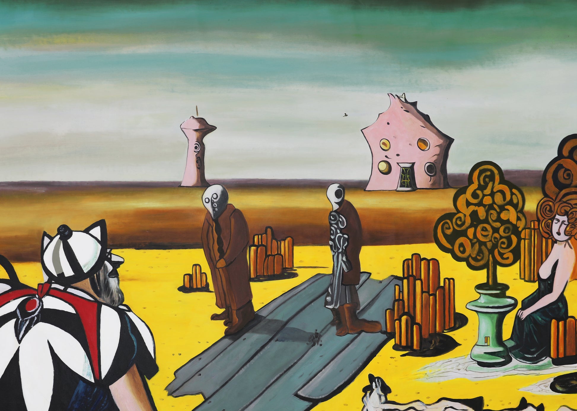 Eine Szene entfaltet sich in einer fremden Landschaft: Maskengestalten in schweren Mänteln wandern unter einem grünlichen Himmel. Ein spiralförmiger Baum steht als surrealistisches Monument, während eine Frau das Geschehen von der Seite aus betrachtet. Am Horizont erheben sich seltsame Türme und Häuser, die fast organisch wirken.