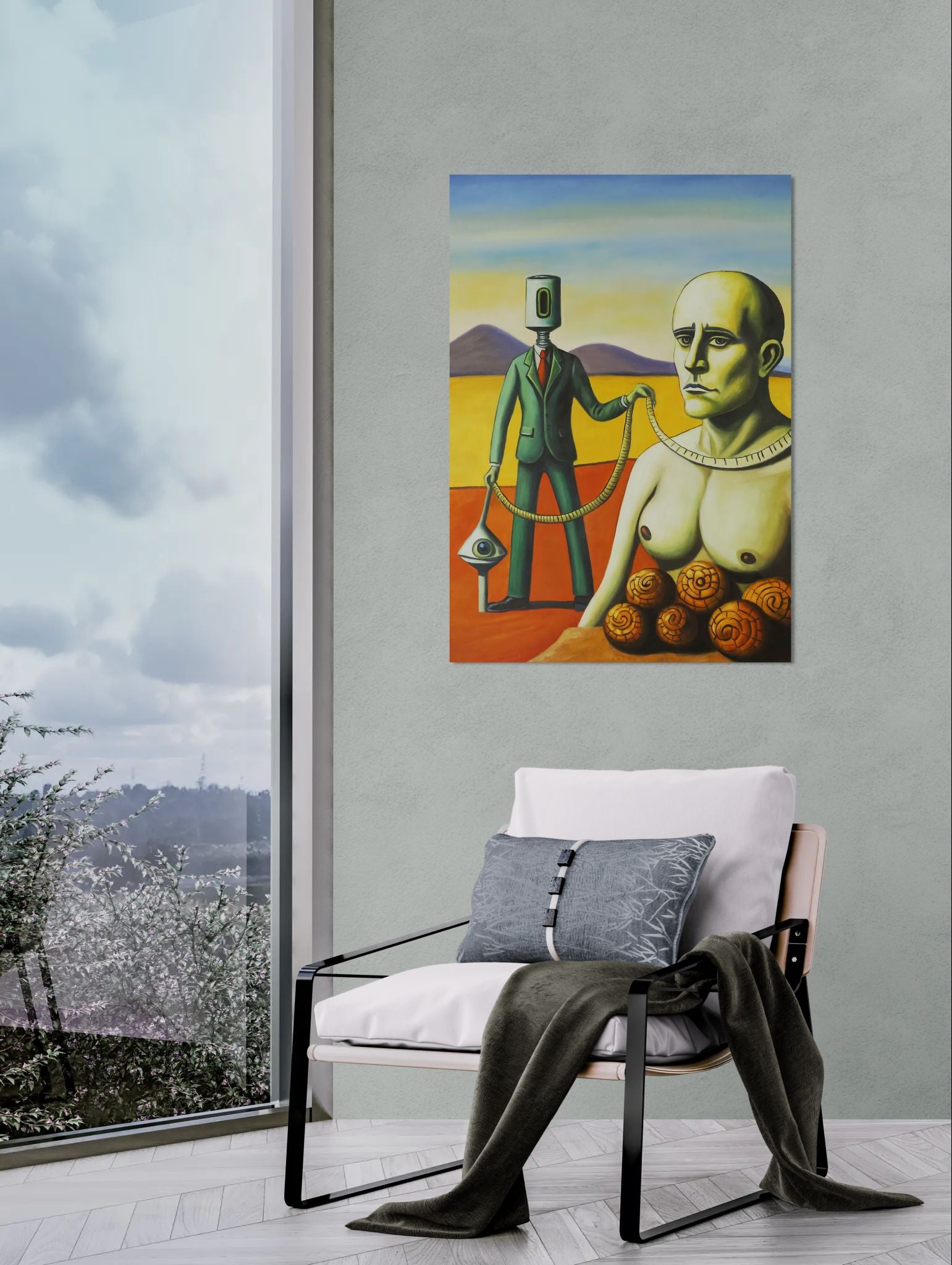 Eine Figur im Anzug mit einem mechanischen Zylinder als Kopf hält ein Maßband, das sich um einen nackten Körper windet. Die Frau im Vordergrund trägt einen Ausdruck der Resignation, während schneckenähnliche Formen als stumme Zeugen des Rituals am Boden liegen. Dahinter erstreckt sich die Wüste ins Unendliche.