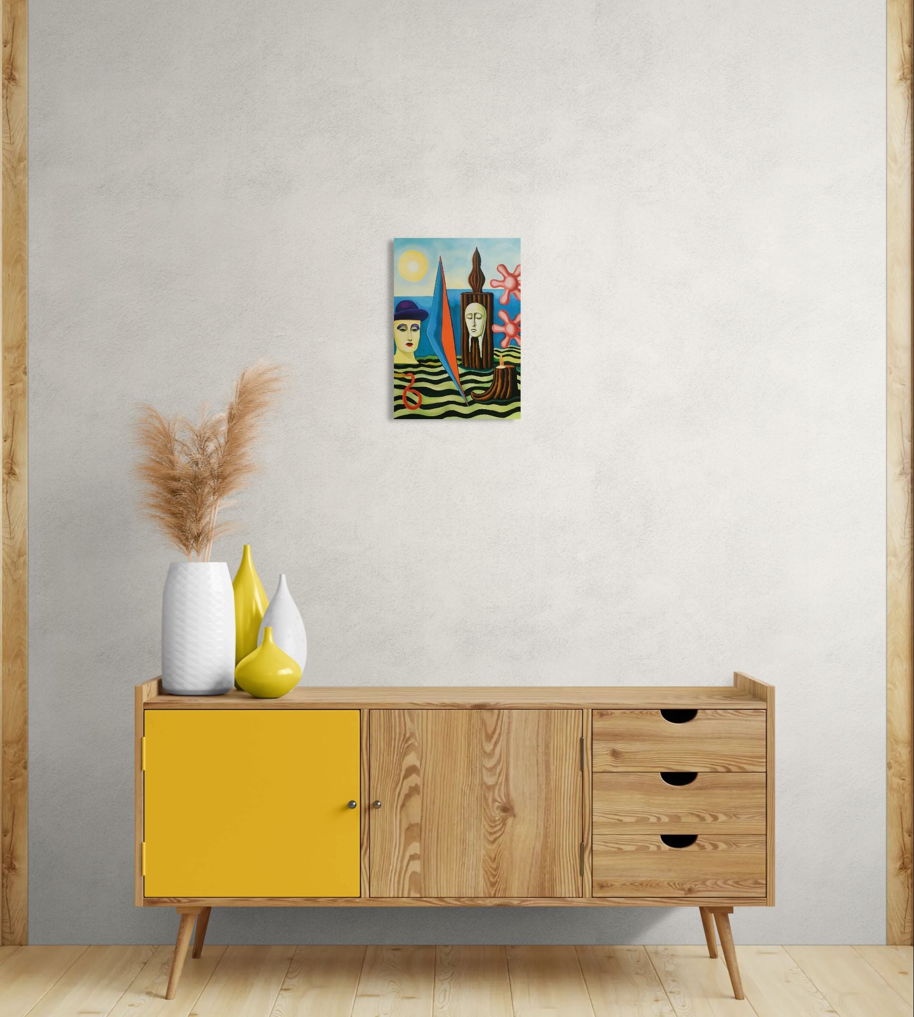Zwei Gesichter – eines menschlich, eines aus Holz geschnitzt – tauchen in dieser Traumlandschaft auf. Die Sonne scheint hell, doch ihr Licht enthüllt mehr, als es verbirgt. Auf den schwarz gestreiften Meereswellen stehen Stämme, die zugleich Kerzenhalter und Totempfähle sind, mit maskenähnlichen Gesichtern.