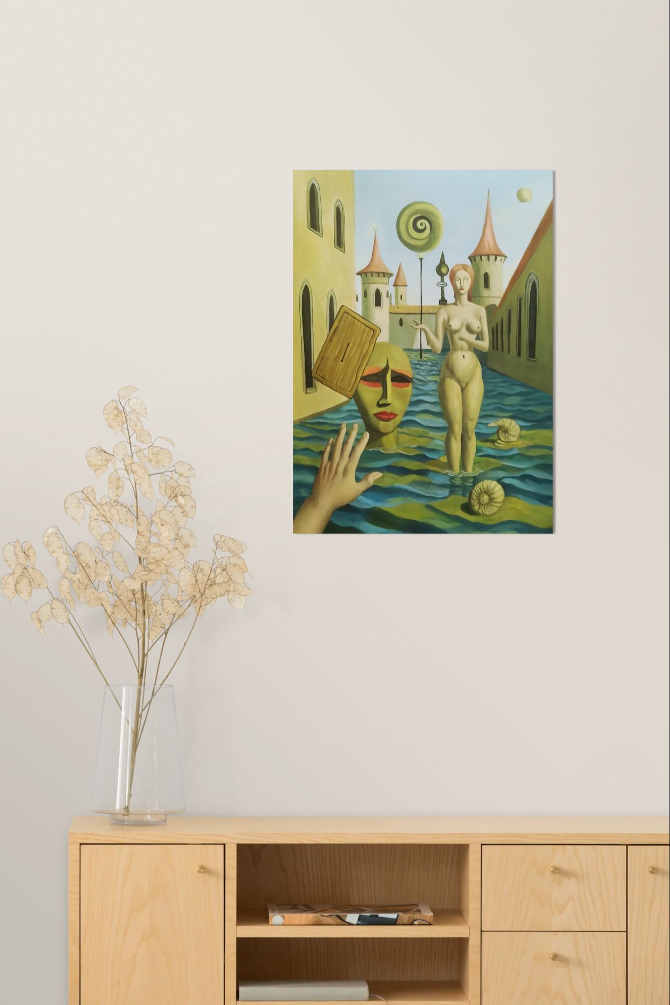 Eine nackte Frau steht in einem überfluteten Schloss mit Türmen, während ein grüner, maskenähnlicher Kopf im Wasser vor ihr treibt. Über ihrer Schulter schweben spiralförmige Symbole, und im Hintergrund erheben sich gotische Gebäude wie eine Traumbühne. Eine Hand streckt sich nach der Maske aus – als suche sie nach Identität. Schnecken mit goldenen Häusern gleiten ruhig umher, stille Zeugen der Zeit.