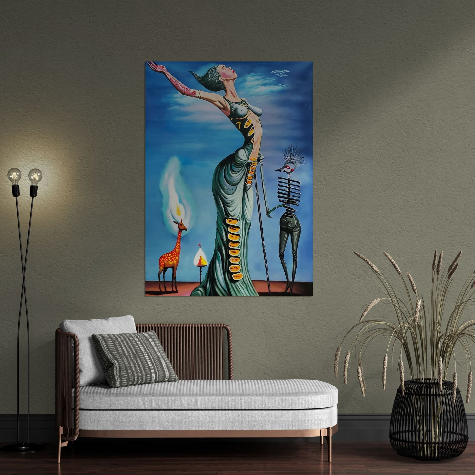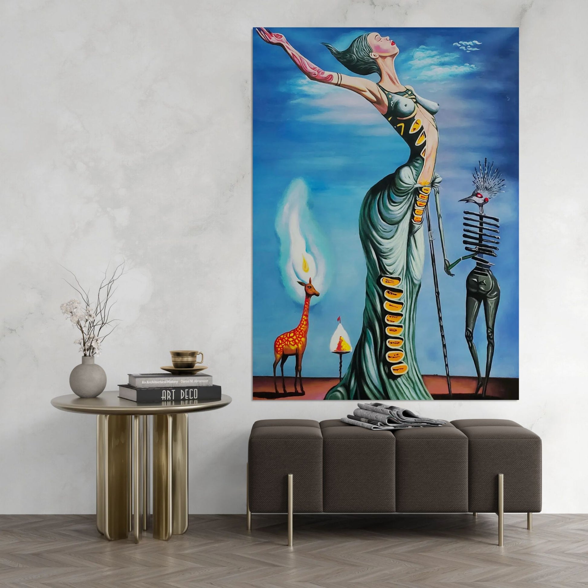 Eine Frauenfigur erhebt sich zum Himmel in einer Geste der Befreiung, ihr Körper durchzogen von gelben Öffnungen – wie Fenster zu einem inneren Feuer. An ihrer Seite stehen ein Skelett mit Vogelkopf und ein brennender Hirsch, Symbole für Leben und Tod im Dialog.