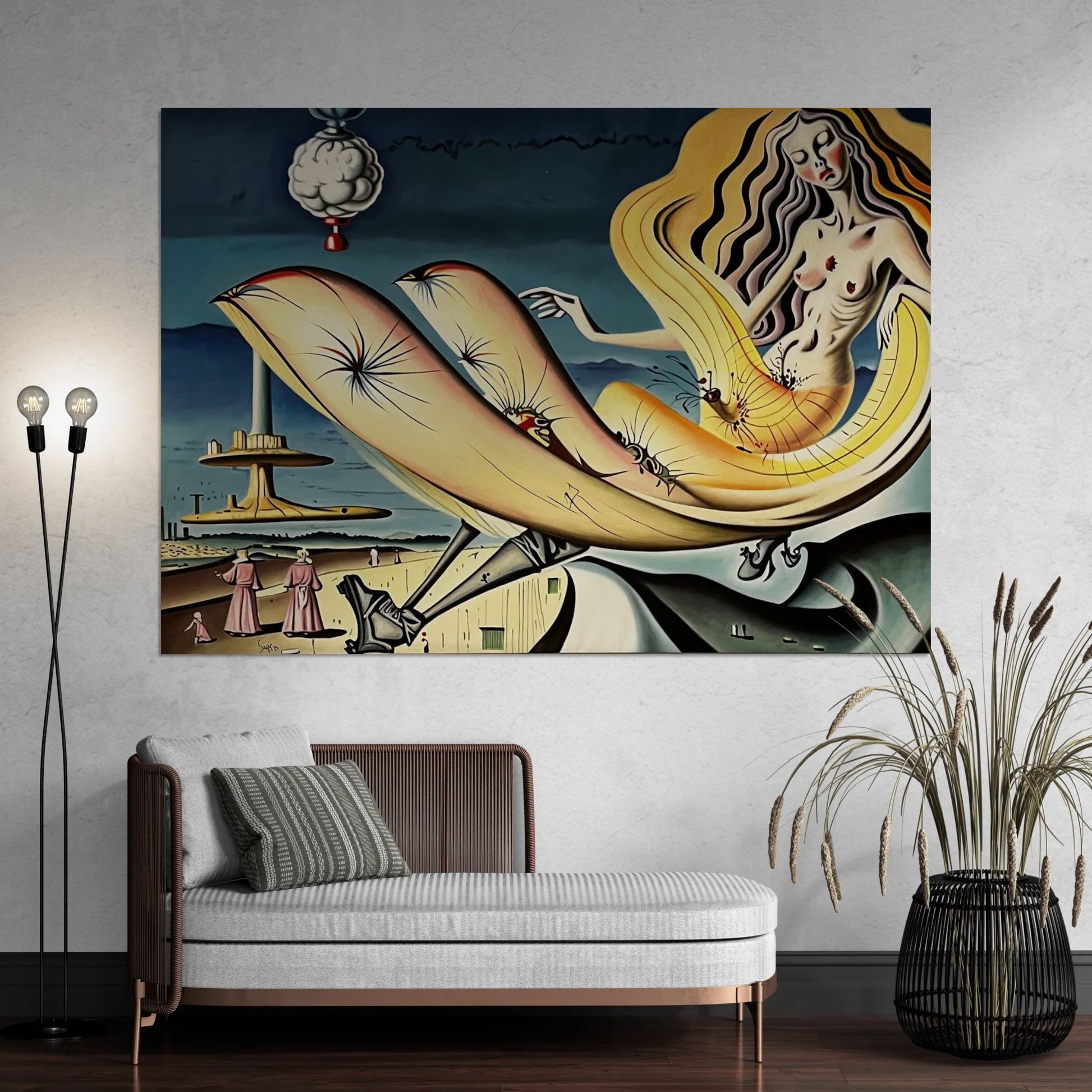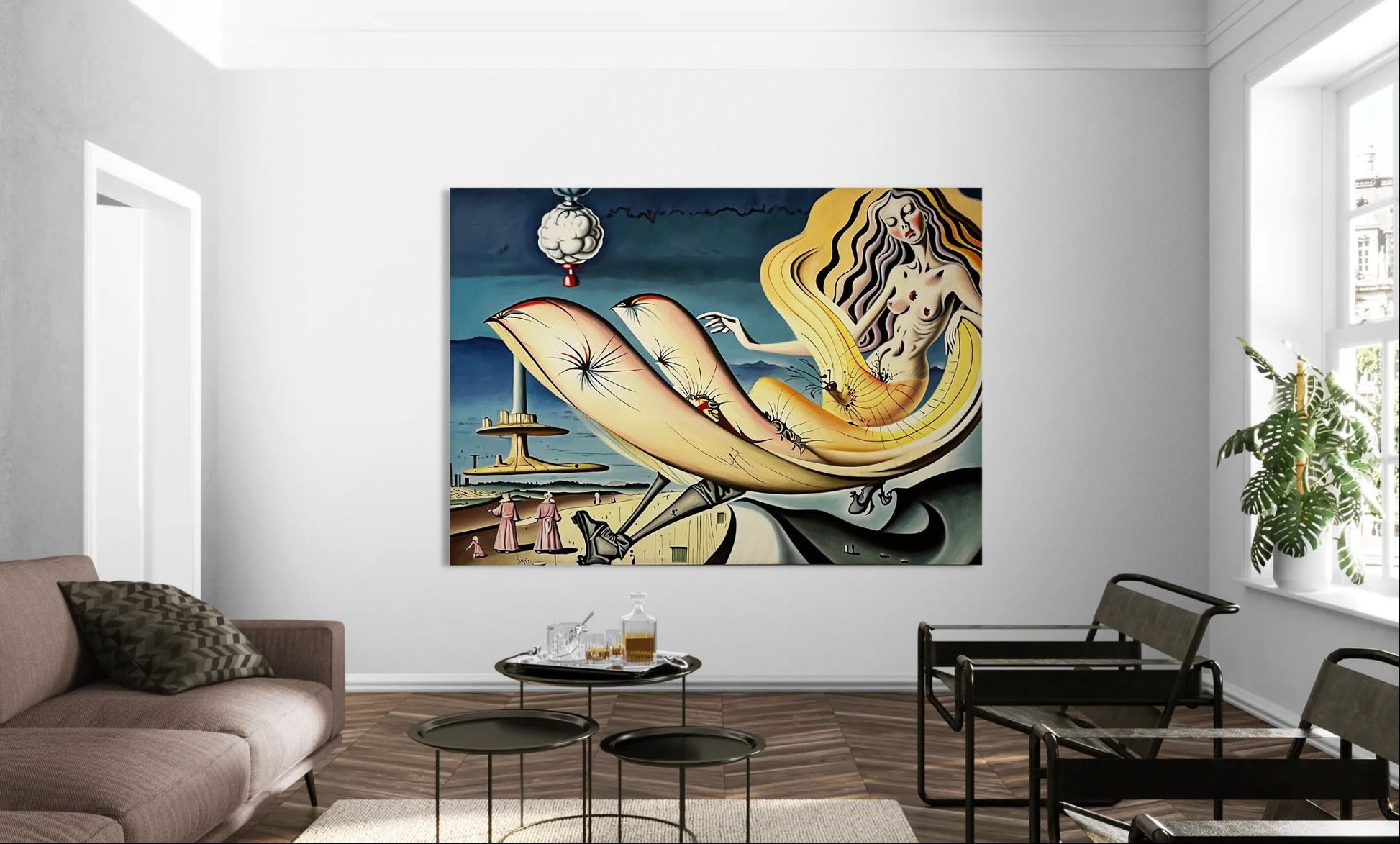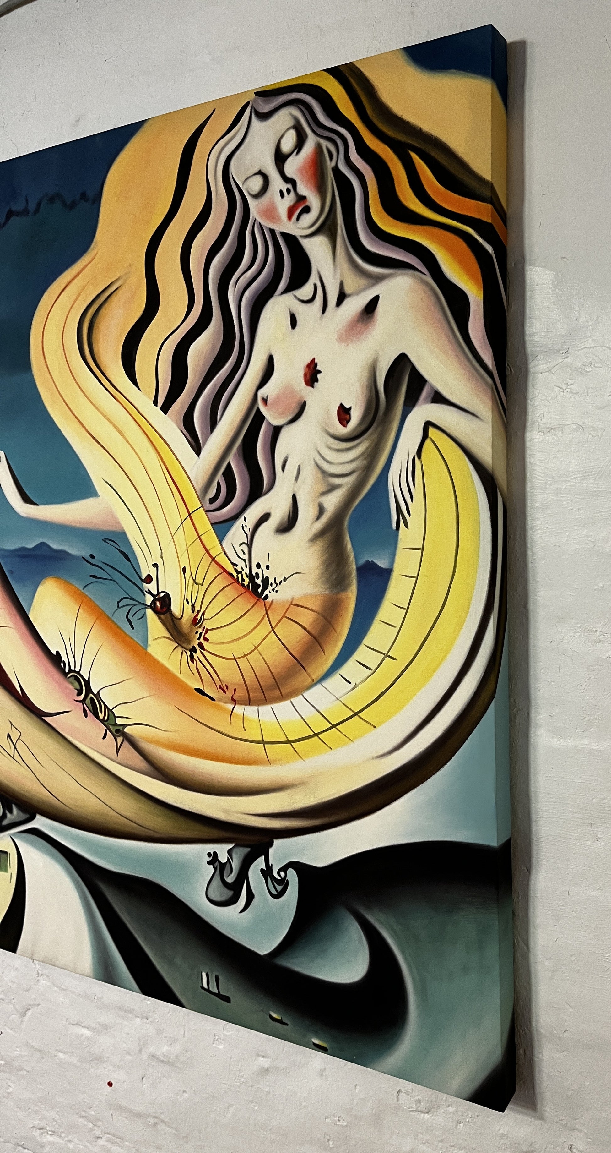 Eine monumentale Frauengestalt liegt ausgestreckt, halb eingehüllt in ein Geflecht aus goldenen, bananenähnlichen Formen, die zugleich wie Gewänder und verletzliche Hüllen wirken. Ihr Gesicht ist erschöpft, doch ihr Haar fließt in langen, leuchtenden Strömen – wie ein Fluss aus Träumen. Auf dem Boden wandern kleine Figuren umher, fast ahnungslos von der Gegenwart der schlafenden Göttin.