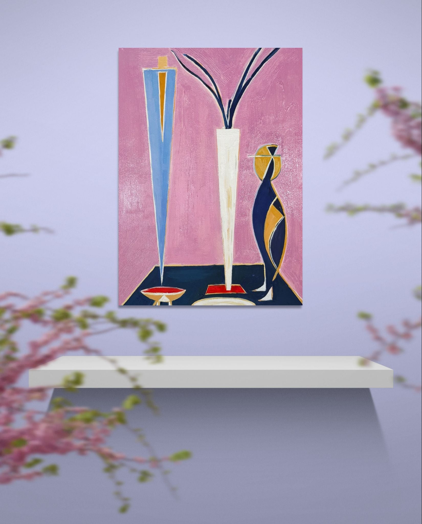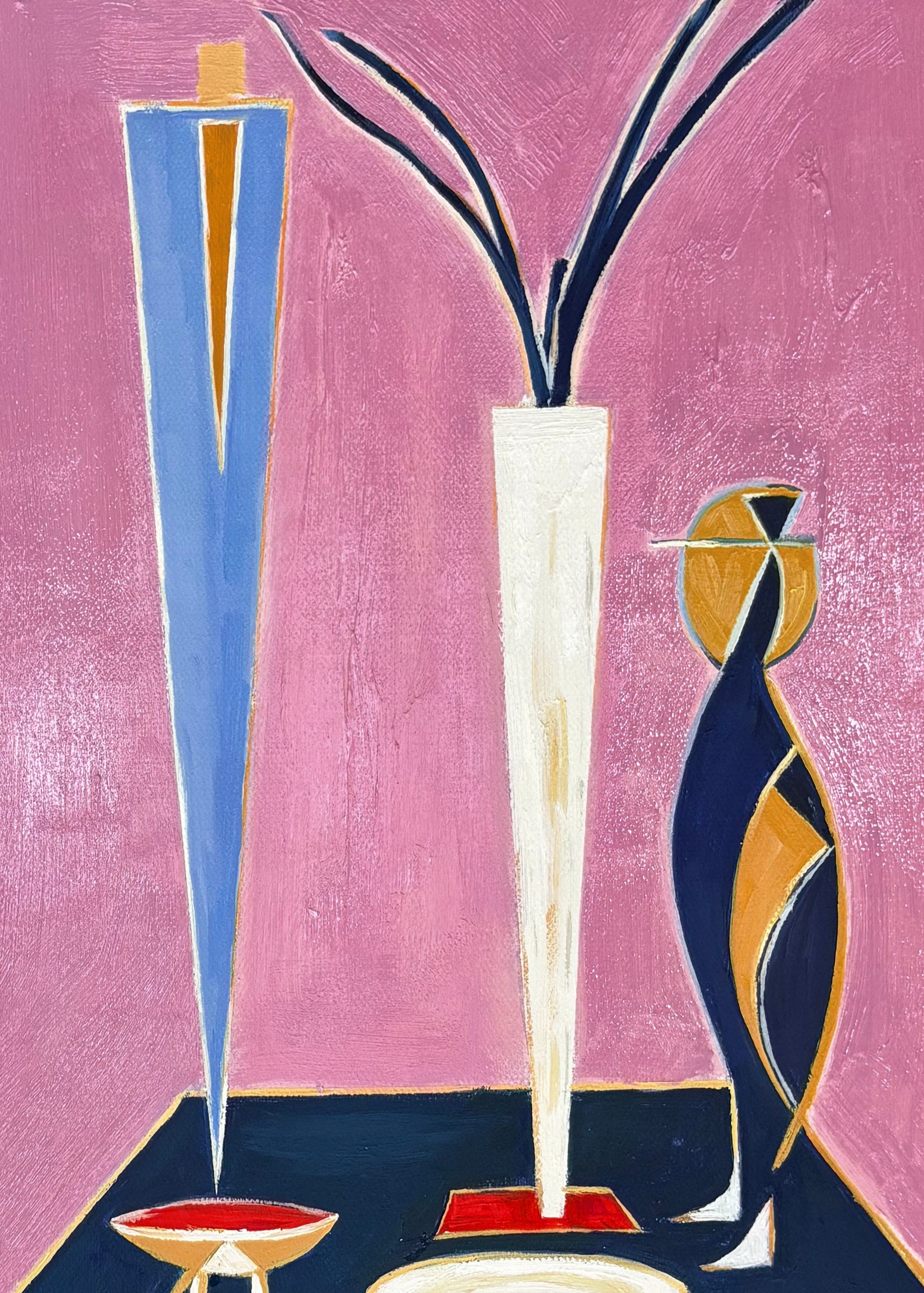 Eine Reihe von Formen tritt in einen Dialog auf einem tiefrosa Hintergrund. Das Trio aus vasenartigen und figurenähnlichen Objekten erzeugt ein Spiel zwischen vertikalen, schrägen und geschwungenen Linien, wobei Schwarz und Gelb als Kontrapunkte hervorbrechen.
