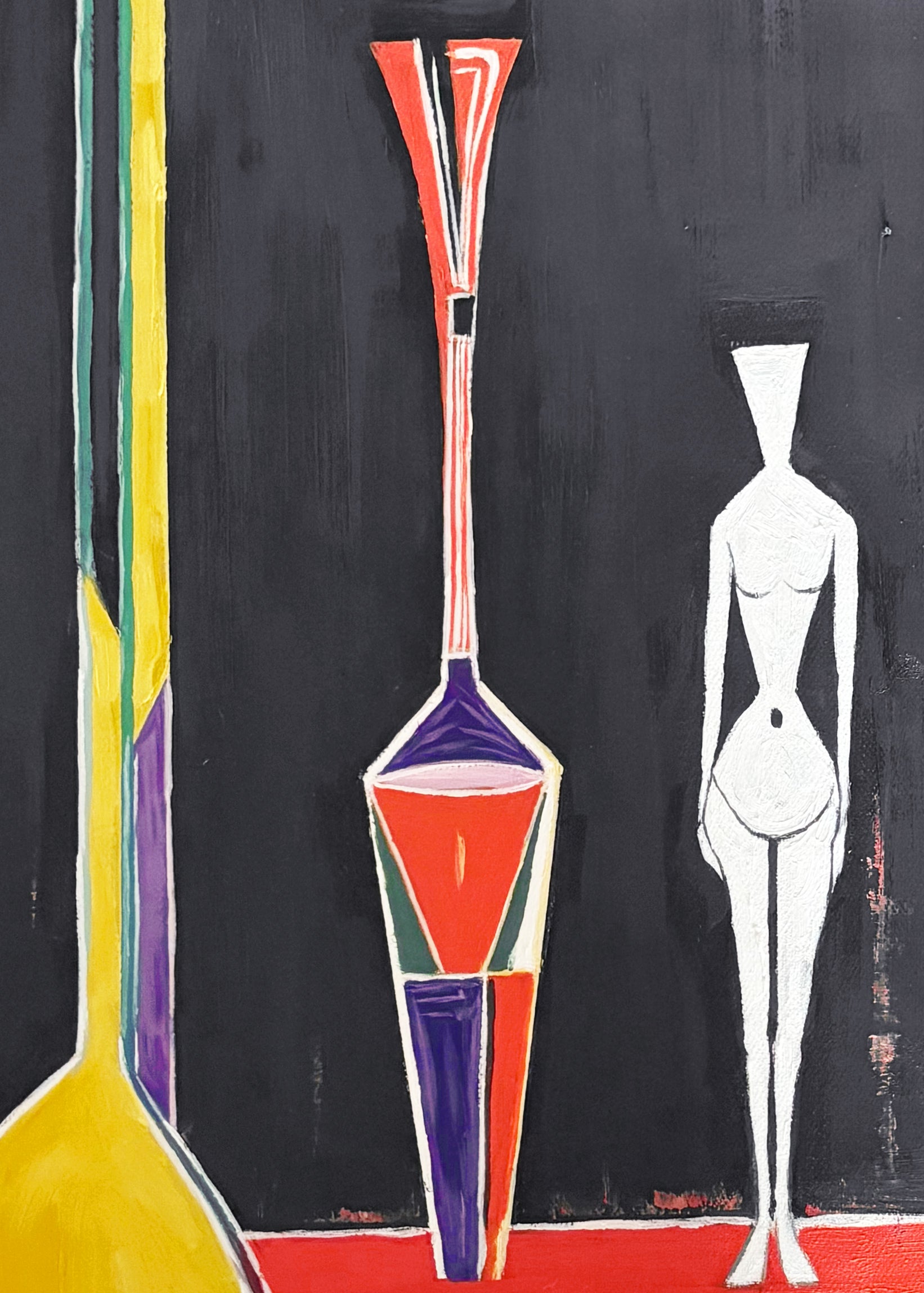 Die Tiefe der Nacht entfaltet sich als Bühne für eine Reihe abstrahierter Figuren. Die weiße Silhouette erscheint als anonyme Präsenz, umgeben von farbgesättigten Formen, die an Masken und Rituale erinnern.