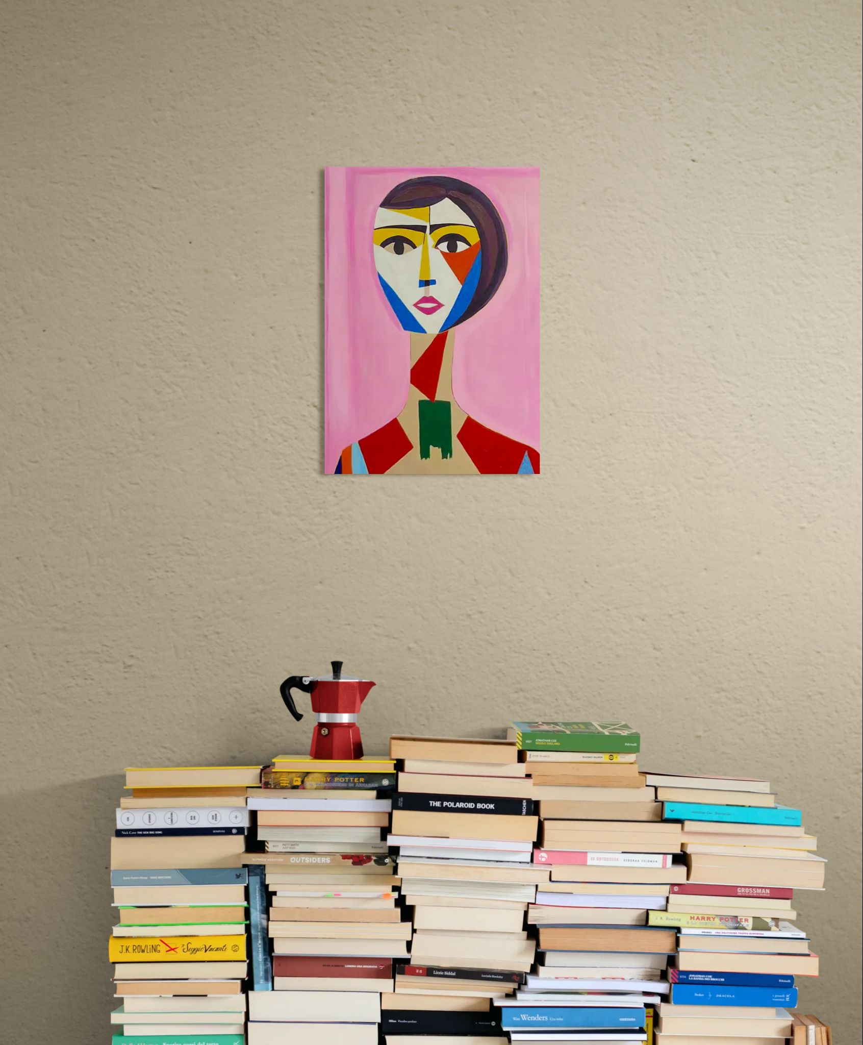 Das Gesicht erscheint wie ein Mosaik aus Farben – eine visuelle Konstruktion statt eines klassischen Porträts. Klare, kantige Flächen in Blau, Rot und Gelb stehen in starkem Kontrast zu den neutralen Hauttönen.