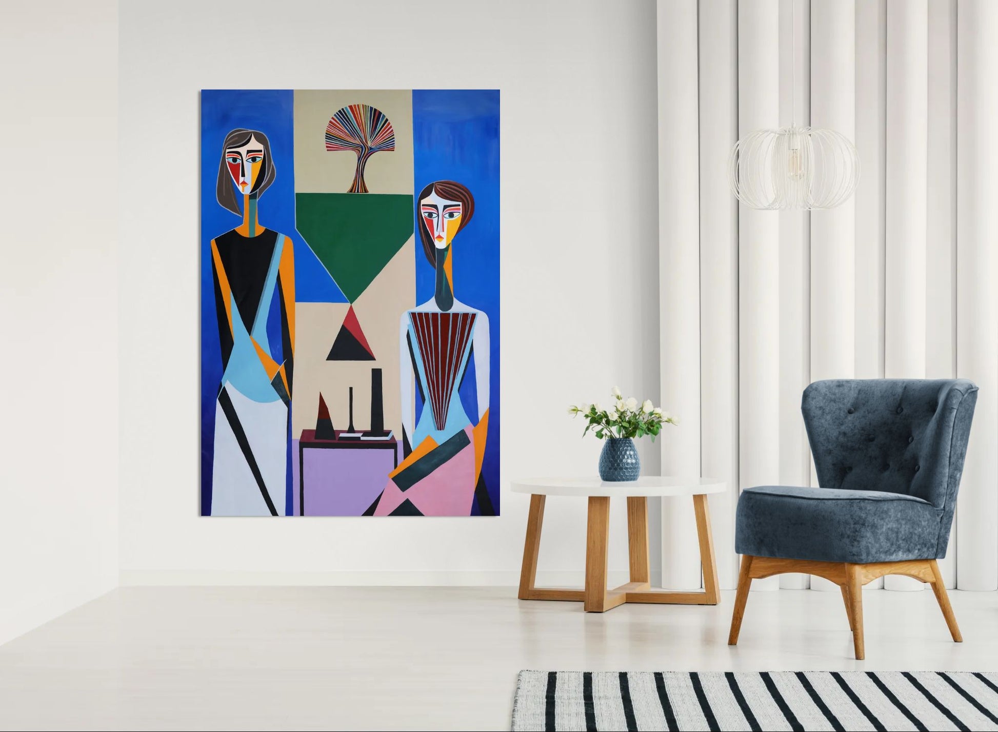 Ein harmonisches Zusammentreffen zweier stehender Figuren, flankiert von einem zentralen symbolischen Baum, der sich in einem Farbspektrum entfaltet. Die schlanken, aufrechten Figuren bestehen aus Flächen in Schwarz, Blau, Orange und Grün und strahlen eine würdige Ruhe aus.