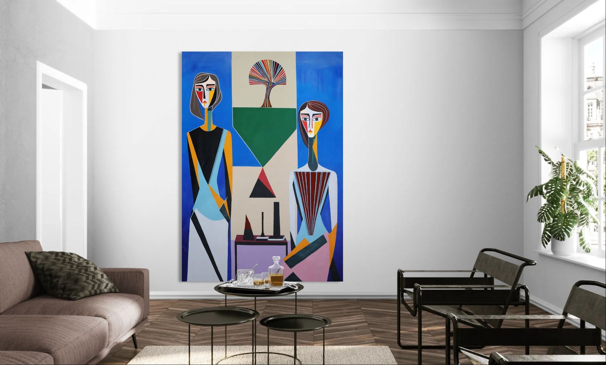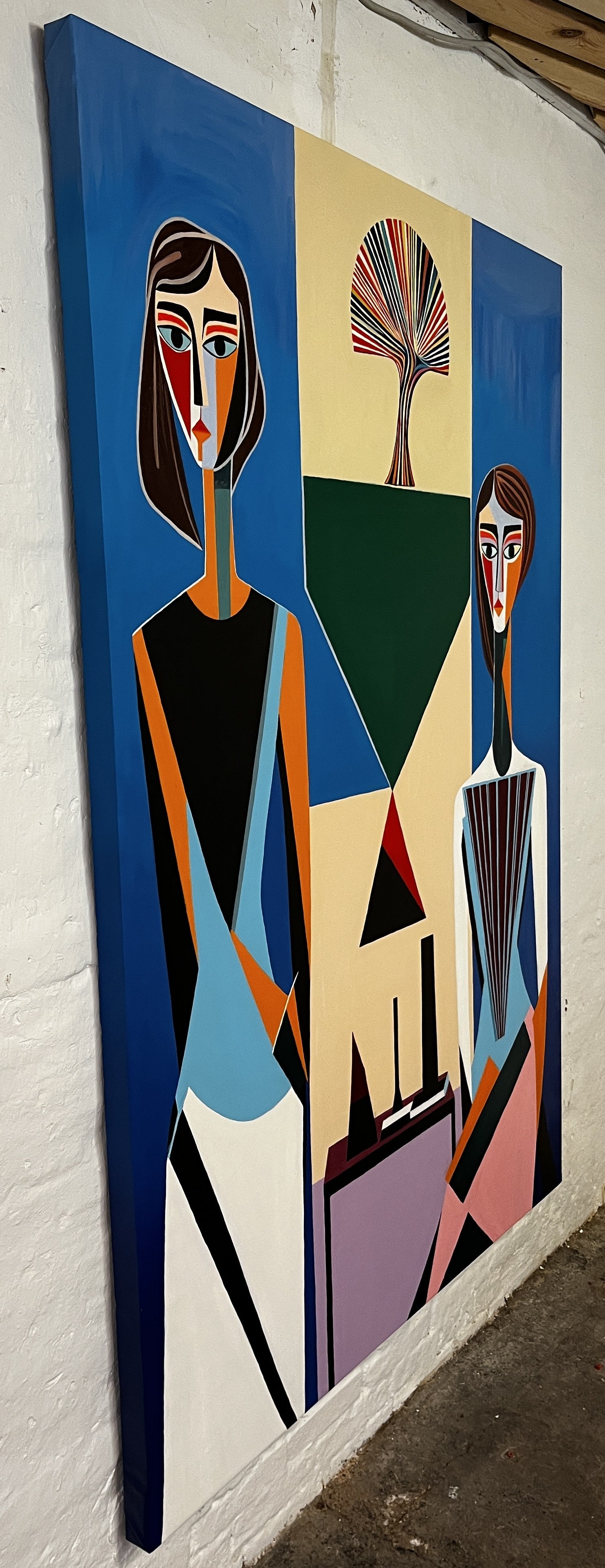Der Baum, zwischen ihnen platziert, fungiert als visuelles und geistiges Zentrum – eine Metapher für Lebenskraft und gemeinsame Wurzeln, während der Tisch mit geometrischen Objekten die Szene im Konkreten verankert.