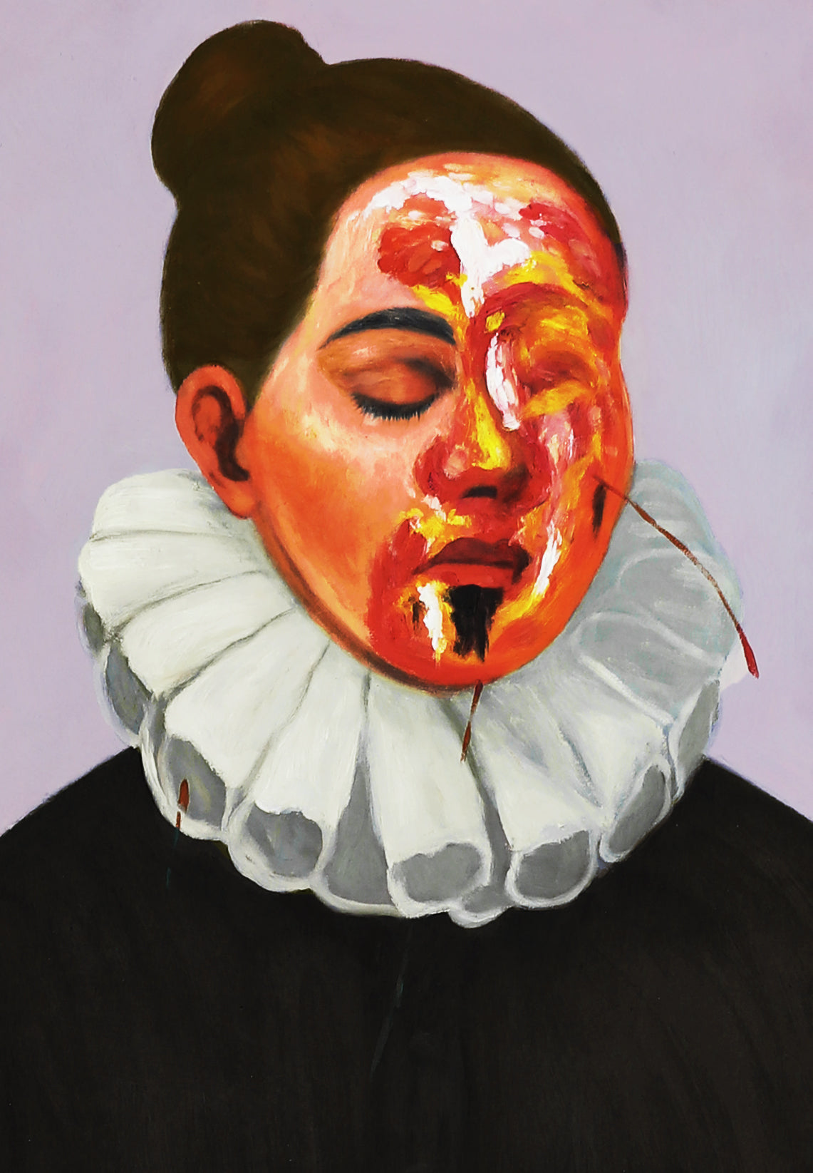 Ein weibliches Porträt mit hochgestecktem Haar und weißem Kragen, dessen Gesicht von feurigen Pinselstrichen verzerrt wird. Geschlossene Augen und ein stiller Ausdruck verstärken den Kontrast – als würde sie die Zerstörung akzeptieren. Es ist ein Porträt der Resignation, stille Stärke inmitten der Auflösung.