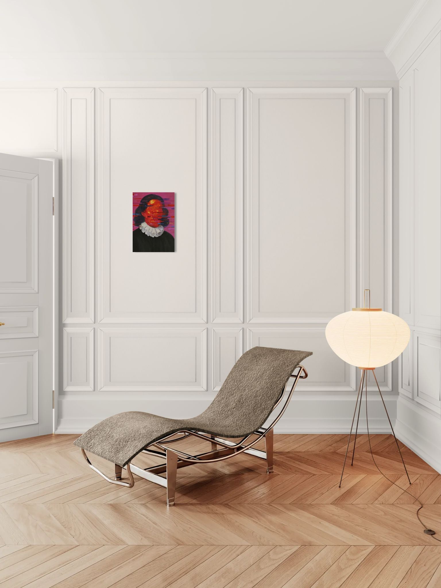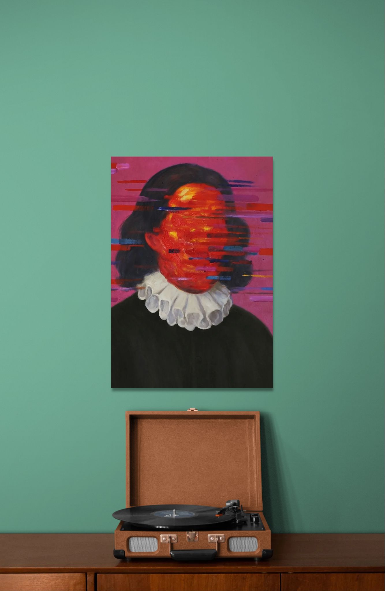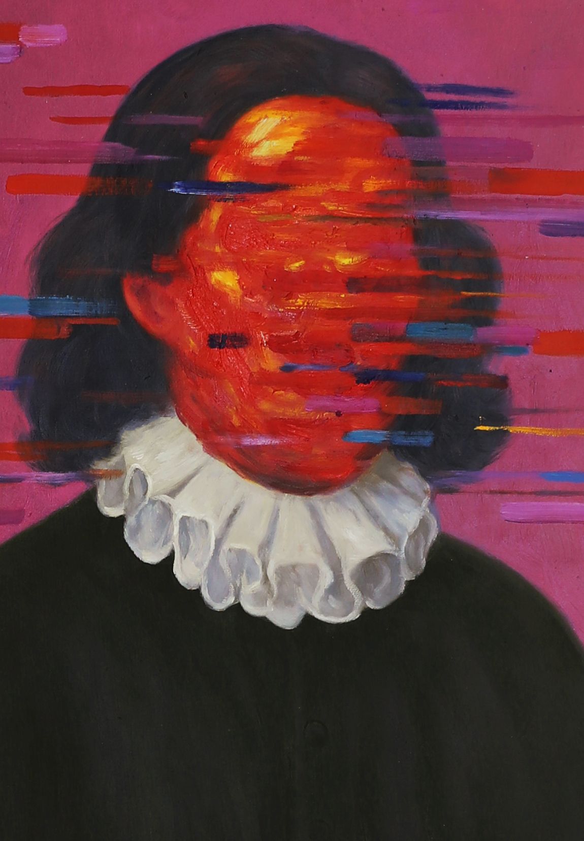 Ein klassisches Porträt, bei dem das Gesicht nicht vollständig zerstört, sondern in flimmernde, horizontale Streifen aufgebrochen ist – als würde das Bild direkt vor unseren Augen zerfallen. Es wirkt wie ein digitaler Fehler, übersetzt in Ölmalerei – eine Erosion der Identität, eingefangen zwischen den Schichten der Zeit.