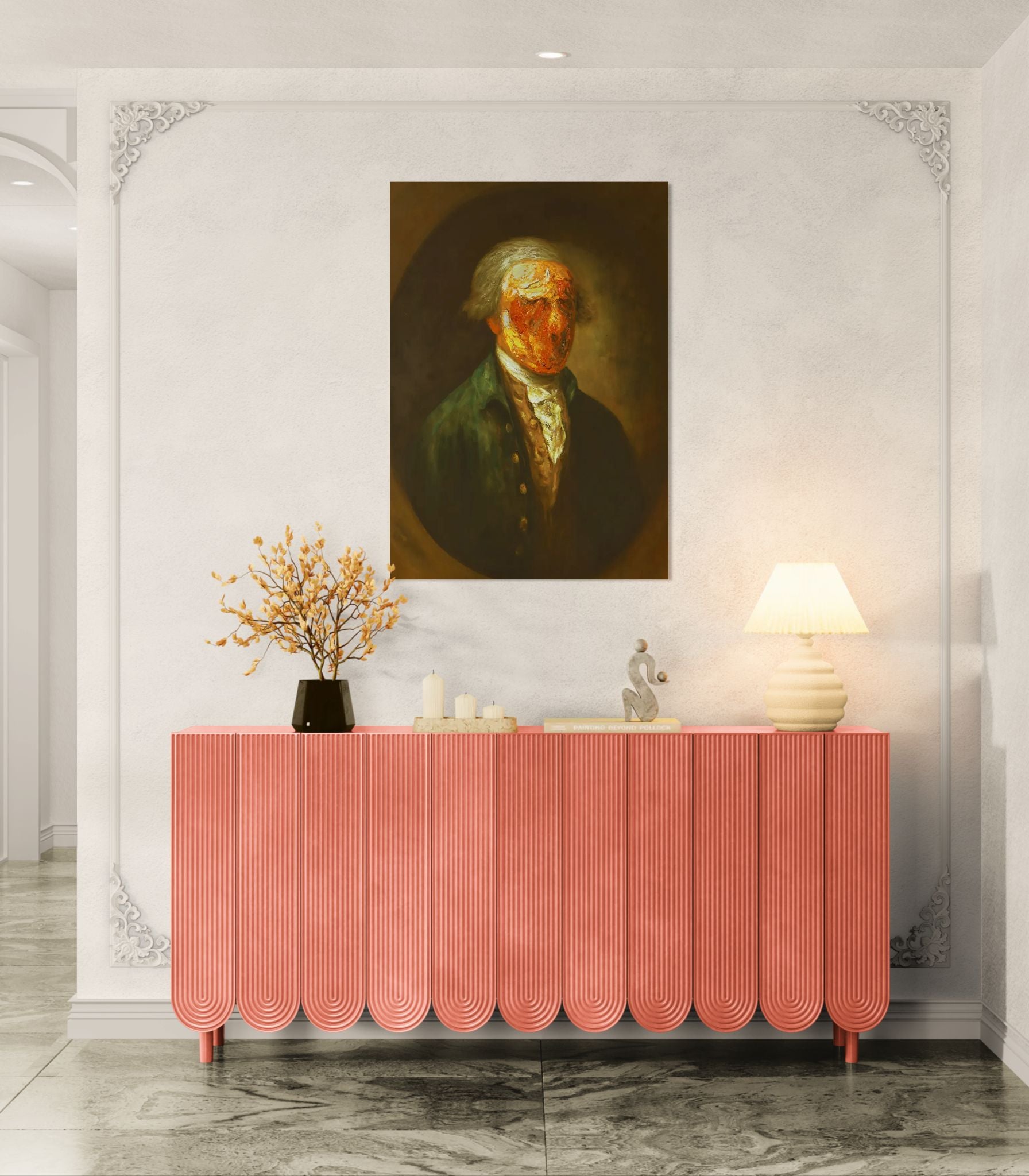 Eine ovale Rahmung einer Figur im grünen Mantel, doch der gesamte Fokus liegt auf dem leuchtend feuerroten Gesicht, das mitten in der Dunkelheit erstrahlt. Die Figur scheint bereits den Toten anzugehören – reduziert zu einem Epitaph, bei dem nur das Glühen der Farbe als Erinnerung bleibt.