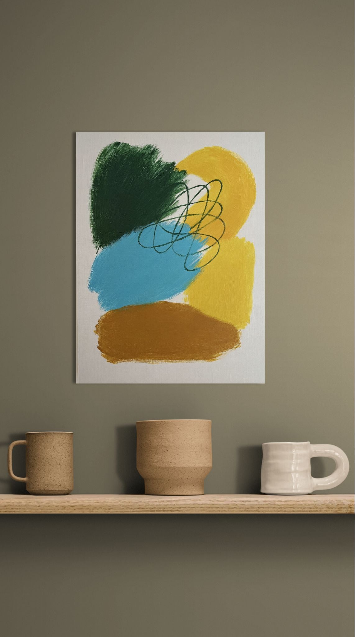 Et legende og intuitivt værk, hvor farvefelter møder linjer i en ubesværet balance. De brede, nærmest spontane penselstrøg i grøn, blå, okker og gul bevæger sig hen over lærredet i et åbent, lyst rum, mens de mørke, organiske linjer svæver hen over som en dansende kontrast.