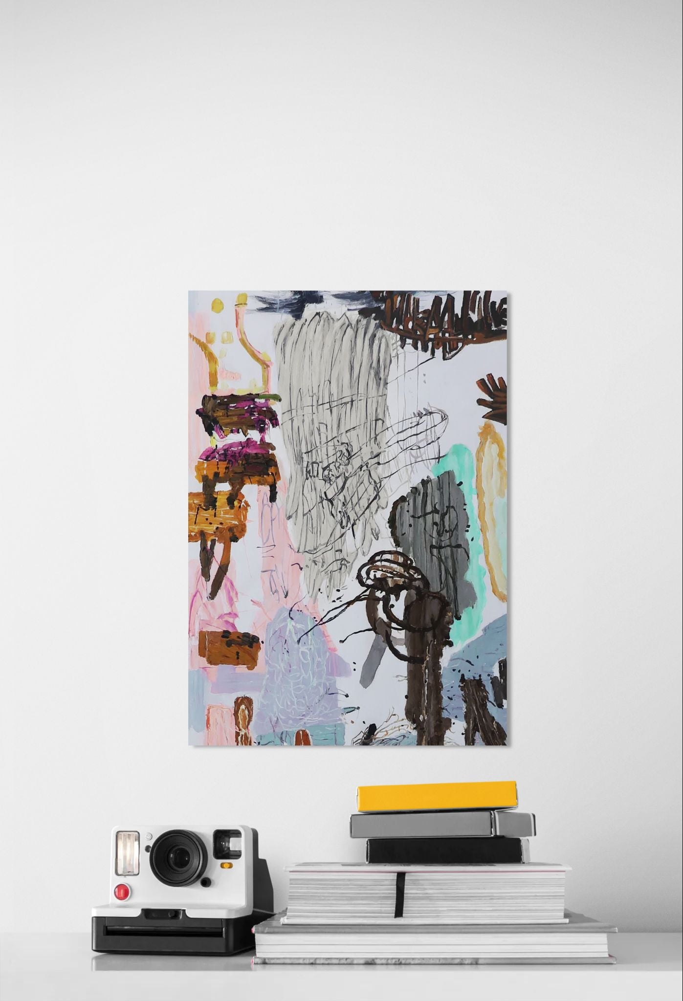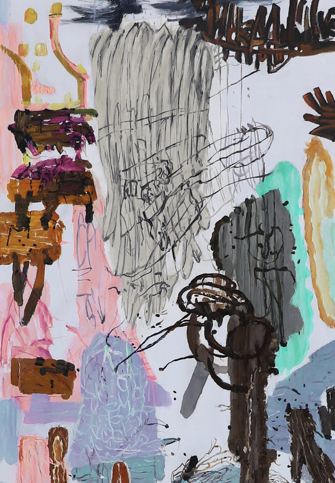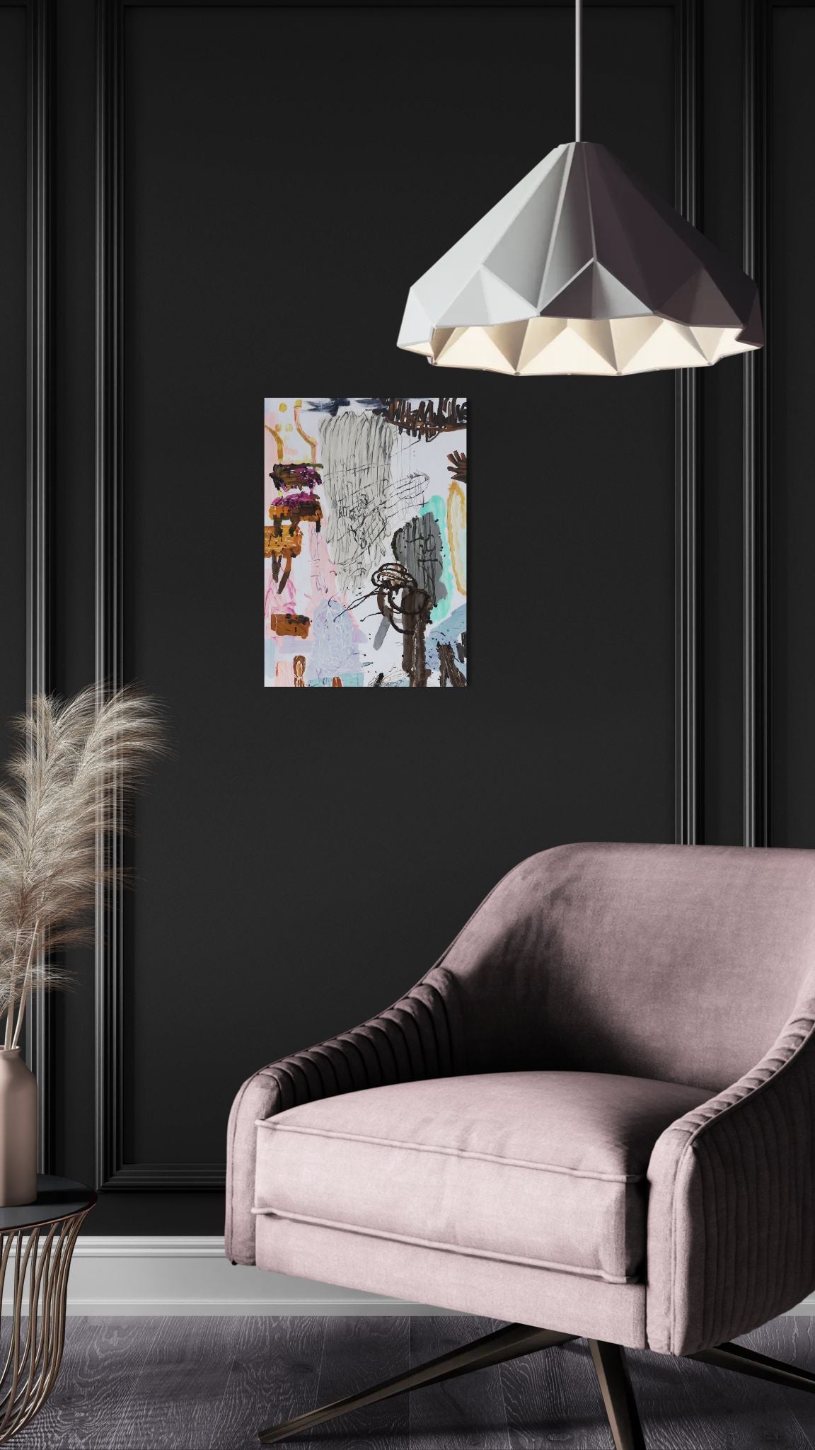 Dette værk er en eksplosion af tegn og symboler. Streger, kruseduller og farvefelter dækker hele lærredet, som et visuelt kaos, hvor alt kæmper om opmærksomheden. Pasteller blandes med skarpe kontraster, og værket balancerer på grænsen mellem barnlig spontanitet og dyb alvor.