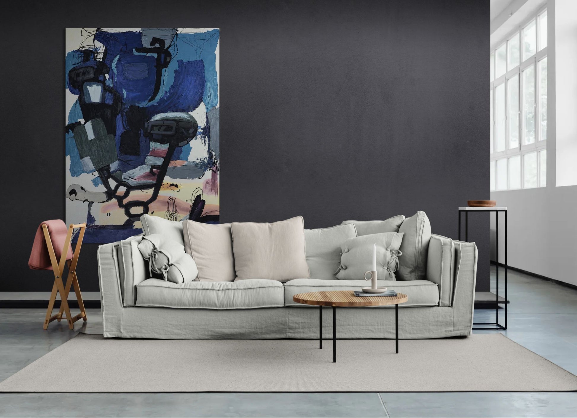 Her dominerer blåtoner billedfladen, som et hav af indtryk, hvor mørket gemmer på former, der både virker maskinelle og organiske. De kraftige, sorte konturer minder om strukturer, der næsten er skeletter, men også kunne være arkitektoniske konstruktioner. Midt i mørket bryder et blødt felt af gul og rosa frem, som et åndehul, en lysning i kaosset.