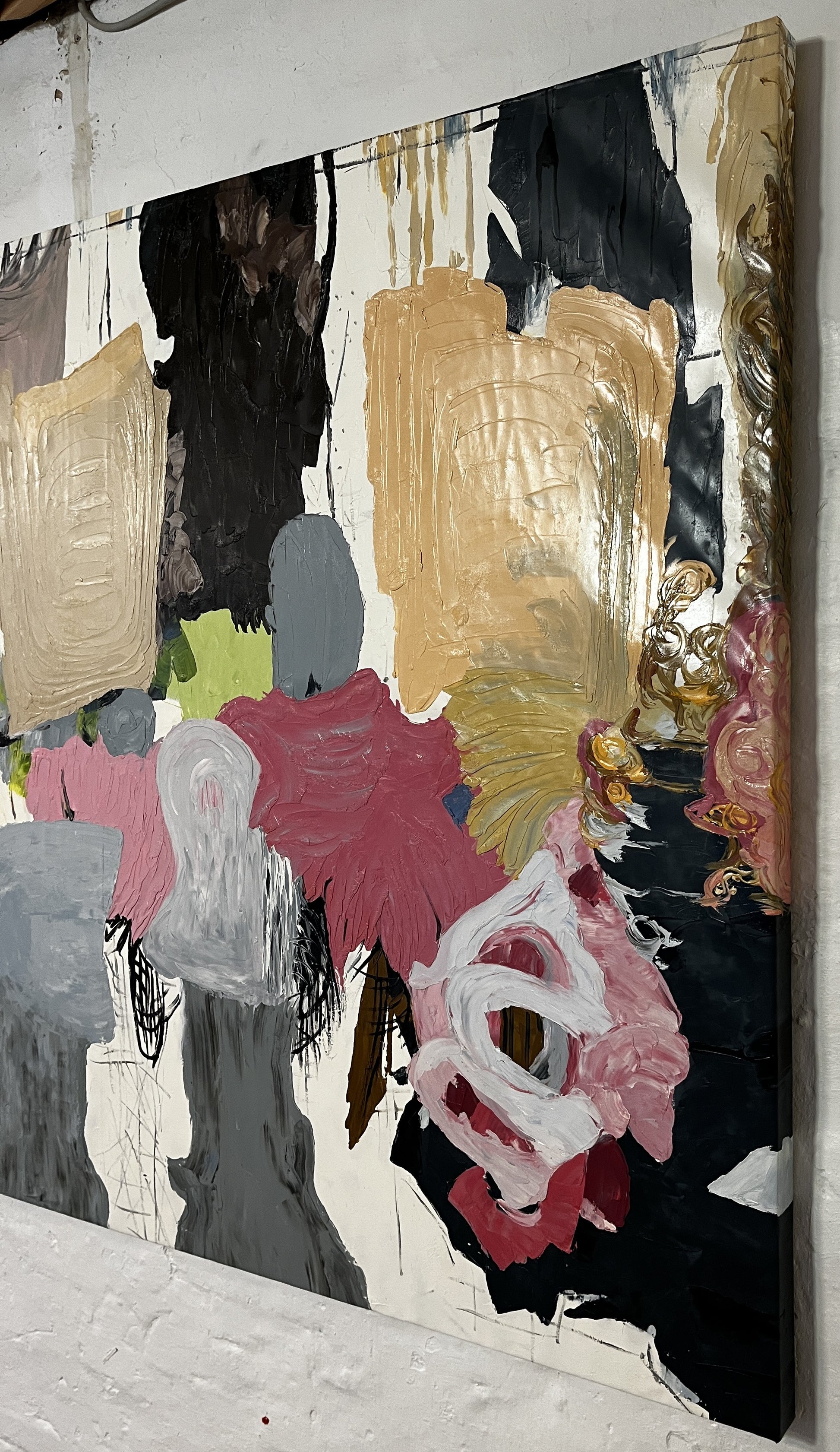 Dette værk har en mere blød, næsten poetisk energi, hvor de dæmpede jordfarver blandes med kraftige pink og rosa elementer. Man fornemmer en dekonstruktion af blomster eller ornamenter, som var de minder, fanget i en ny, rå sammenhæng.