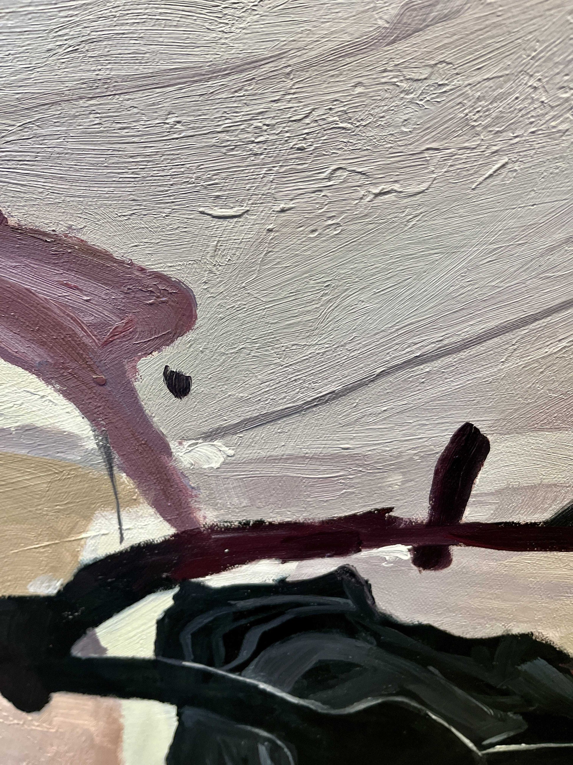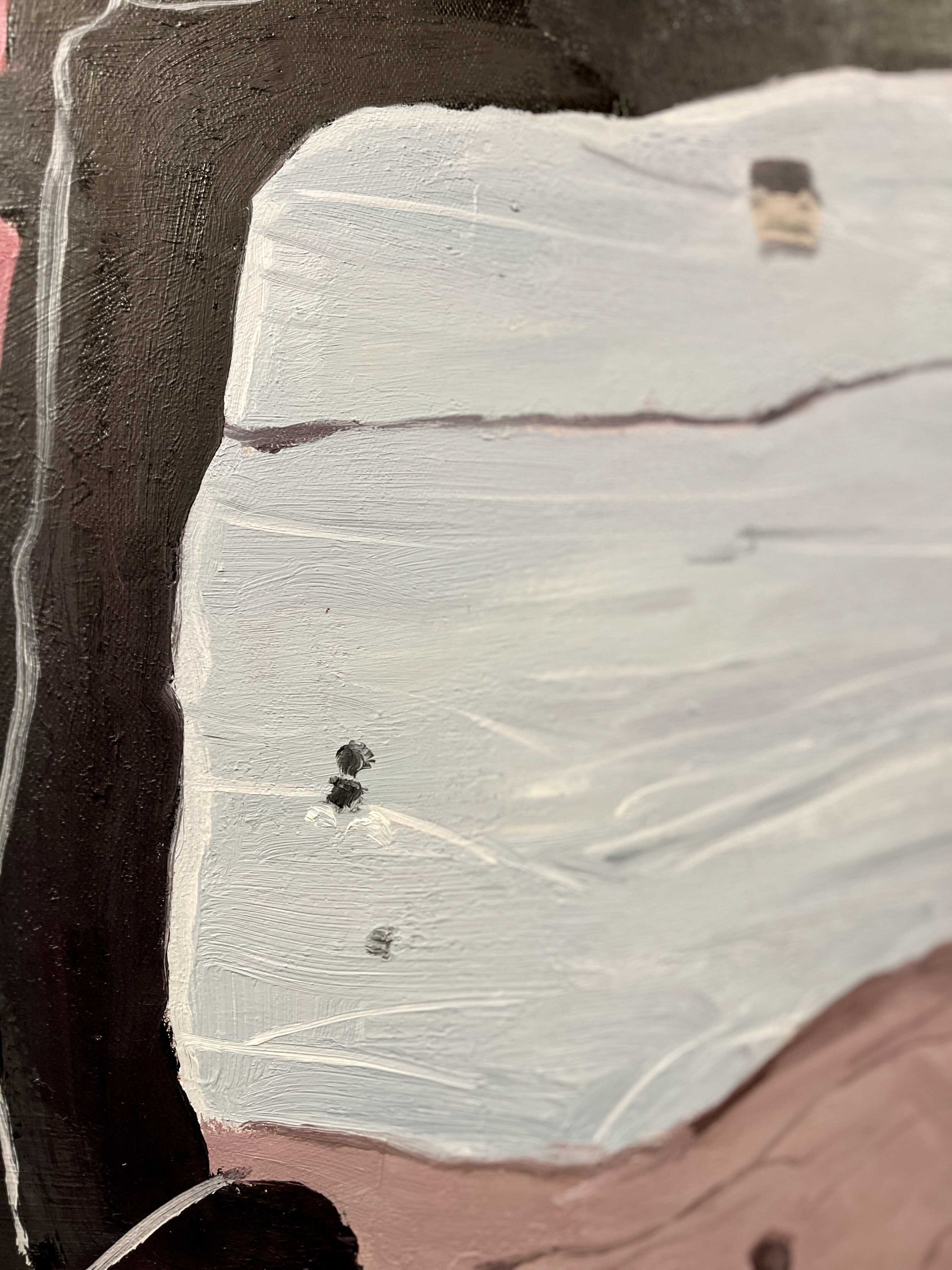 Store flader og dryppende gestus skaber en følelse af vægt og langsom bevægelse. Som spor efter noget, der engang var i bevægelse – og stadig hænger i rummet.