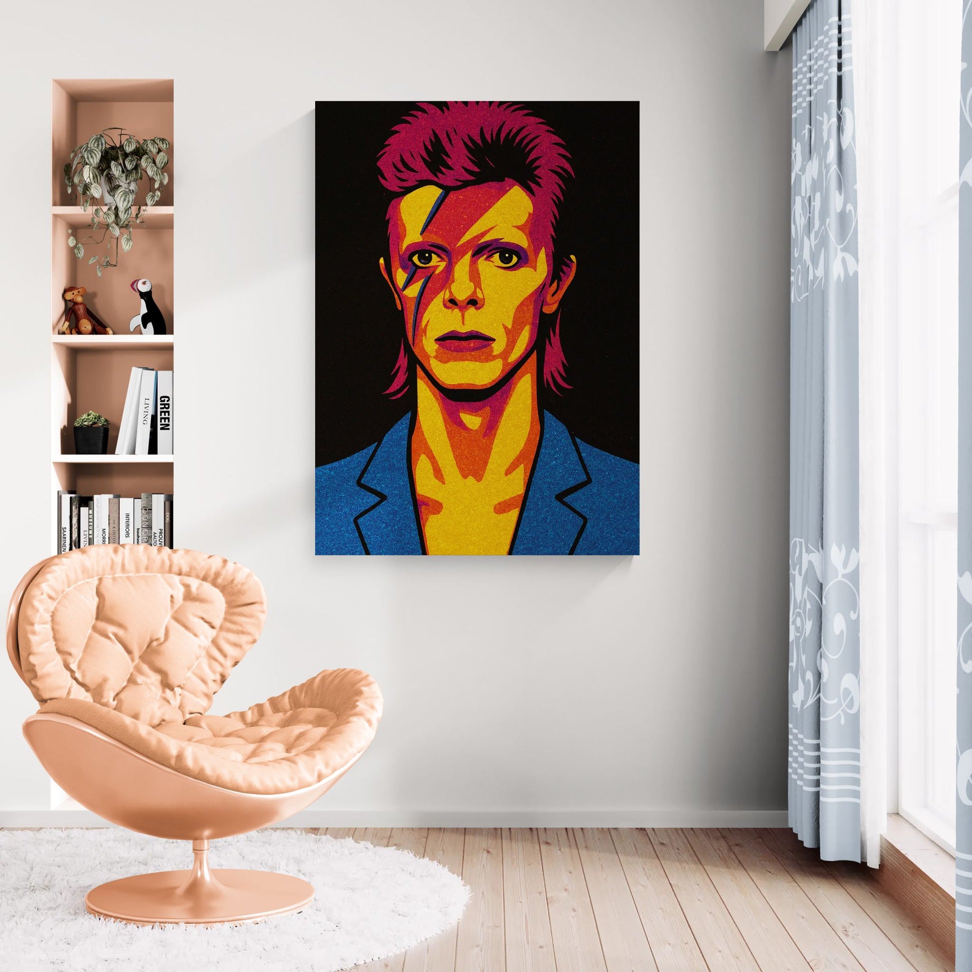 Værket er udført med en skinnende overflade af diamantstøv, der fanger lyset og giver motivet en levende, nærmest kosmisk glød. Den glitrende effekt forstærker kontrasterne og gør billedet til en sanselig oplevelse, hvor popkultur møder stjernestøv.