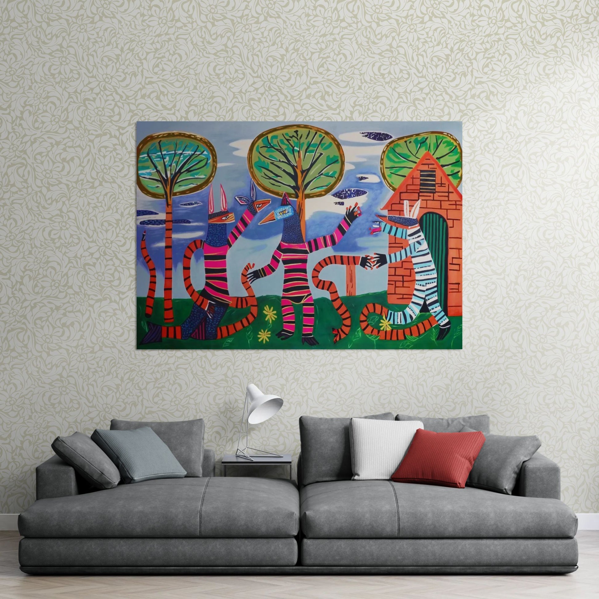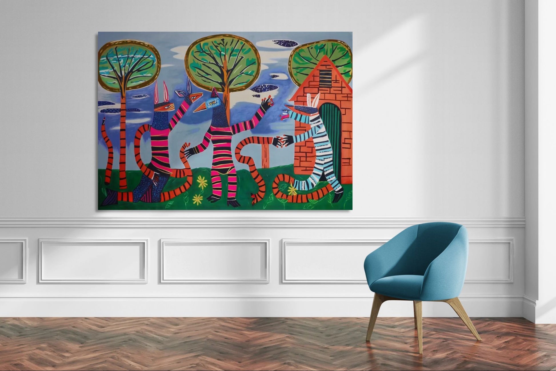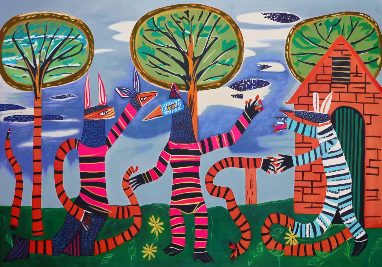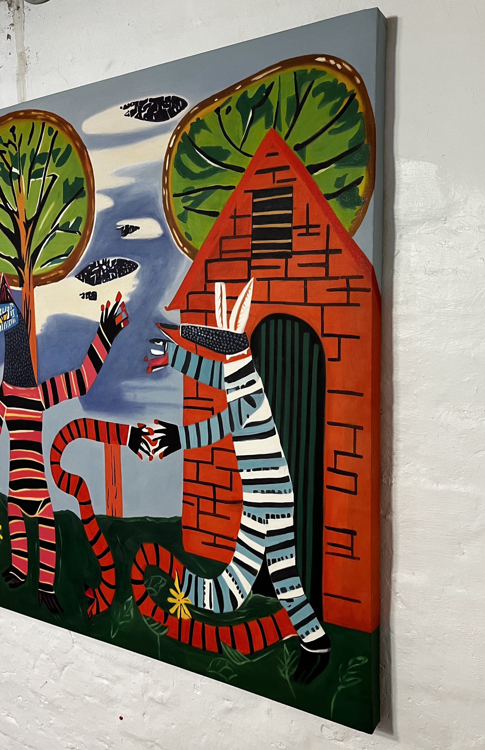En gruppe stribede væsener samler sig foran et hus med røde mursten, mens én skikkelse strækker hænderne ud fra dørtærsklen. Deres kroppe slynger sig med lange haler, der fletter sig ind mellem blomster og græs. Træerne danner et scenisk tag, og himlen fyldes af mørke, fuglelignende skyer.
