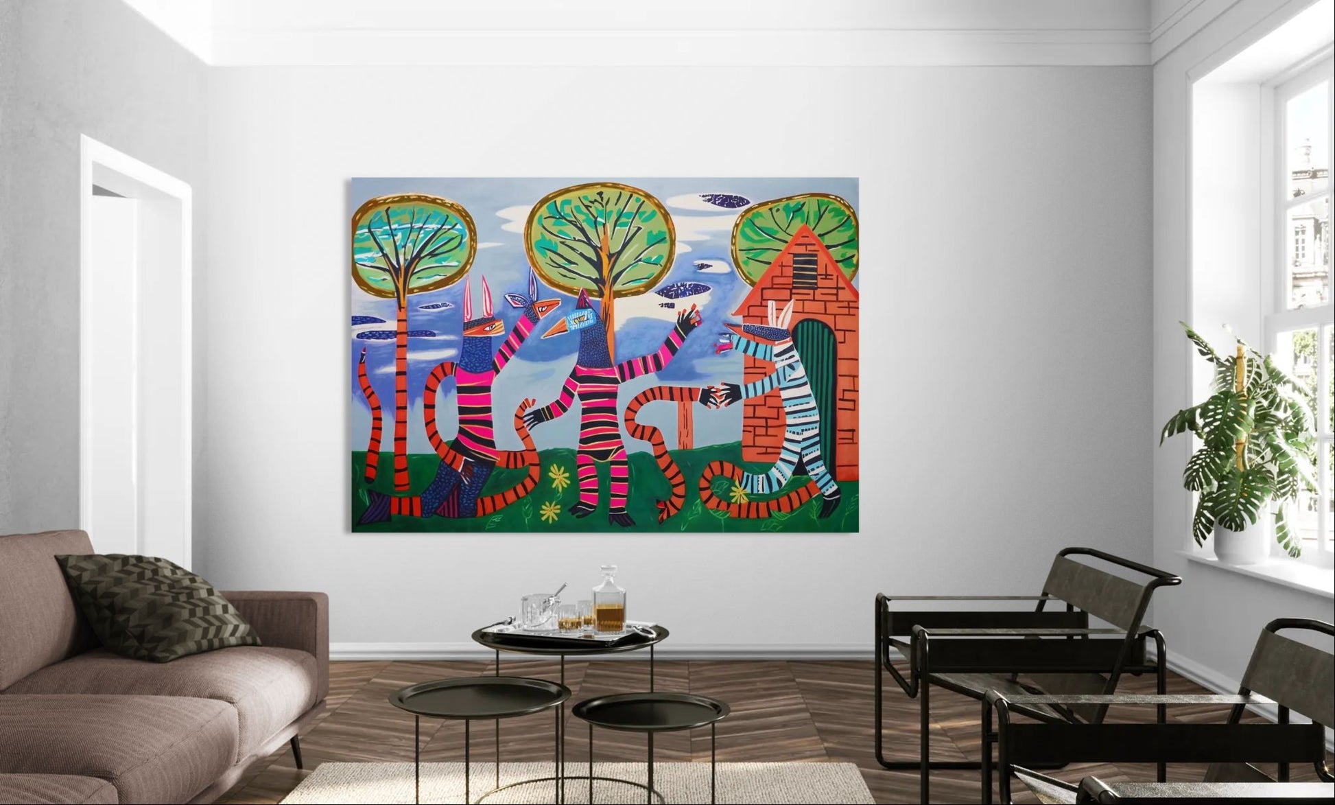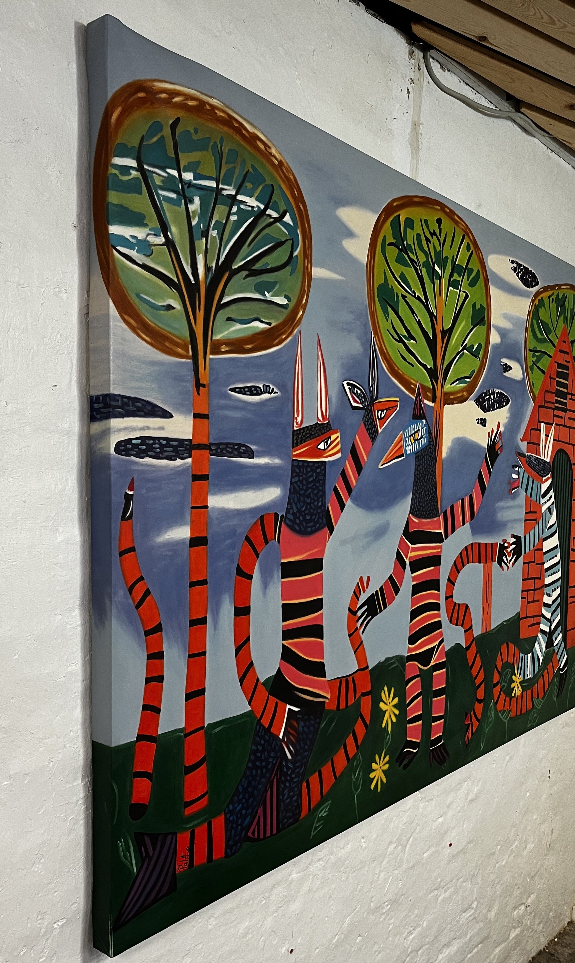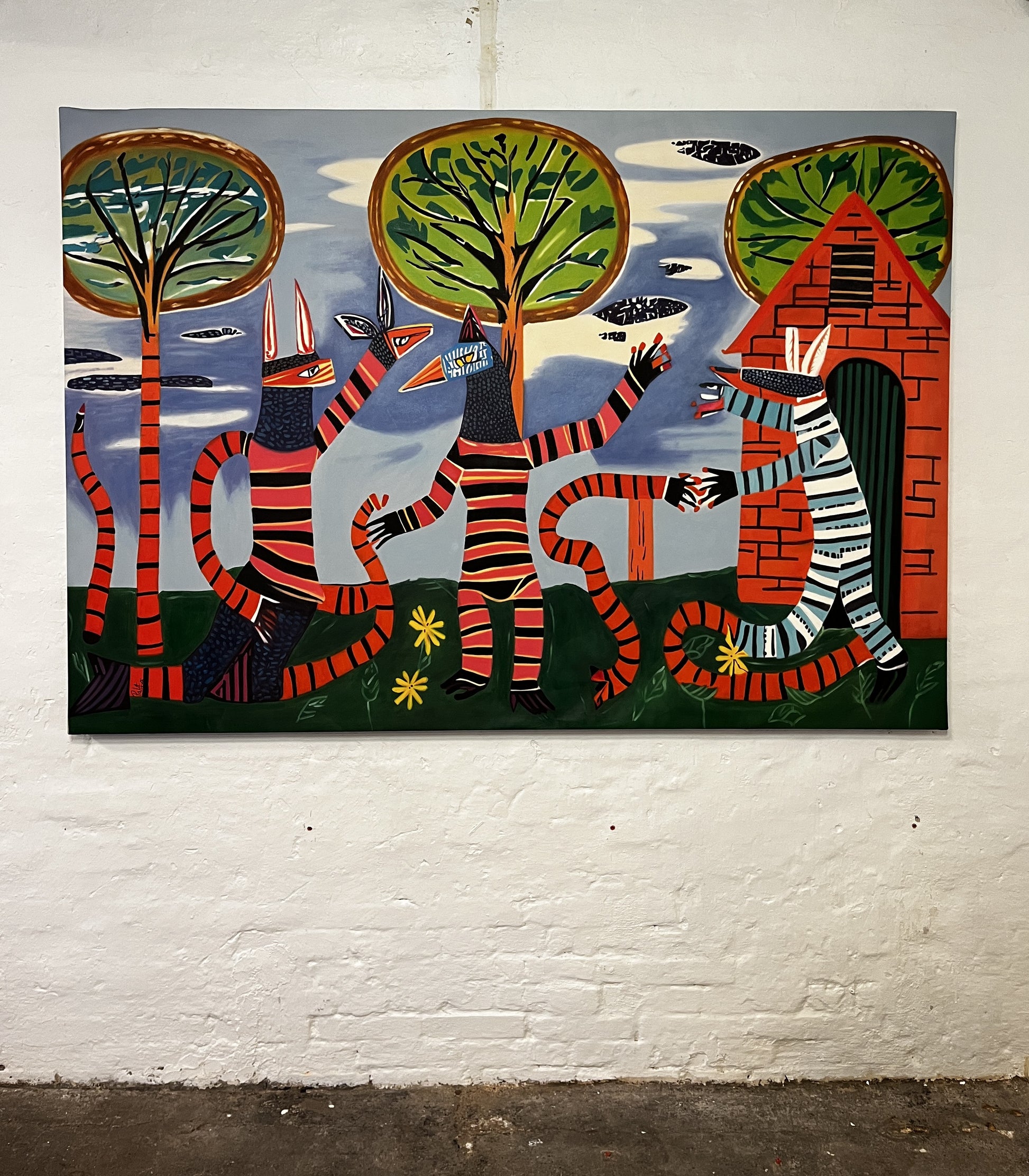 En gruppe stribede væsener samler sig foran et hus med røde mursten, mens én skikkelse strækker hænderne ud fra dørtærsklen. Deres kroppe slynger sig med lange haler, der fletter sig ind mellem blomster og græs. Træerne danner et scenisk tag, og himlen fyldes af mørke, fuglelignende skyer.