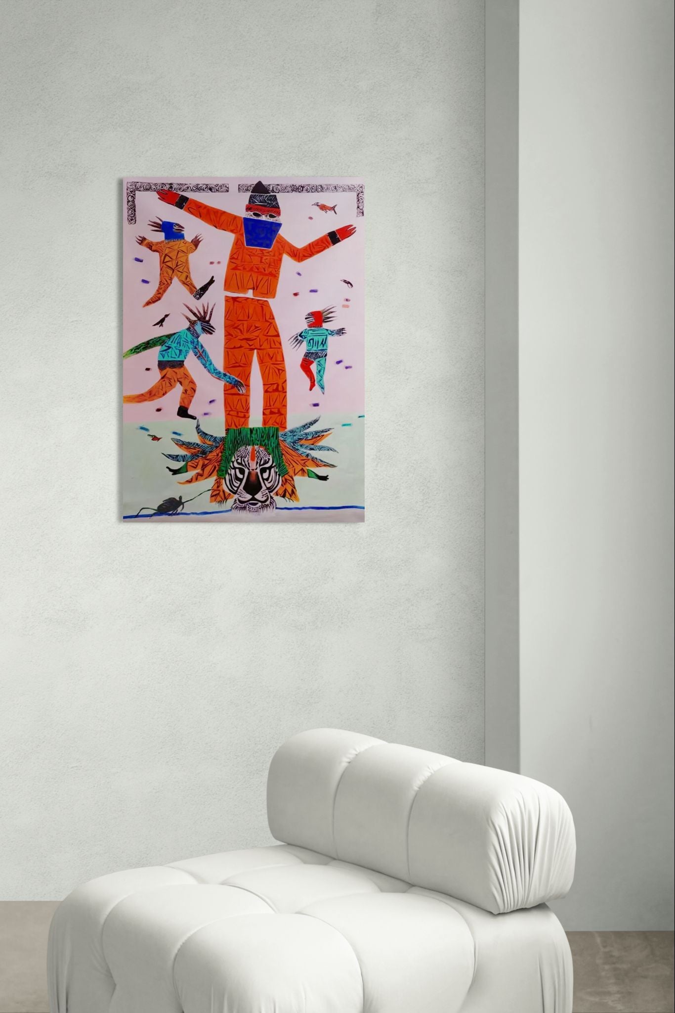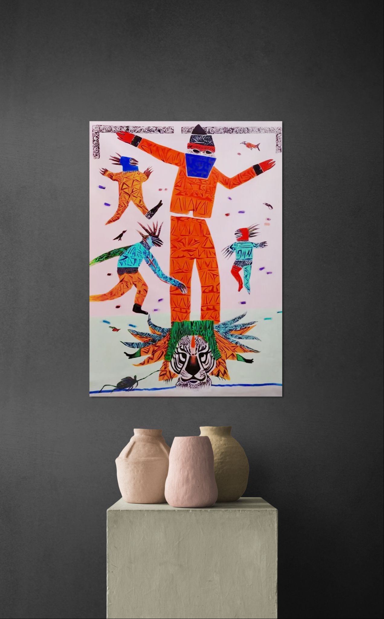 En kæmpefigur i orange står med armene spredt, omgivet af mindre dansende skikkelser. Under ham ses et tigerhoved, som om hele vægten hviler på dyrets styrke. Det er et billede af balance og magt, men også af fest og kollektiv energi. De små figurer virker som ånder eller hjælpere, der understøtter hovedscenen.