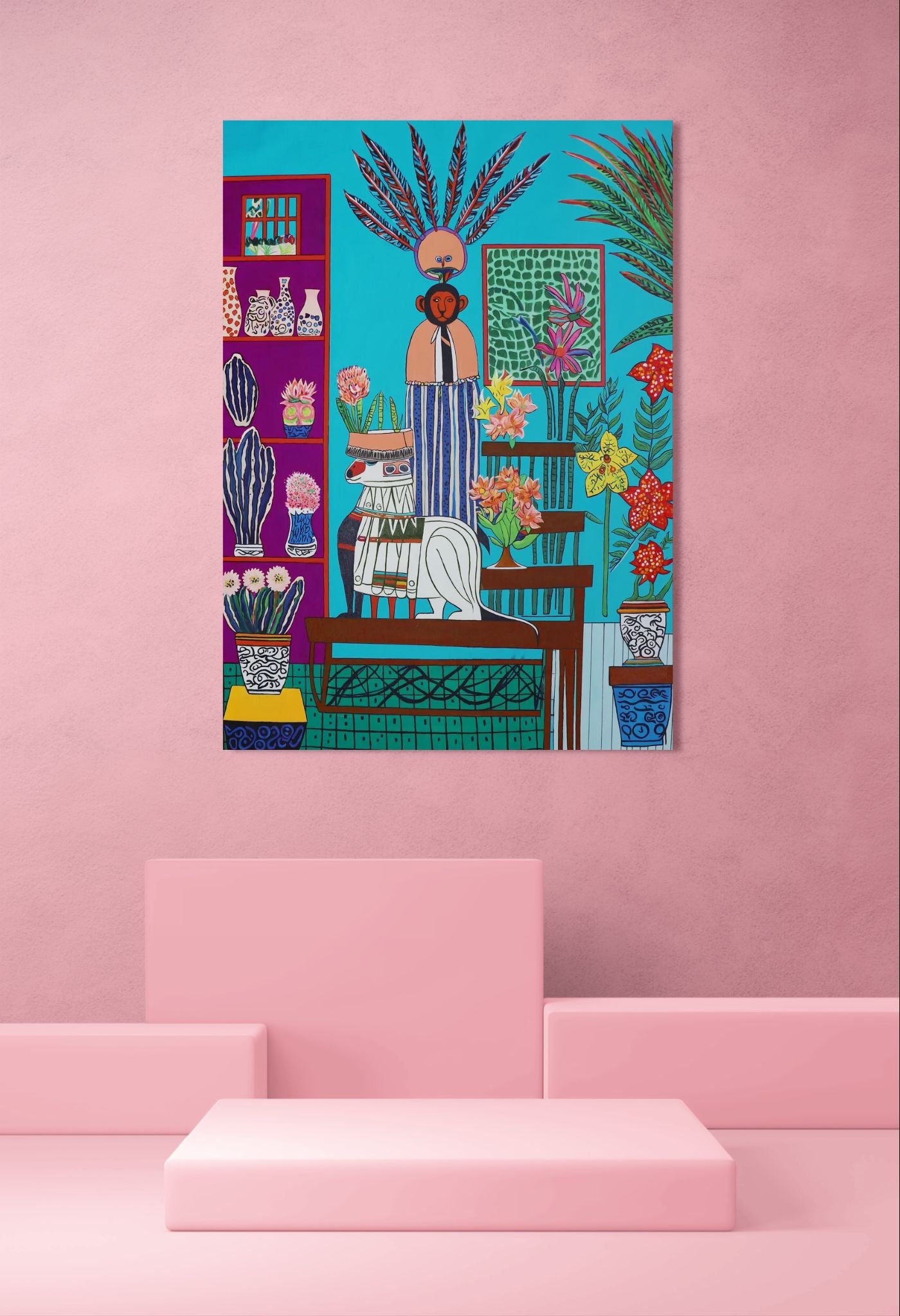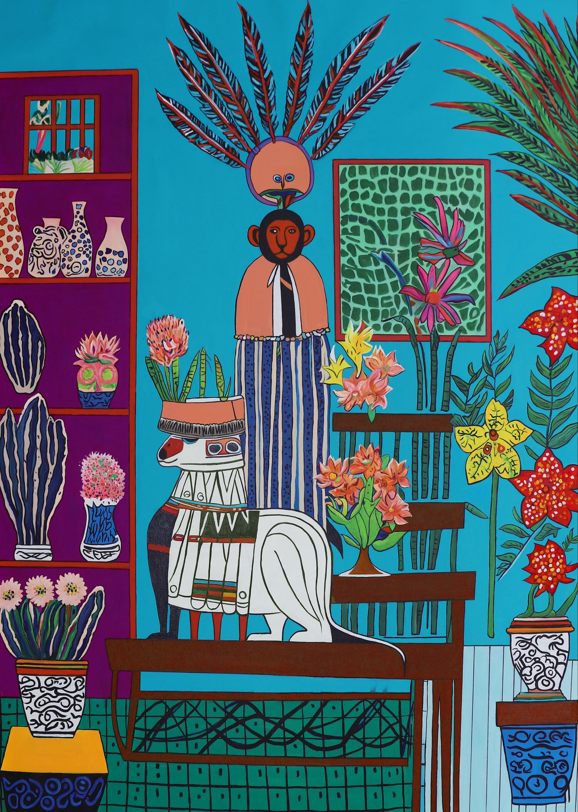 Et andet botanisk univers folder sig ud, men denne gang ledsages figuren af en hvid, hundelignende skikkelse, der selv bærer blomster i en krukke på hovedet. Bag dem rejser sig hylder med vaser, mønstre og blomster i overflod. Figurerne er både del af interiøret og fremmede i det, som maskerede væsener på besøg i en have af ornamenter.