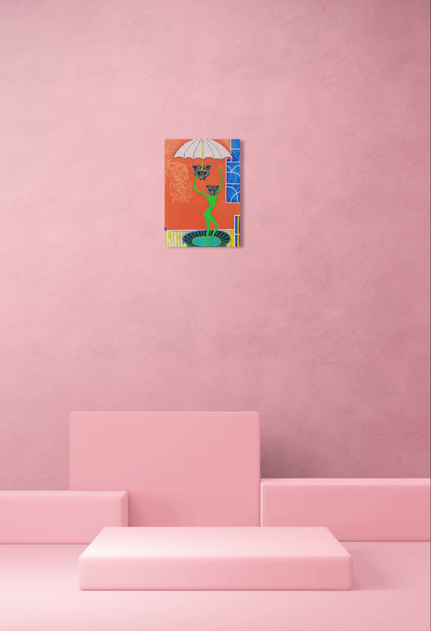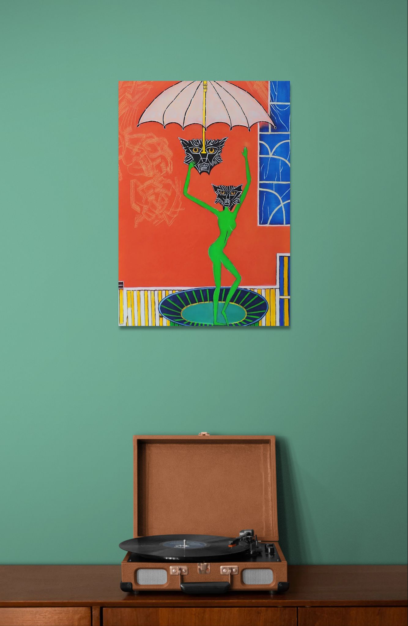En grøn figur danser yndefuldt under en parasol, men ansigtet er erstattet af en kattemaske – faktisk to, for den ene holdes i hånden og hæves mod himlen. Rummet omkring er teatralsk: røde vægge, blå vindue, gulv i striber. Figuren bliver en slags karnevalskarakter, fanget i en leg, hvor identiteten konstant skiftes.