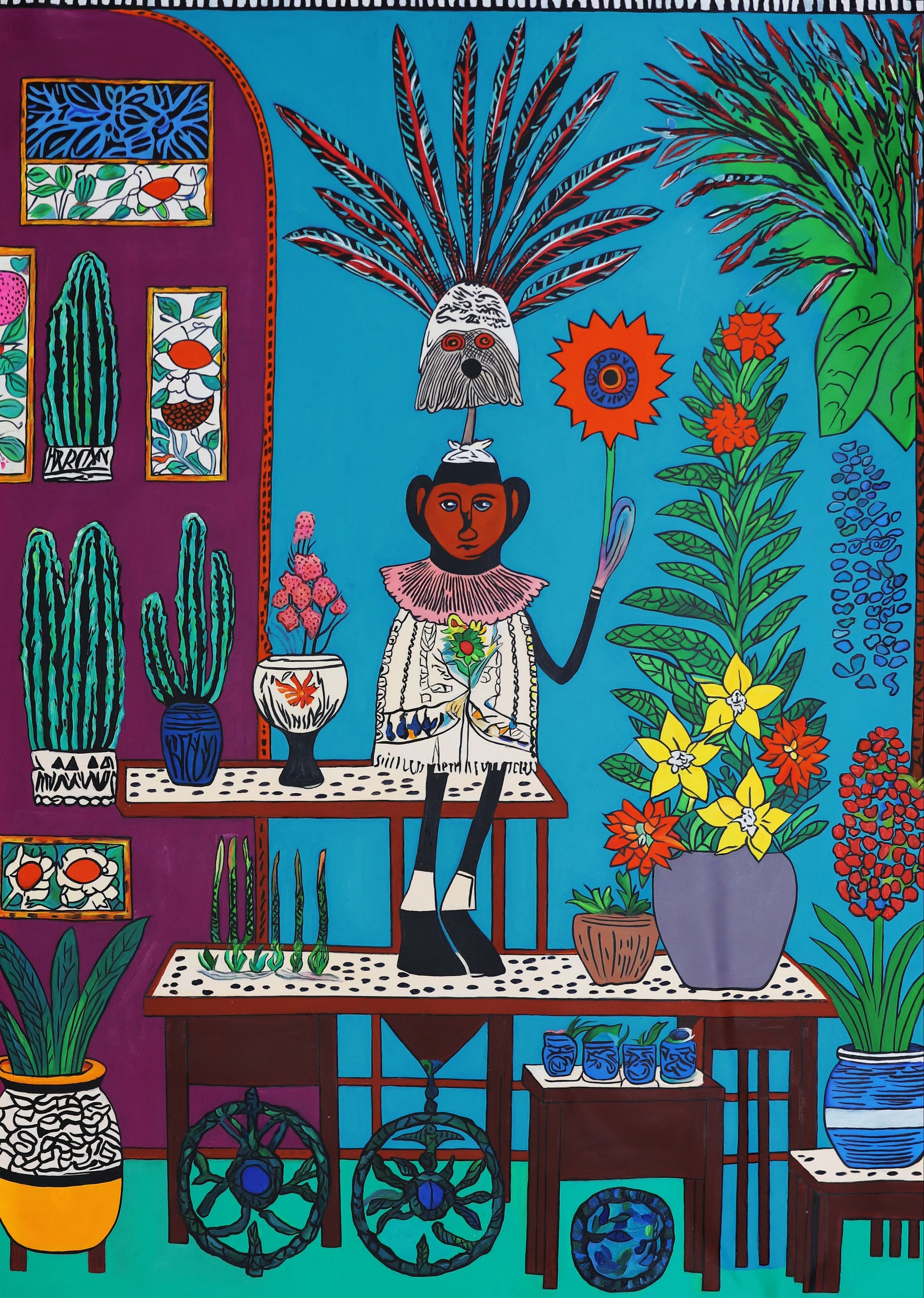 I et rum fyldt med planter og farverige krukker står en figur med abehoved og fjerpragt på toppen. Han holder en blomst som en fakkel, omgivet af potter, mønstre og dekorative detaljer. Værket er som et tempel af vækst og symbolik, hvor planterne er lige så vigtige som figuren selv. Farvespillet mellem turkis og lilla skaber en vibrerende kontrast.