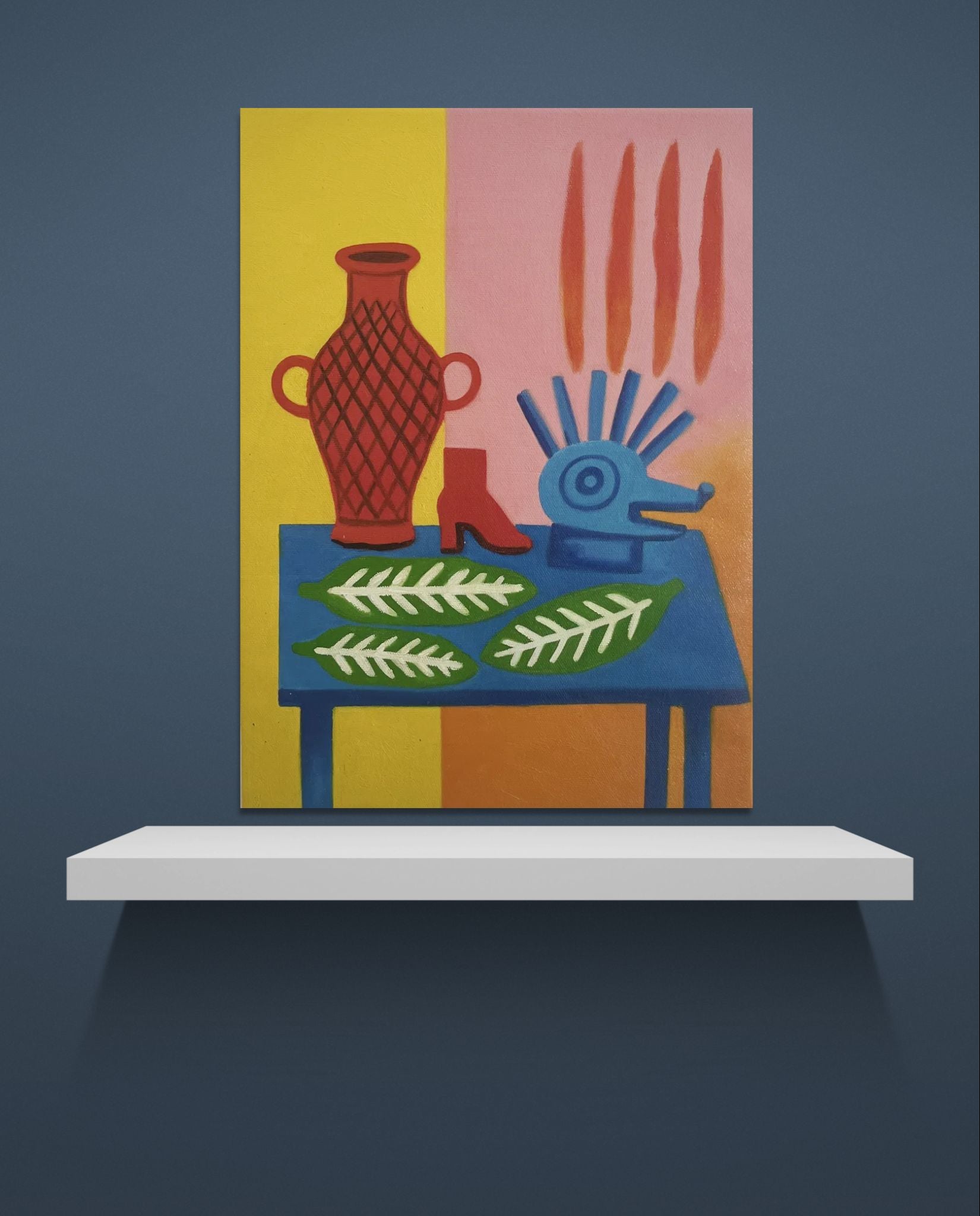 I dette farvestrålende stilleben sammensætter Palæ en række ikoniske objekter – en rød keramikkrukke, en højhælet støvle, fire blade og en blå, dyrelignende figur – i en nærmest rituel opstilling. Kompositionen balancerer mellem det arkaiske og det moderne, som var det en religiøs scene fra en fjern civilisation – blot filtreret gennem en Art Deco-lignende farvepalet.