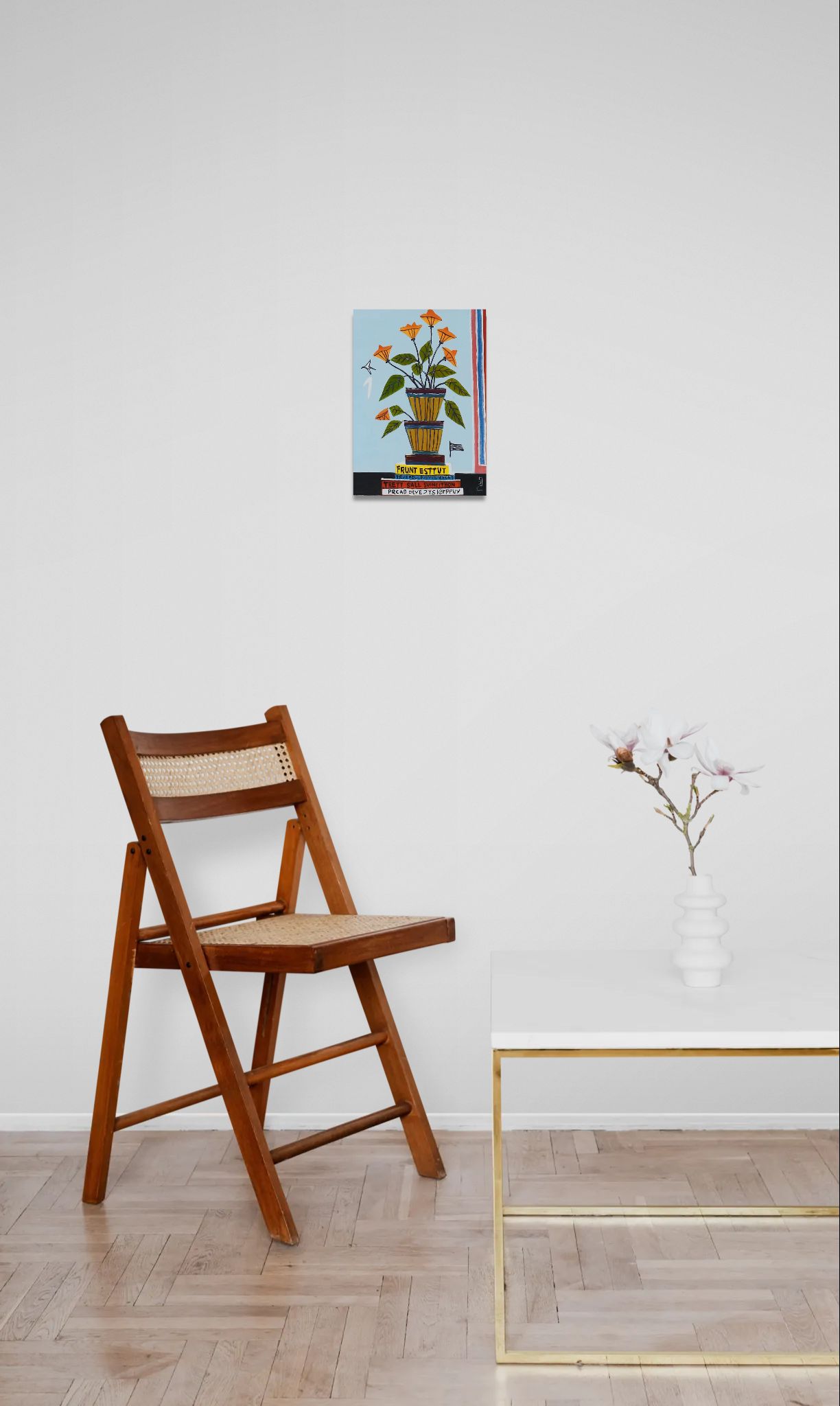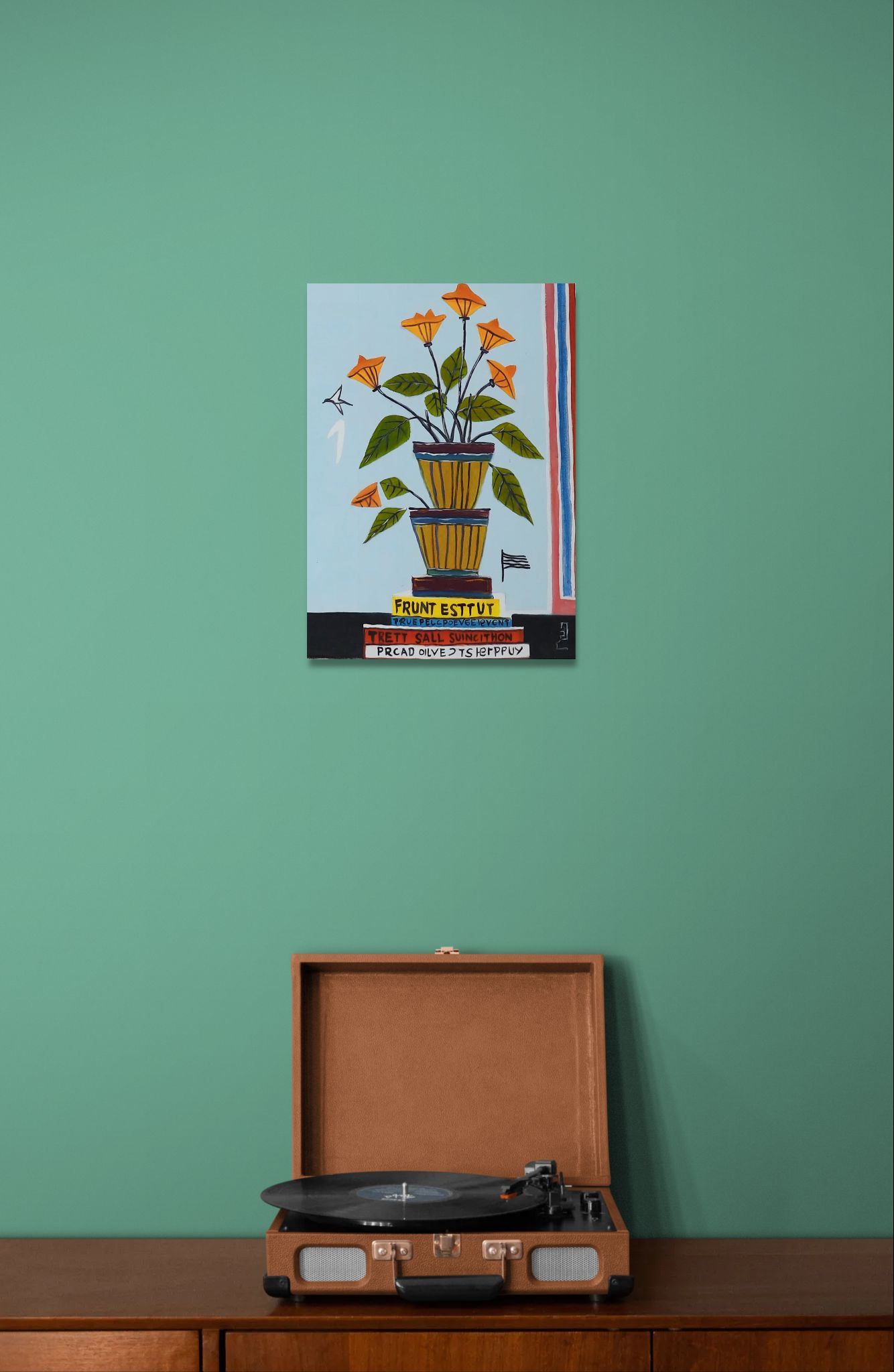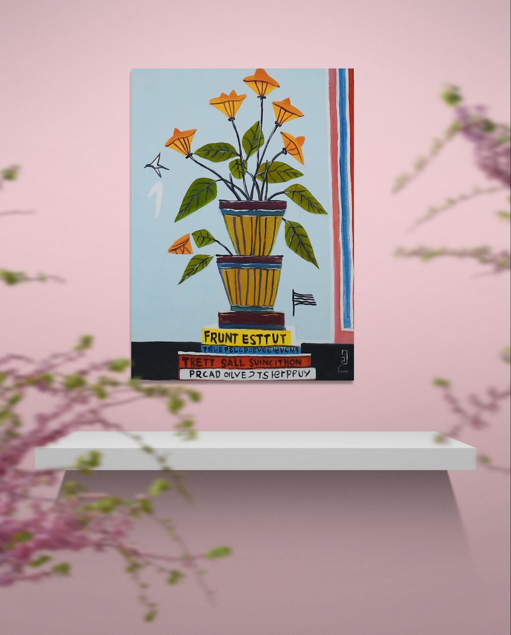 En potteplante rejser sig oven på en stak bøger, der bærer mærkelige, forskruede titler. Her mødes den klassiske idé om viden med noget helt barnligt og naivistisk: bogstaverne snubler, men alligevel bliver meningen klar – en hyldest til det uperfekte. Blomsterne i toppen er enkle og skarpt afgrænsede, mens baggrunden i blå og en lille fugl giver billedet en lethed.