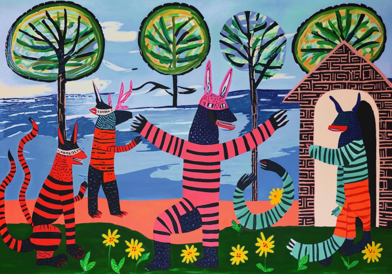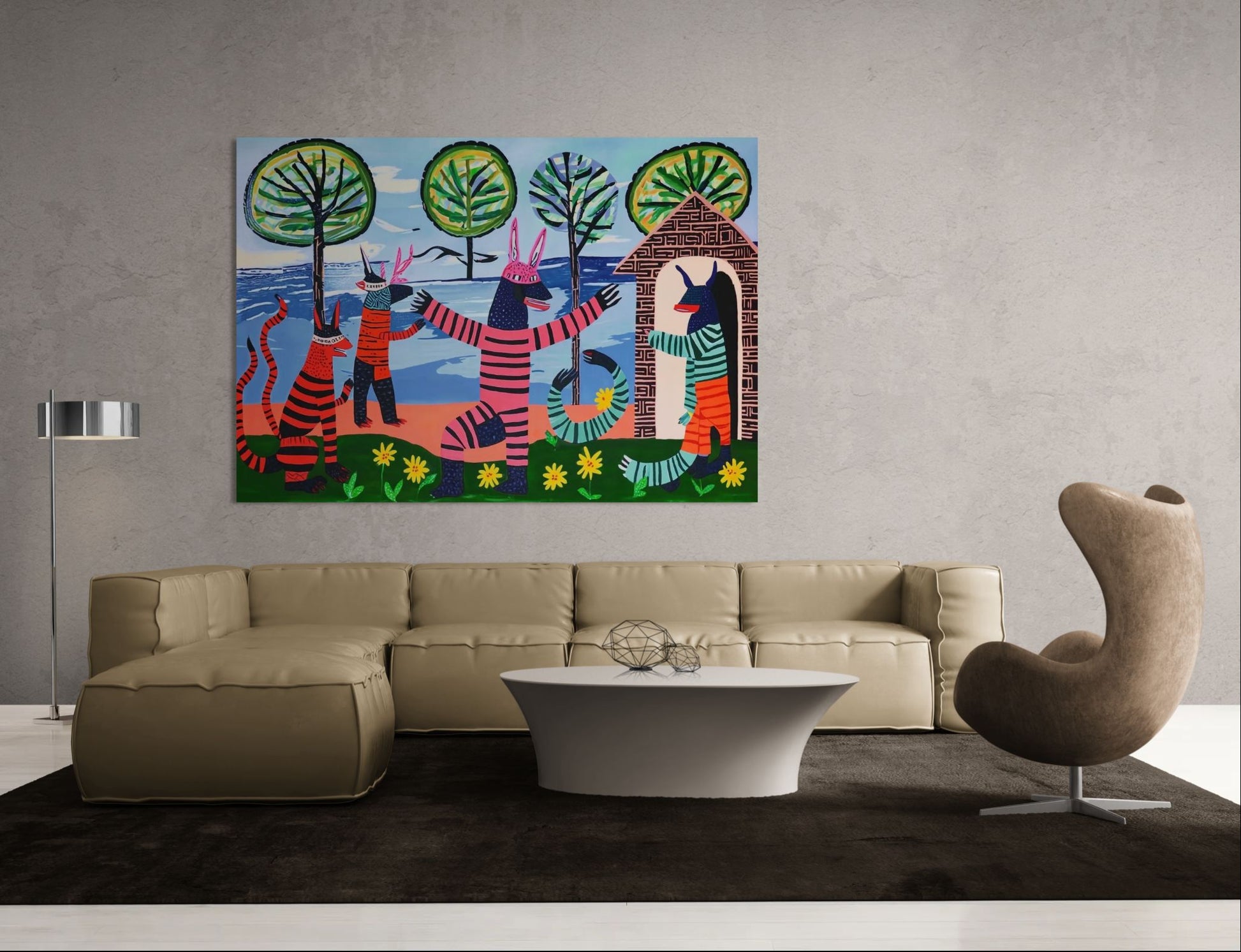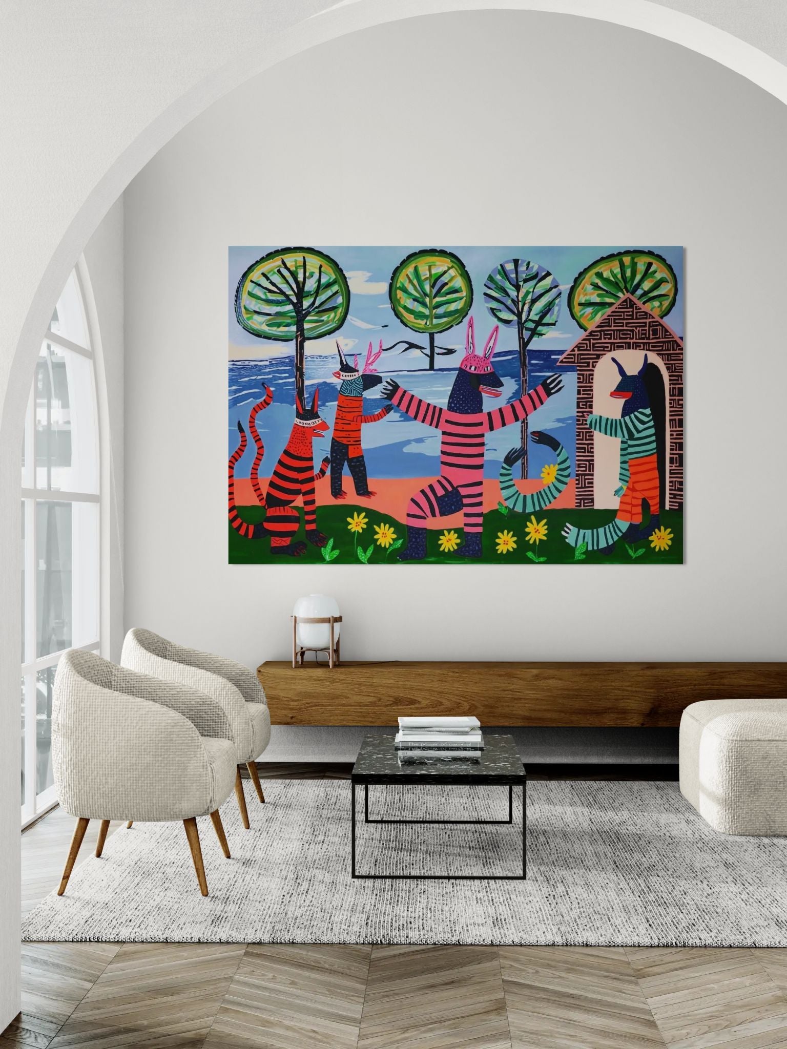 En samling skabninger mødes foran et hus ved vandet. Deres kroppe er stribede i rød, pink og grøn, og de kommunikerer med store armbevægelser og åbne hænder. Træerne bagved danner rytme, som gentagne symboler i et eventyrunivers. Blomsterne i forgrunden lyser op som små sole og understreger stemningen af fællesskab og ceremoni.
