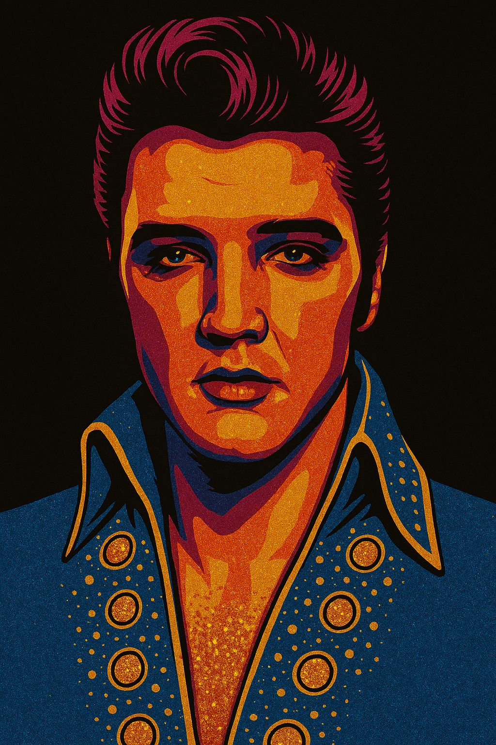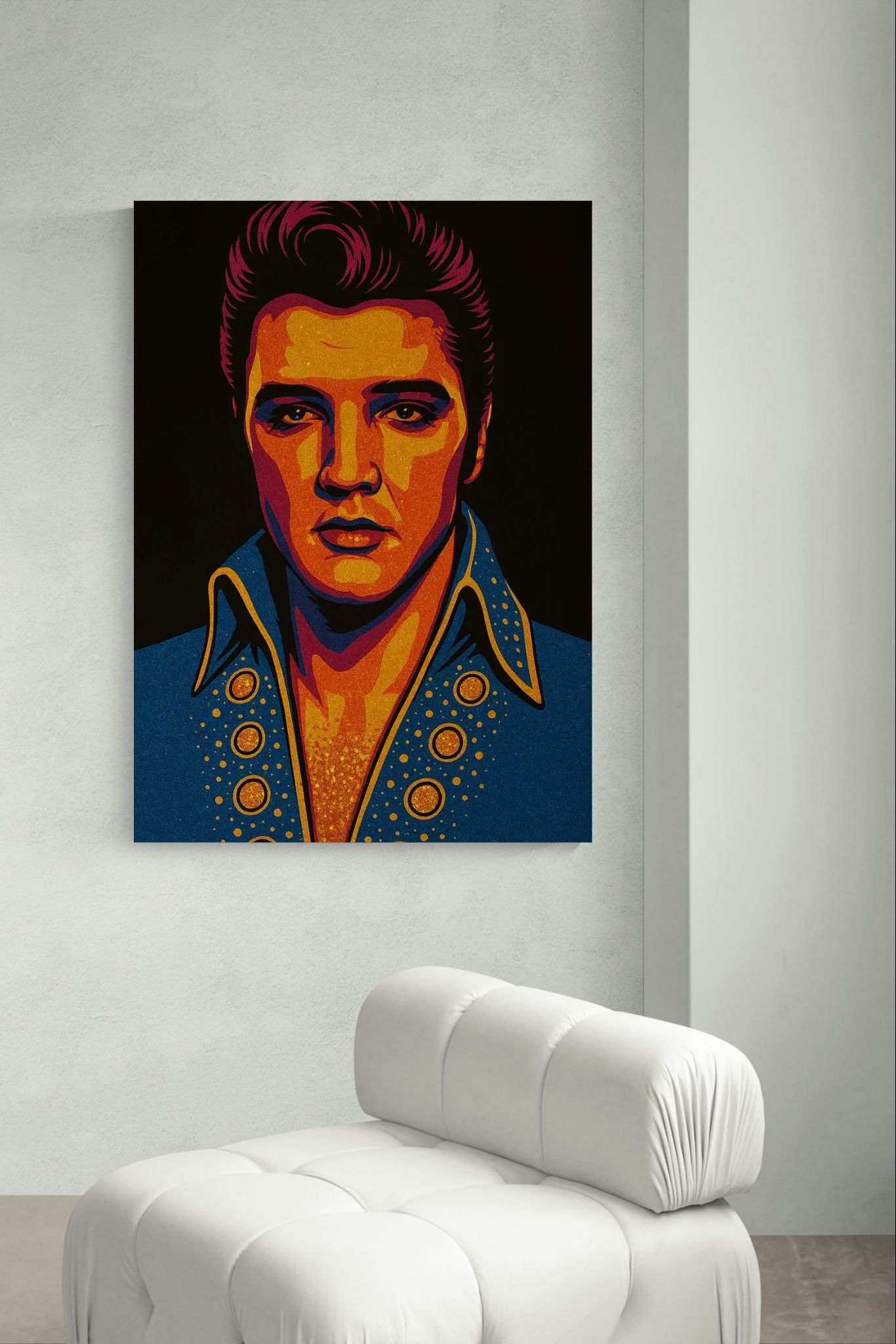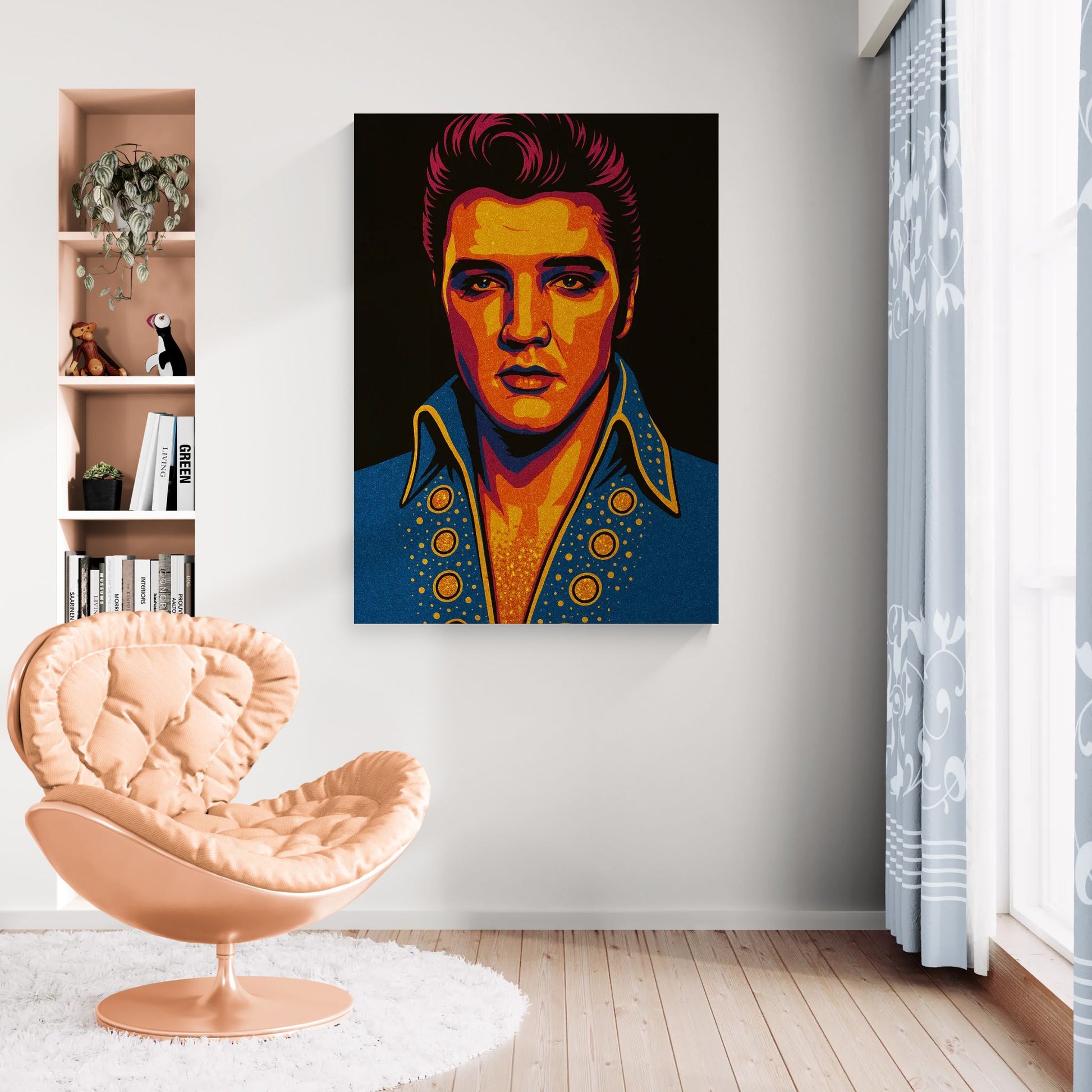 Et ikonisk portræt i varme nuancer og kølige skygger. Den blå dragt og gyldne glød fremhæver en tidløs karisma. Diamantstøvet giver værket en stjernestøvslignende tekstur.