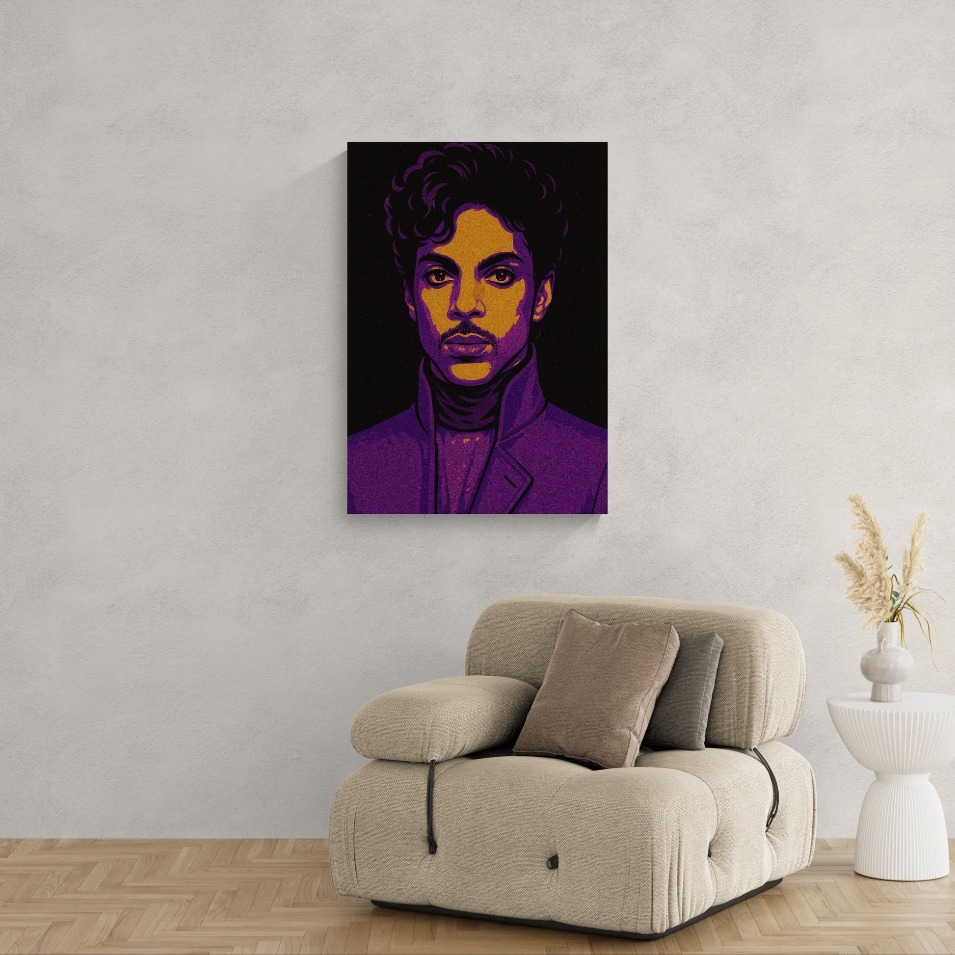 Et intenst portræt badet i nuancer af guld og dyb violet. Blikket balancerer mellem styrke og mystik, mellem kontrol og følelse. Diamantstøvet giver værket en levende overflade, der gløder som lys på fløjl.