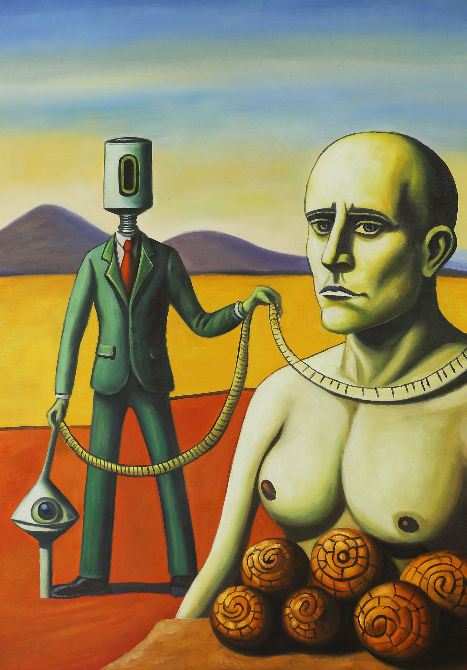 En figur i jakkesæt med en mekanisk cylinder som hoved holder et målebånd, der snor sig rundt om en nøgen krop. Kvinden i forgrunden bærer et udtryk af resignation, mens sneglelignende former ligger som tavse vidner til ritualet. Bagved strækker ørkenen sig uendeligt.