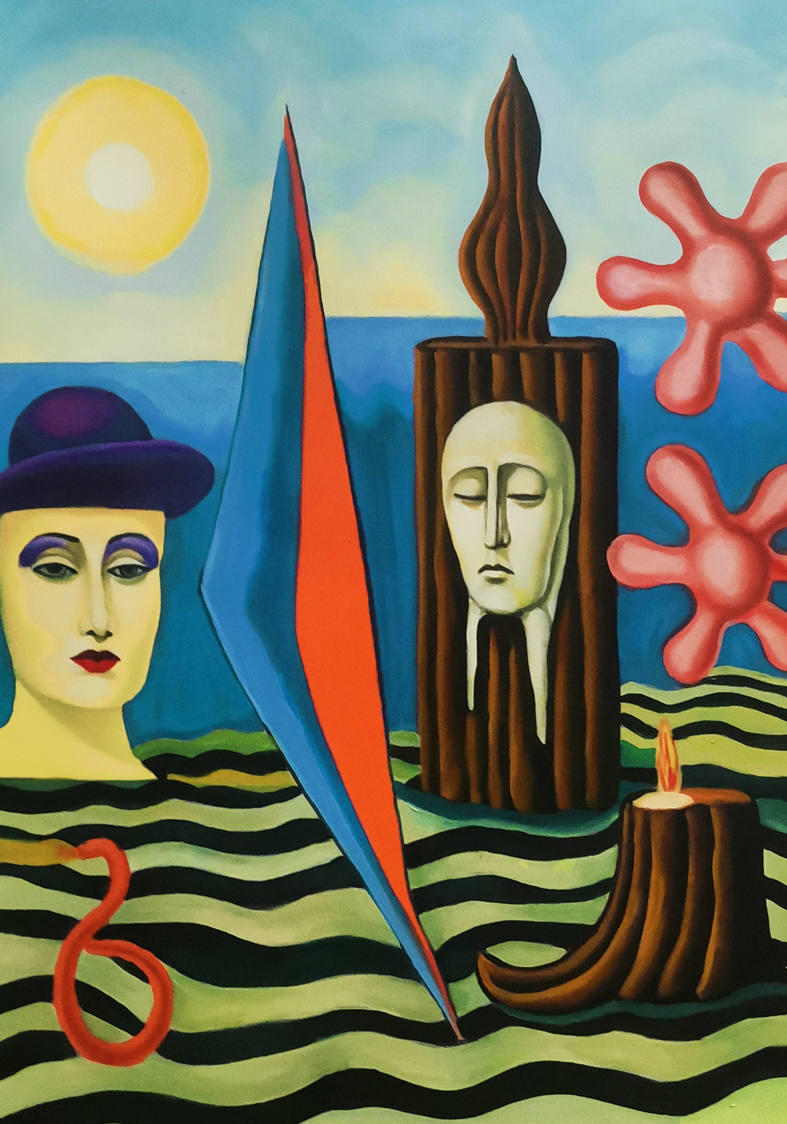 To ansigter, ét menneskeligt og ét hugget i træ dukker op i dette drømmelandskab. Solen skinner klart, men dens lys afslører mere end det skjuler. På havets sorte-bølge-striber står stammer, som både er lysestager og totempæle, med ansigter der ligner masker.
