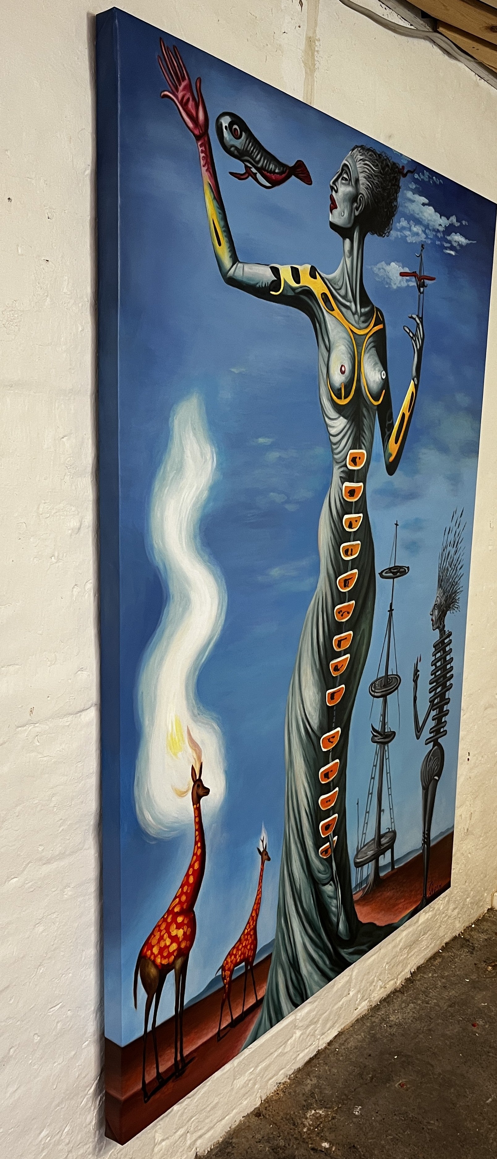 En kolossal kvindefigur rejser sig majestætisk mod himlen, kroppen perforeret af små aflange åbninger, som var hun et instrument eller et fartøj. På hendes arm balancerer en fisk, og i hendes hånd hviler et fly, mens bizarre figurer, en ribbenagtig skikkelse og flammende giraffer ledsager hende. Hun er både menneske og maskine, et alter for transformation og fremtidens evolution.